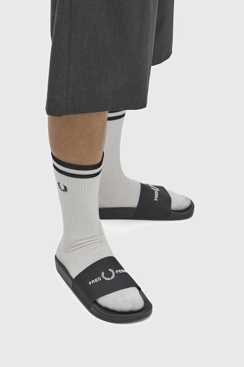 フロントにフレッドペリーのブランディングが施されたスライダーサンダル。脱ぎ履きしやすいスリッポン構造で、足を一日中快適に支える、クッション性のある軽量な仕上がりになっています。