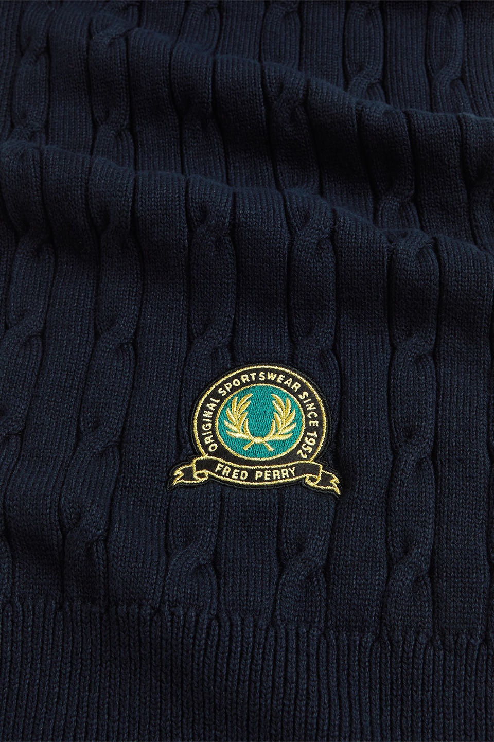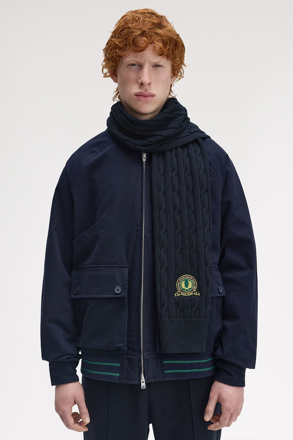 - ボリューム感があり、ふわっとしたコットンブレンドのケーブル編みマフラー。"Chosen by Champions"はリッチなテニスクラブのレジャーウェアをイメージし、1970年代のアーカイブのカタログから着想を得た特徴のあるブランディング刺繍を使用しています。