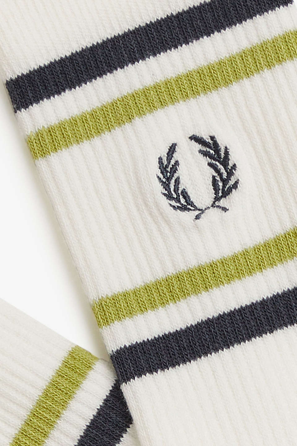 コットンブレンドの素材を使用したミドルソックス。ティップラインにフレッドペリーのシグニチャーであるローレルリースの刺繍があしらわれています。