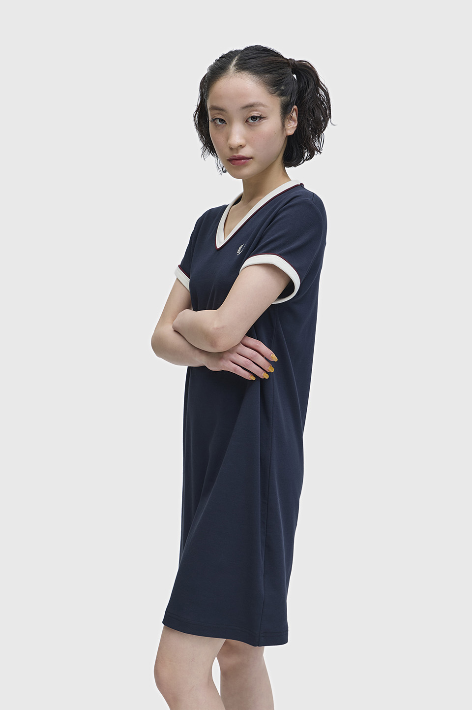 襟元と袖口のパイピングが特徴的なデザインワンピース。しっかりとした質感の天竺素材を使用しているので、1枚でも着用可能です。