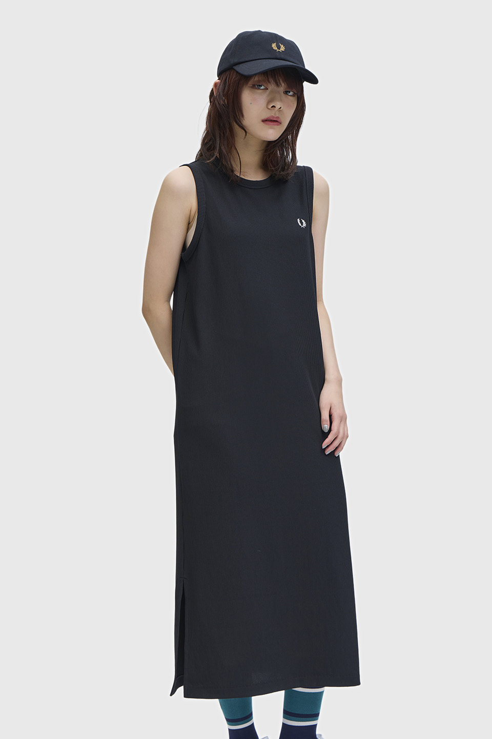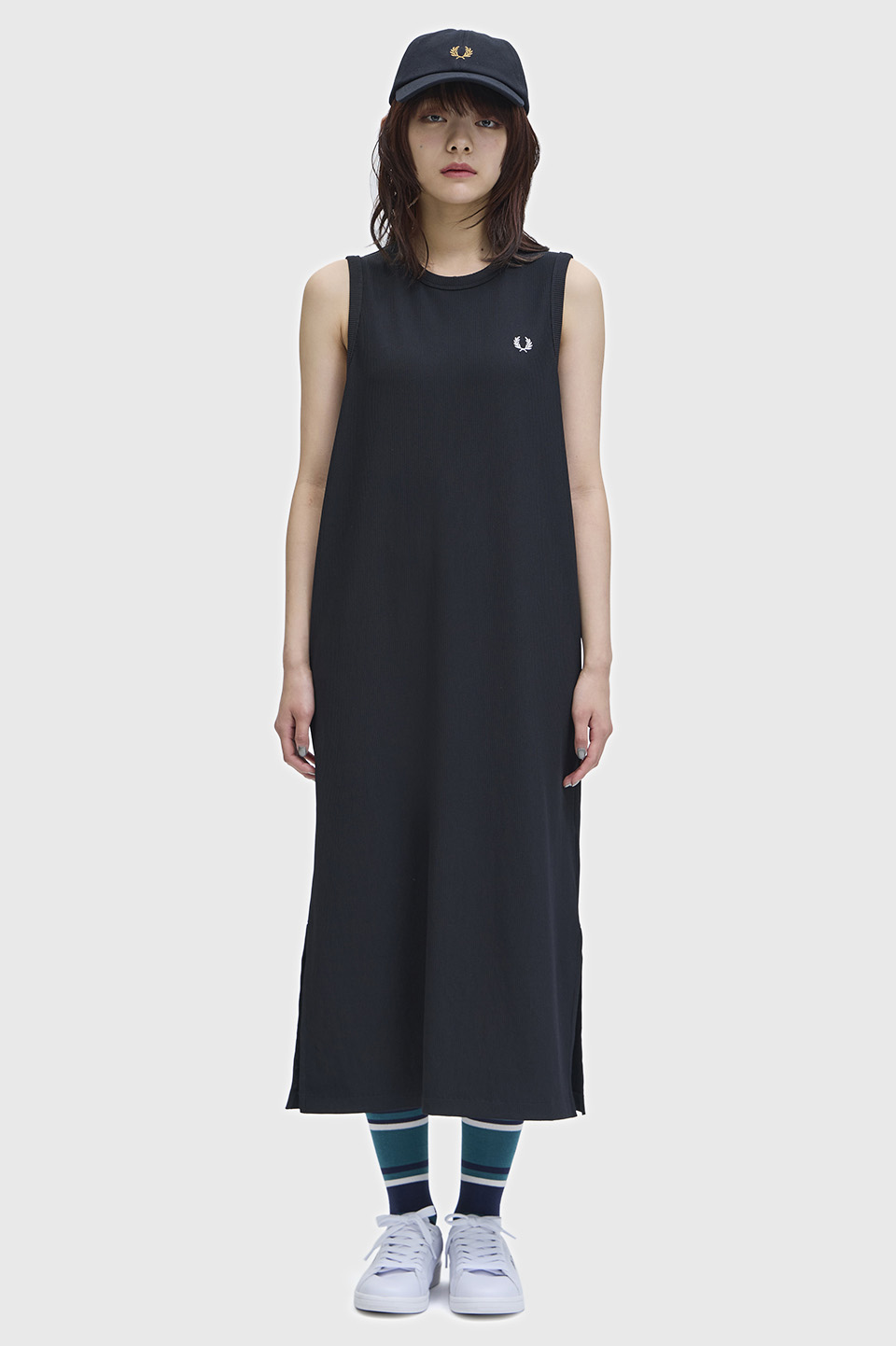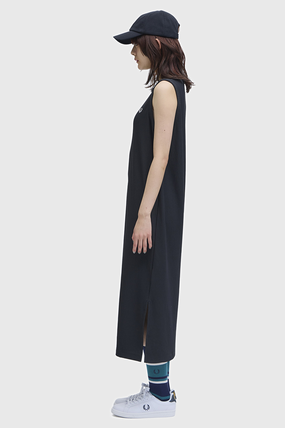 ストレッチ性のあるリブジャージー素材のノースリーブワンピース。襟元と袖ぐりは共布のパイピング仕様で、両サイドにはスリットが入っています。