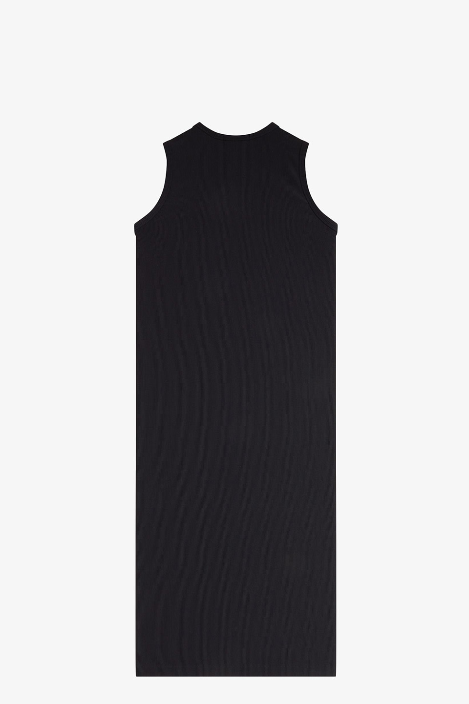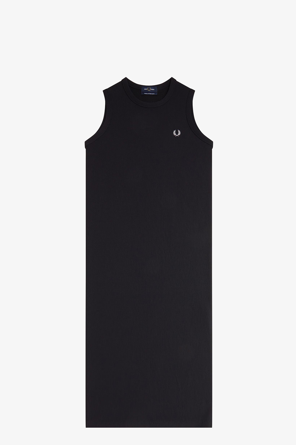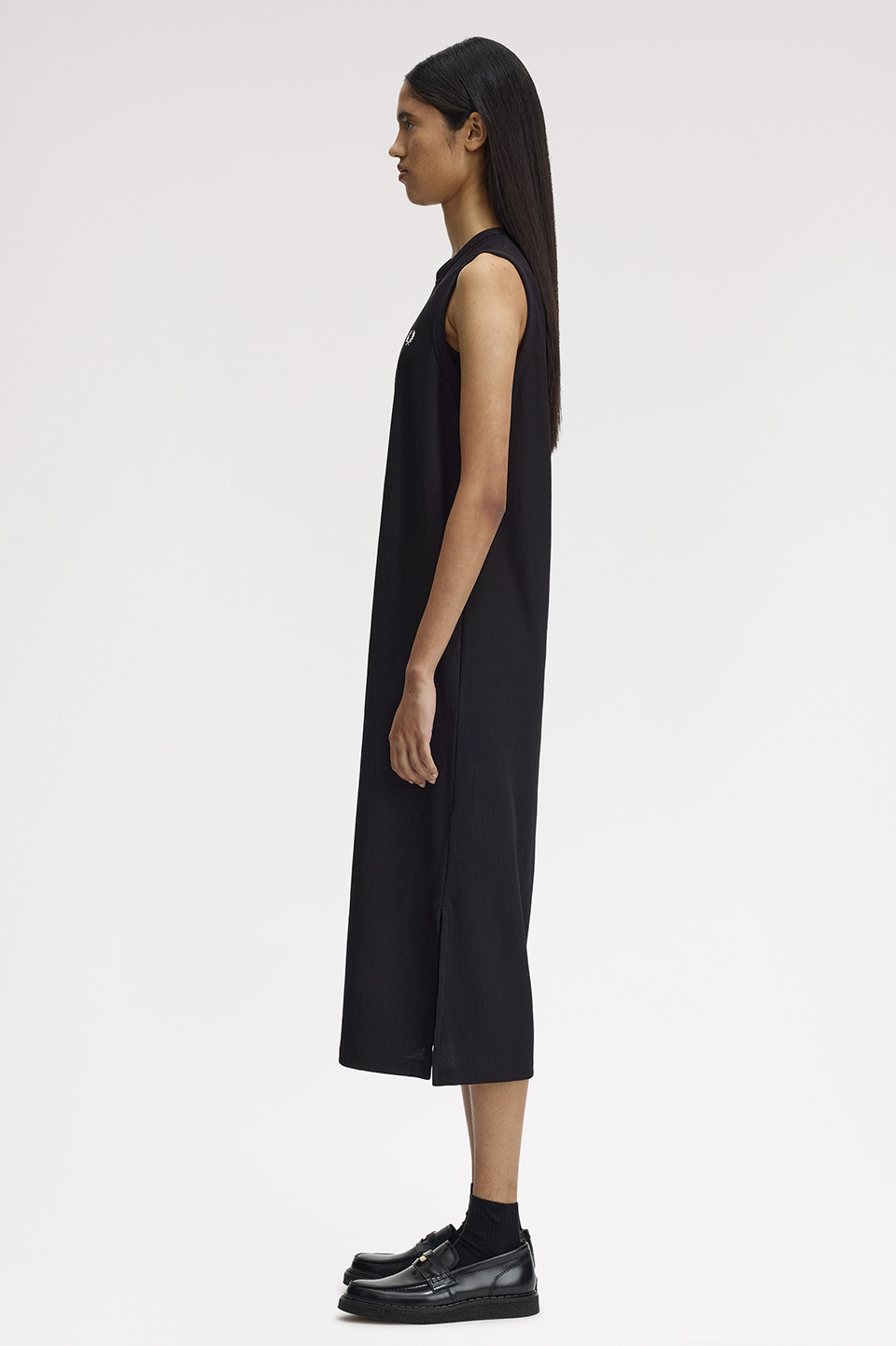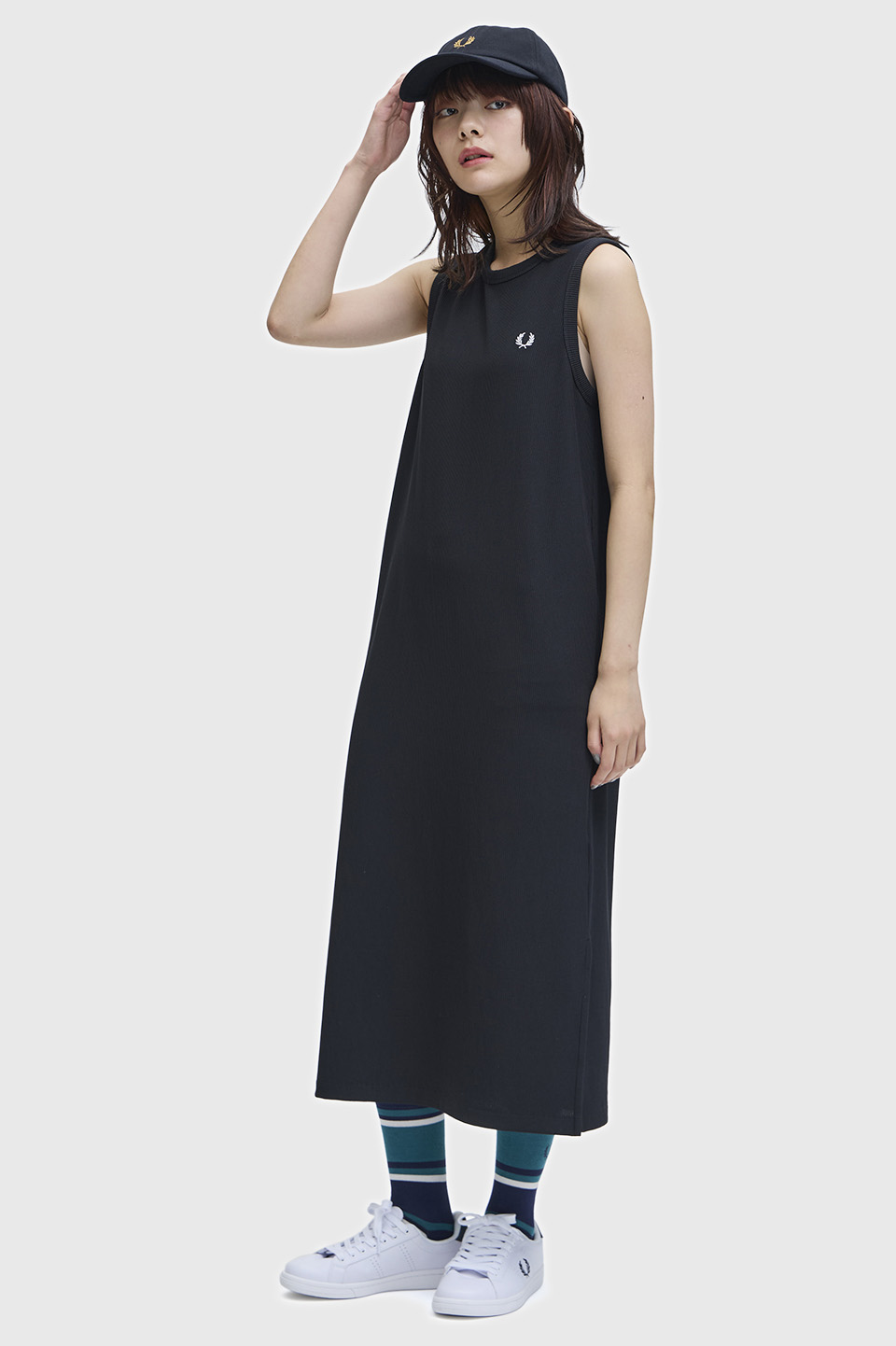 ストレッチ性のあるリブジャージー素材のノースリーブワンピース。襟元と袖ぐりは共布のパイピング仕様で、両サイドにはスリットが入っています。