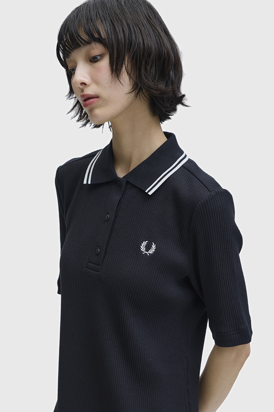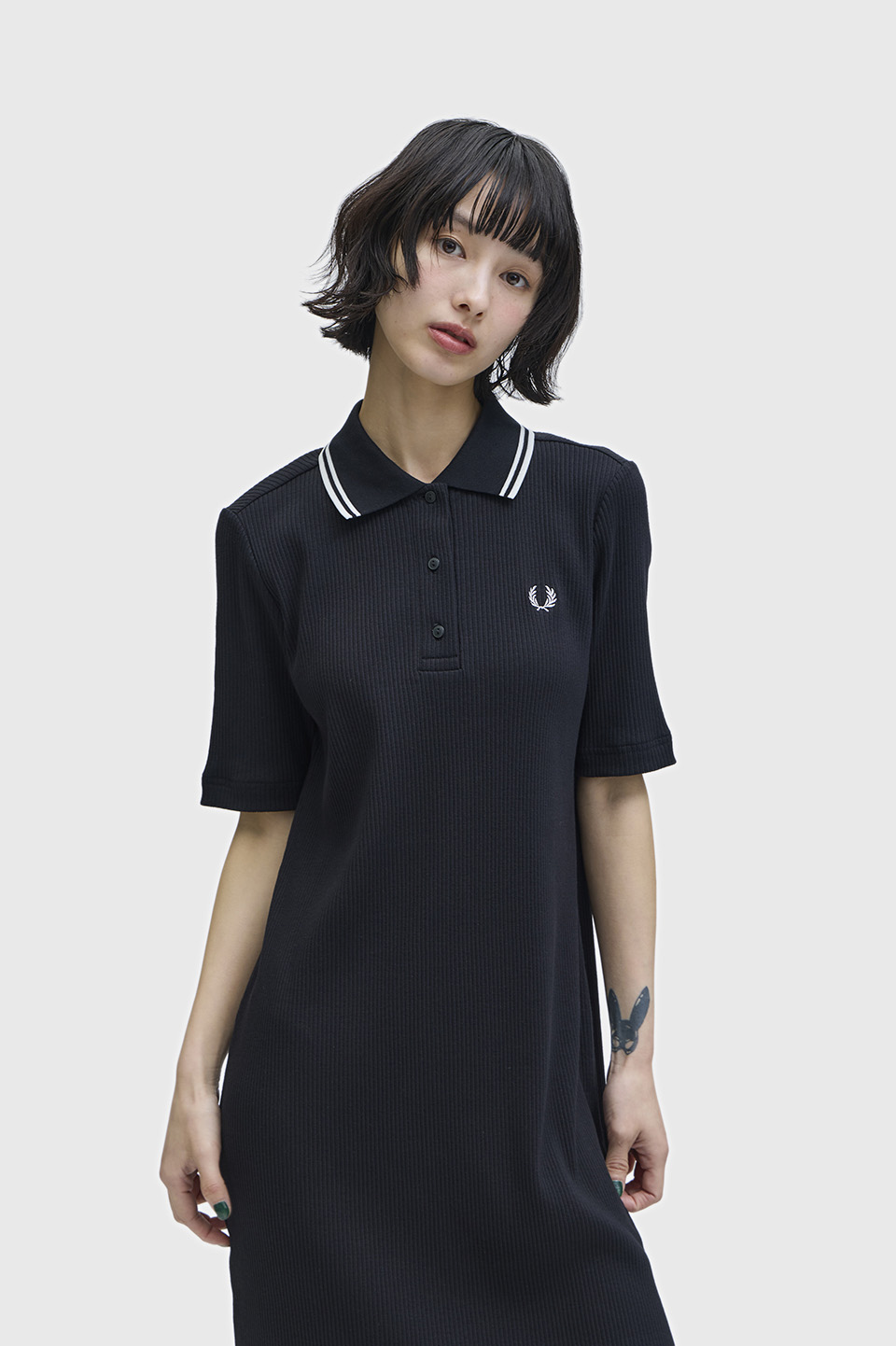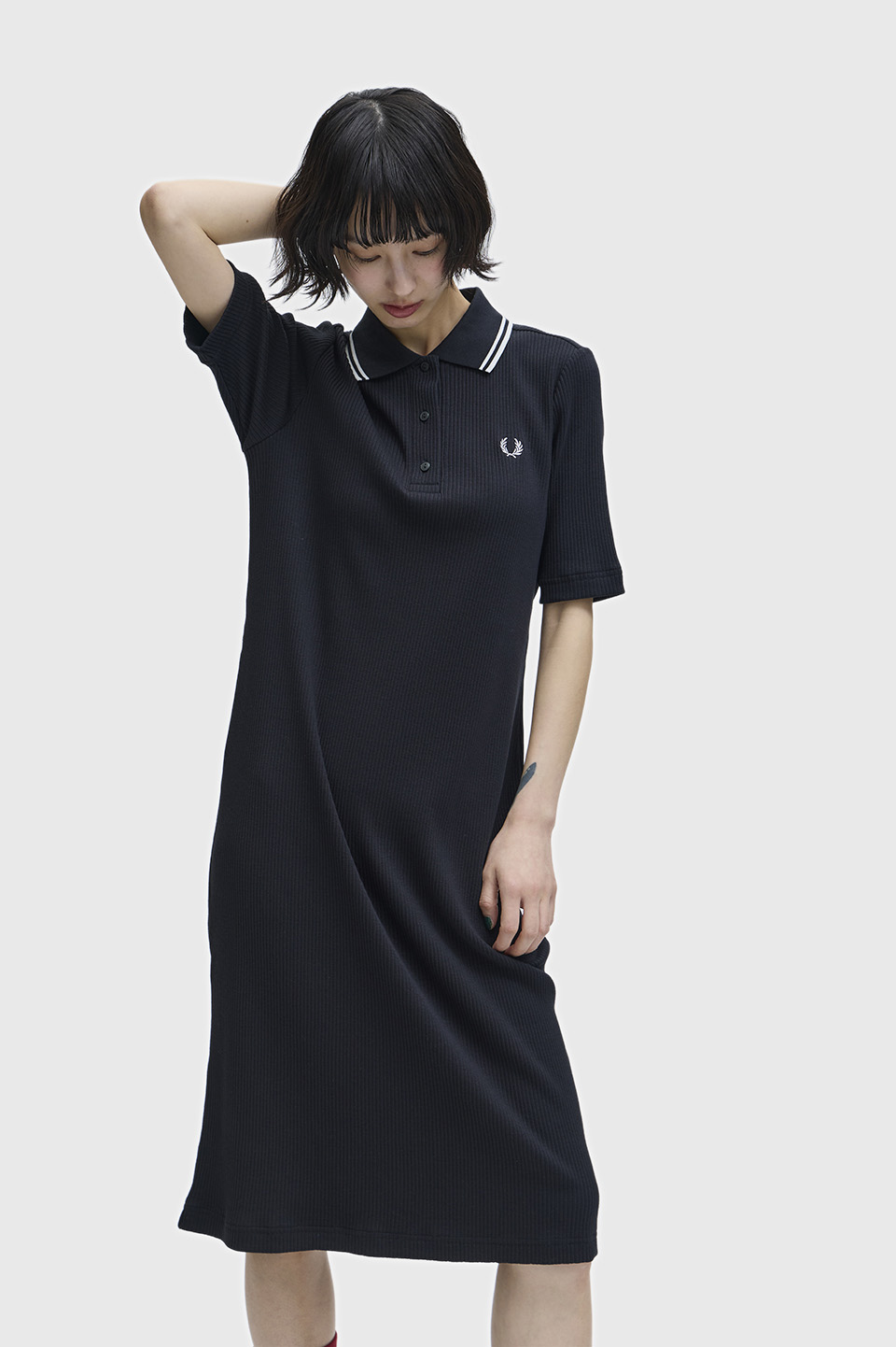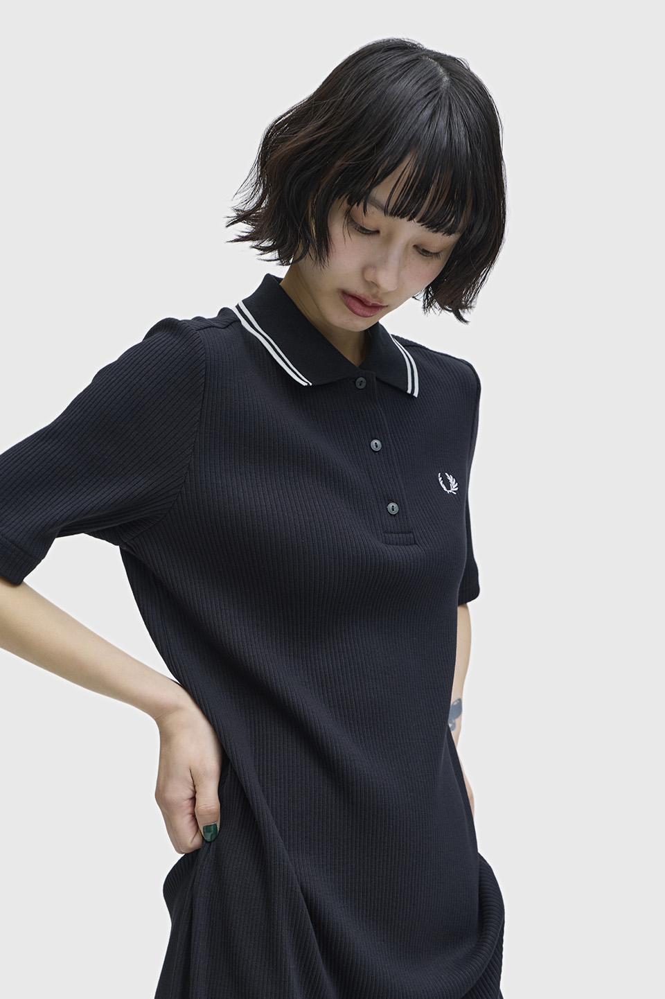 コットンポリエステル素材のリブポロシャツワンピース。襟にシグニチャーであるツインティップを施しました。3つボタンの前立てや、やや長めの5分袖がポイントです。