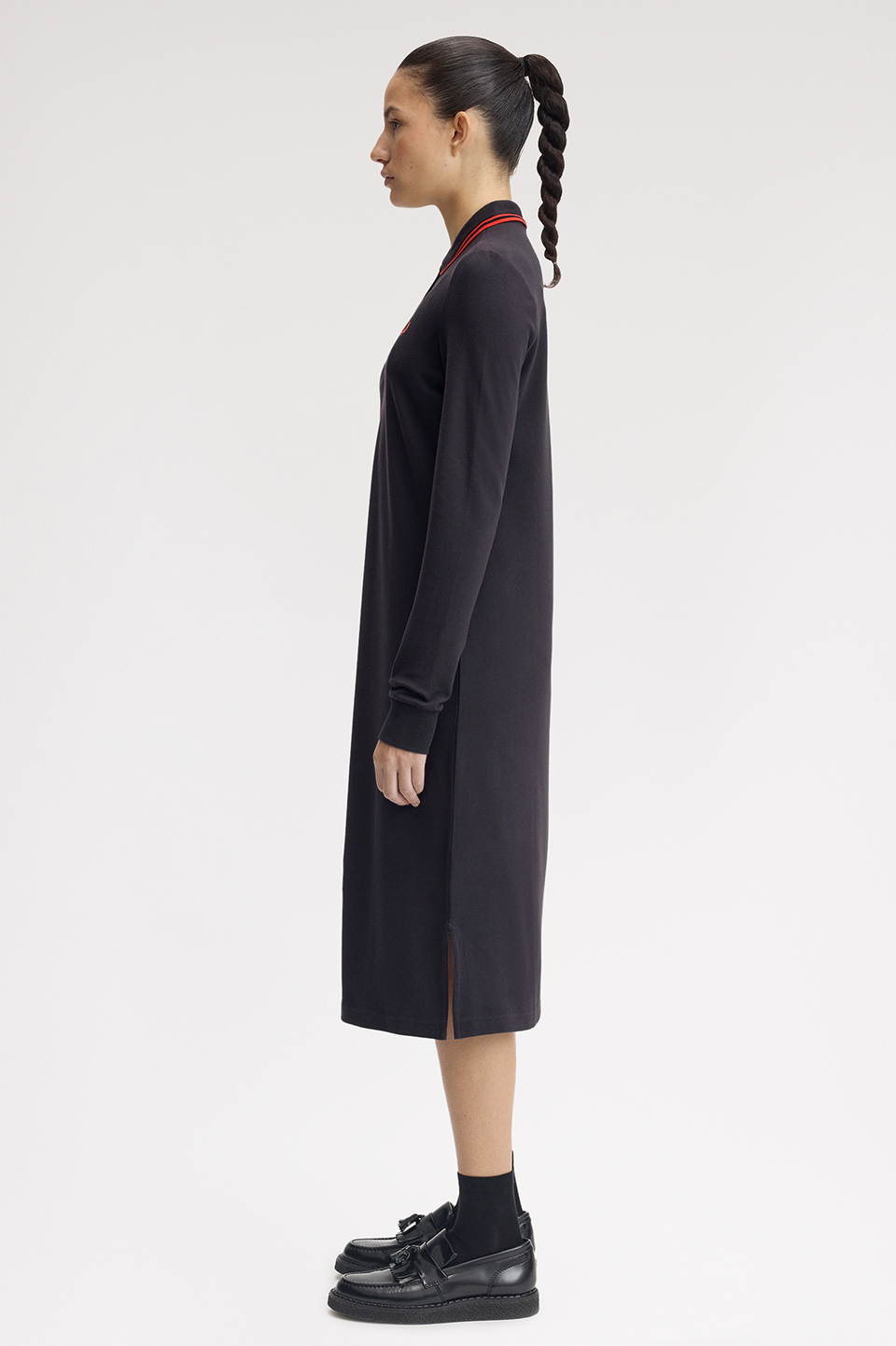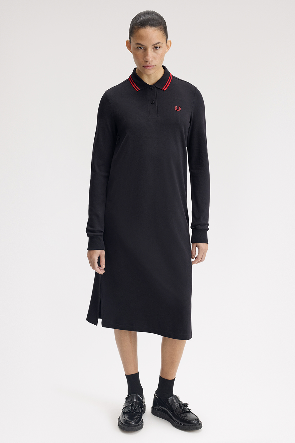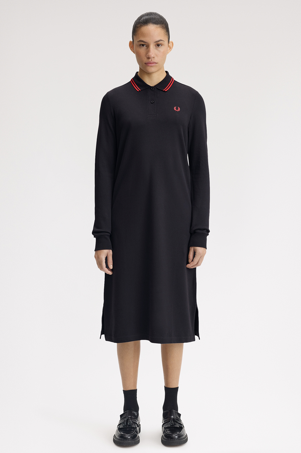 衿にツインティップラインが入ったロングスリーブのポロシャツワンピース。 トップのサイズ感はG3636ベースで両脇裾にスリットが入ります。ゆるやかなAラインシルエット。