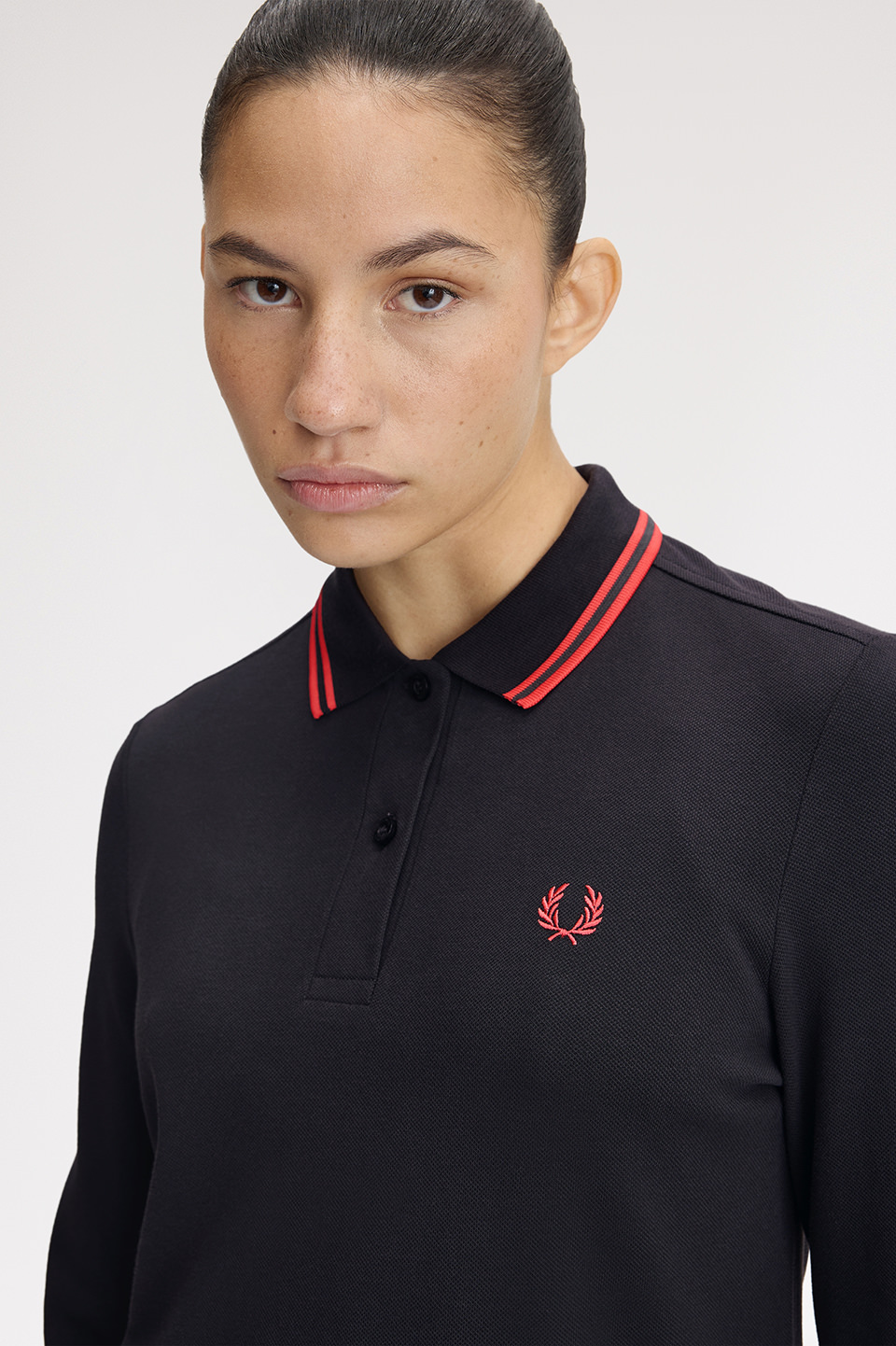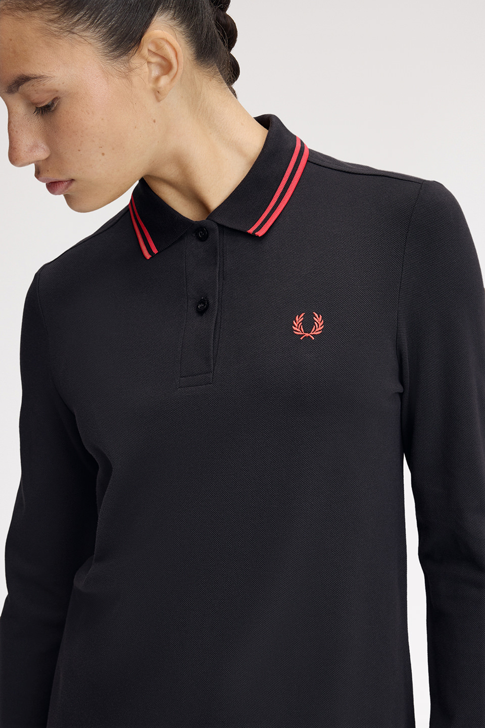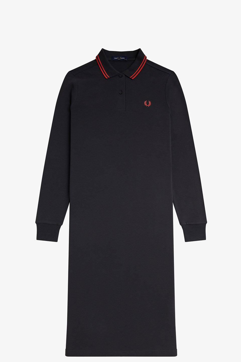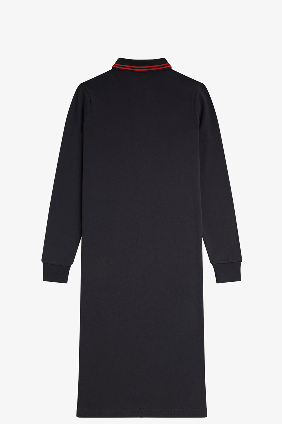 衿にツインティップラインが入ったロングスリーブのポロシャツワンピース。 トップのサイズ感はG3636ベースで両脇裾にスリットが入ります。ゆるやかなAラインシルエット。