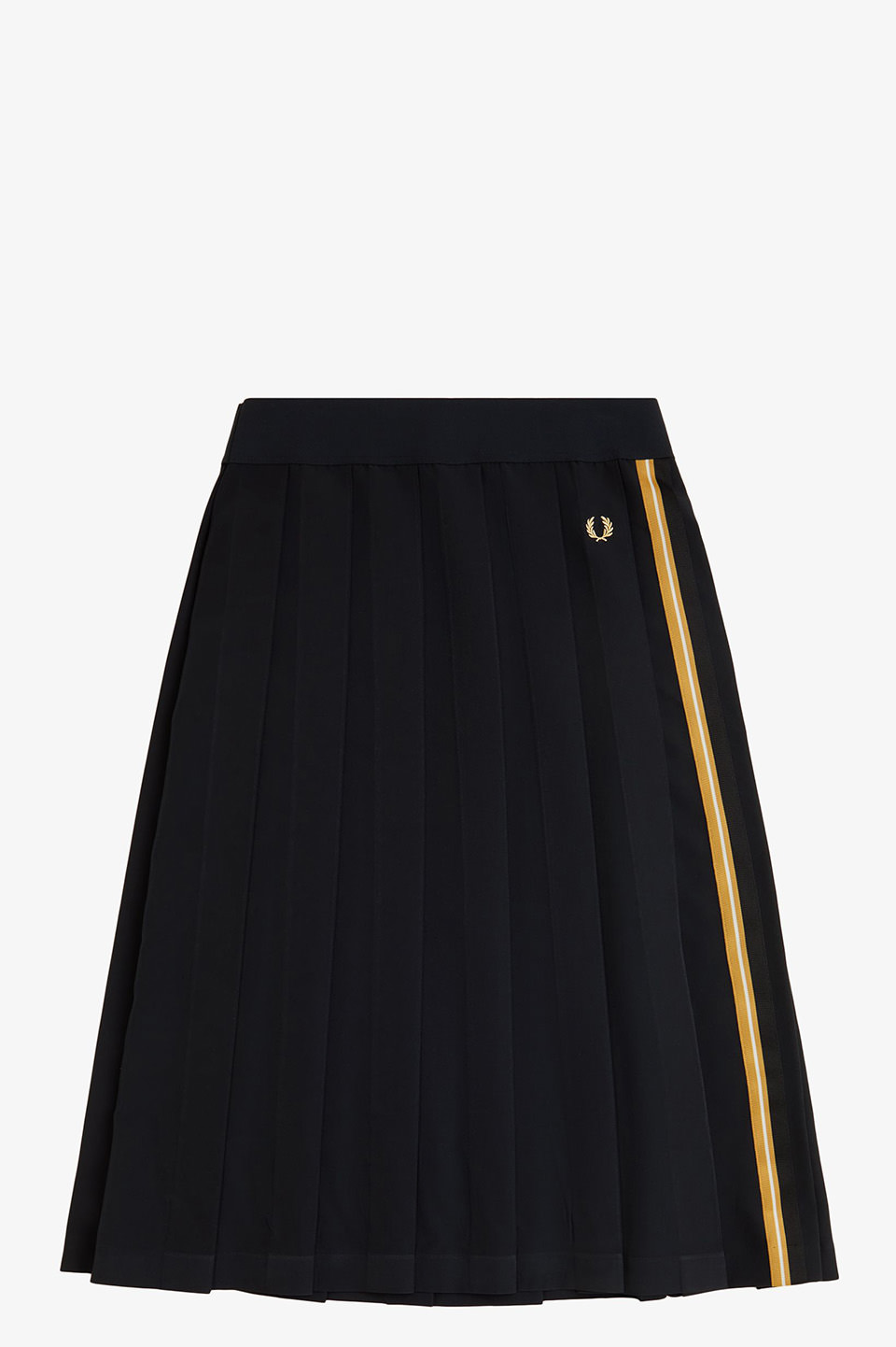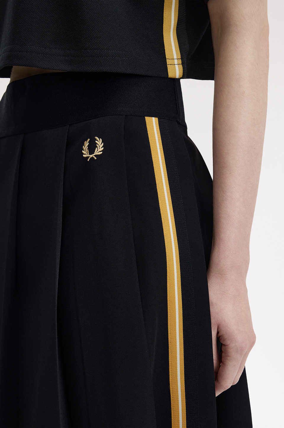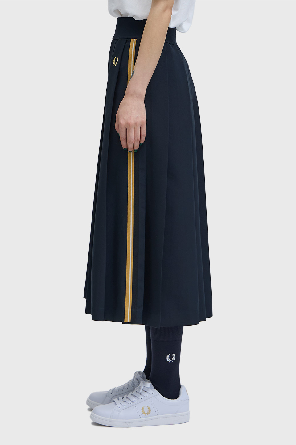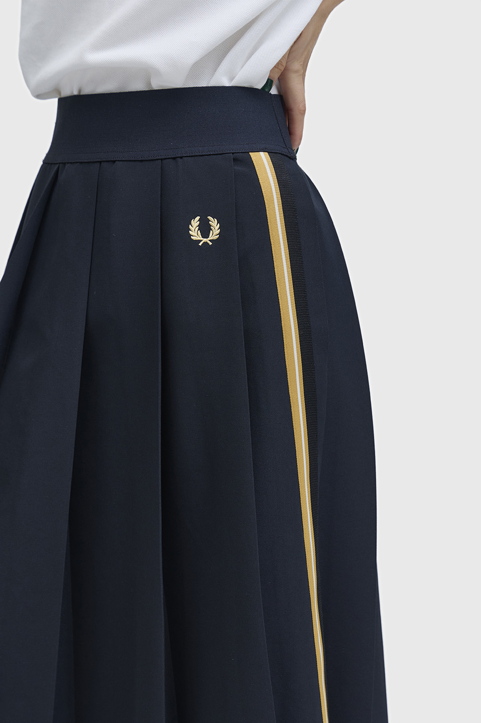 ポリエステルツイル素材を使用したプリーツスカート。ウエストゴム仕様で左サイドに取り付けられたブラック×シャンパンのテープ使いがポイントです。
