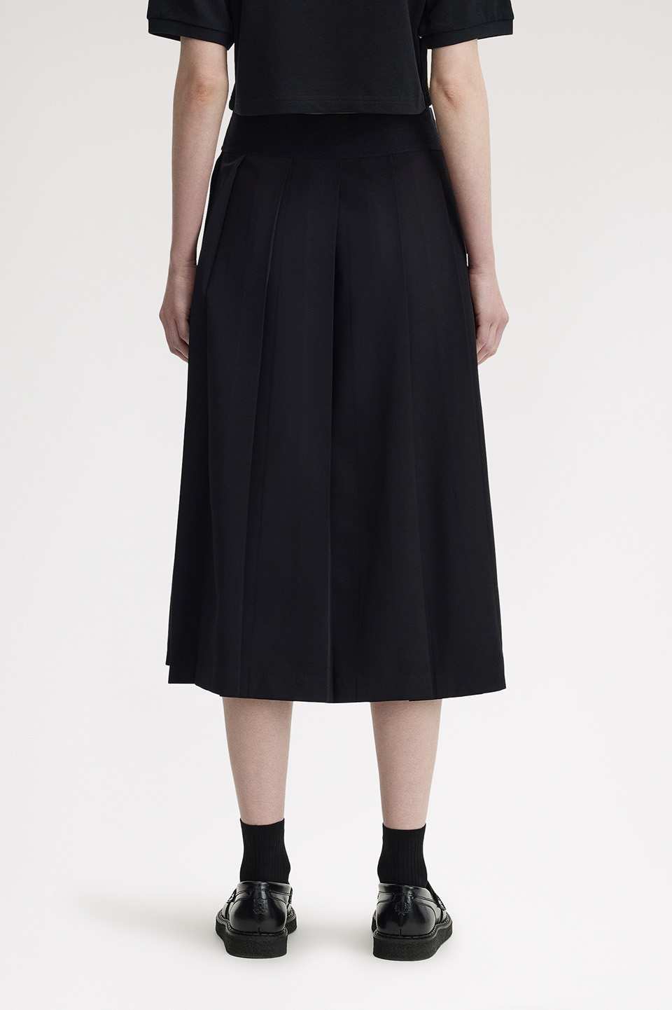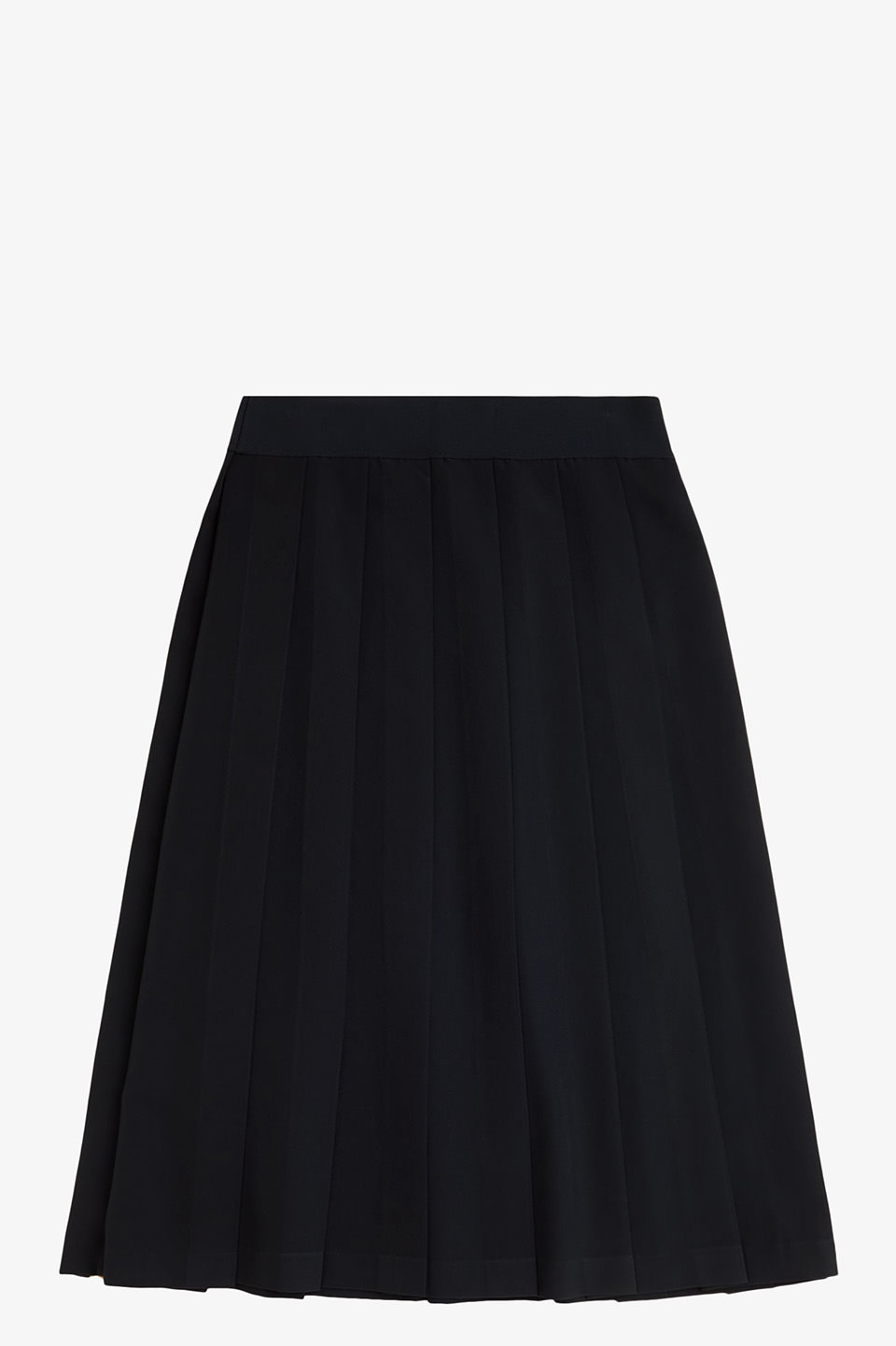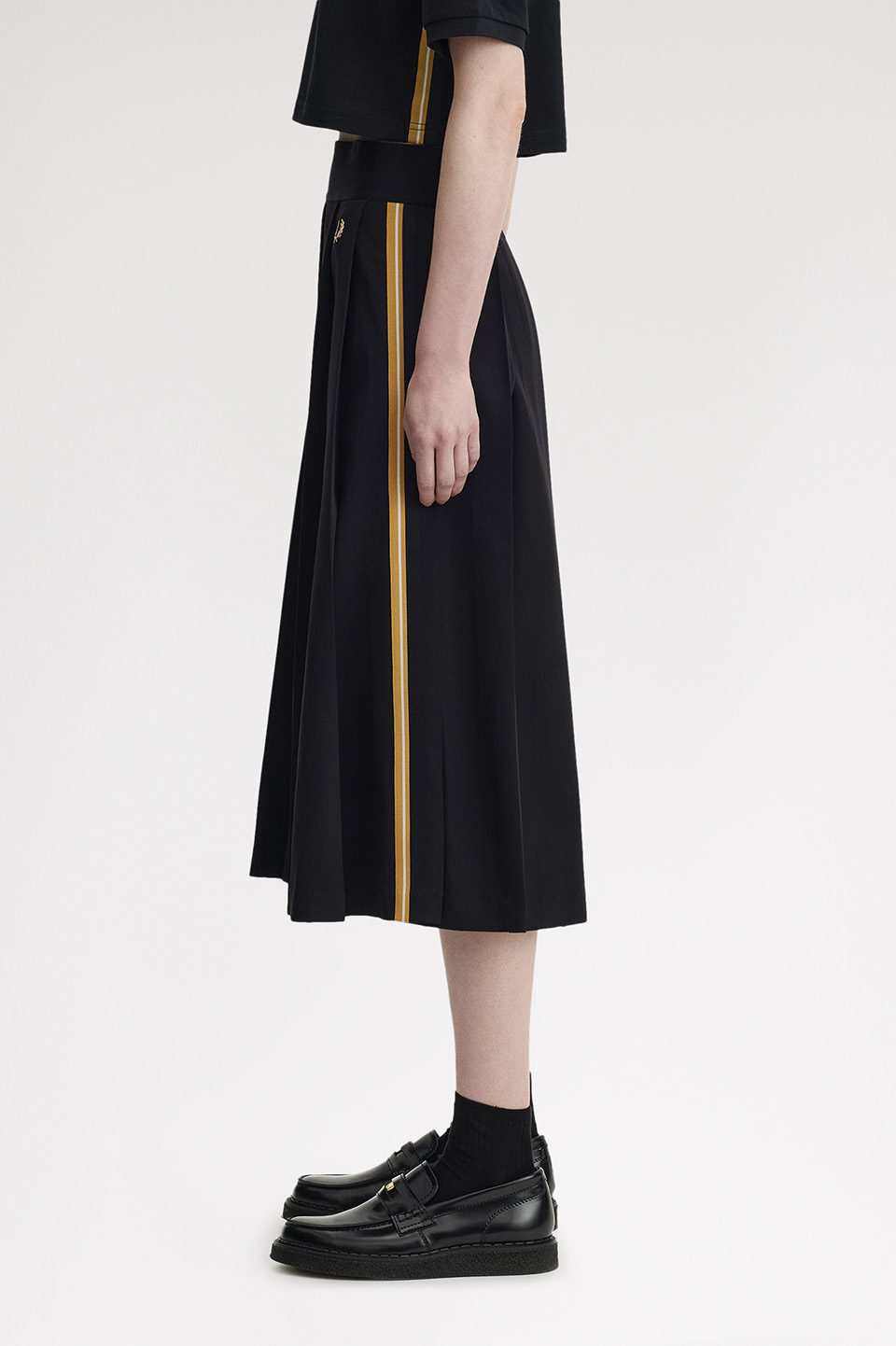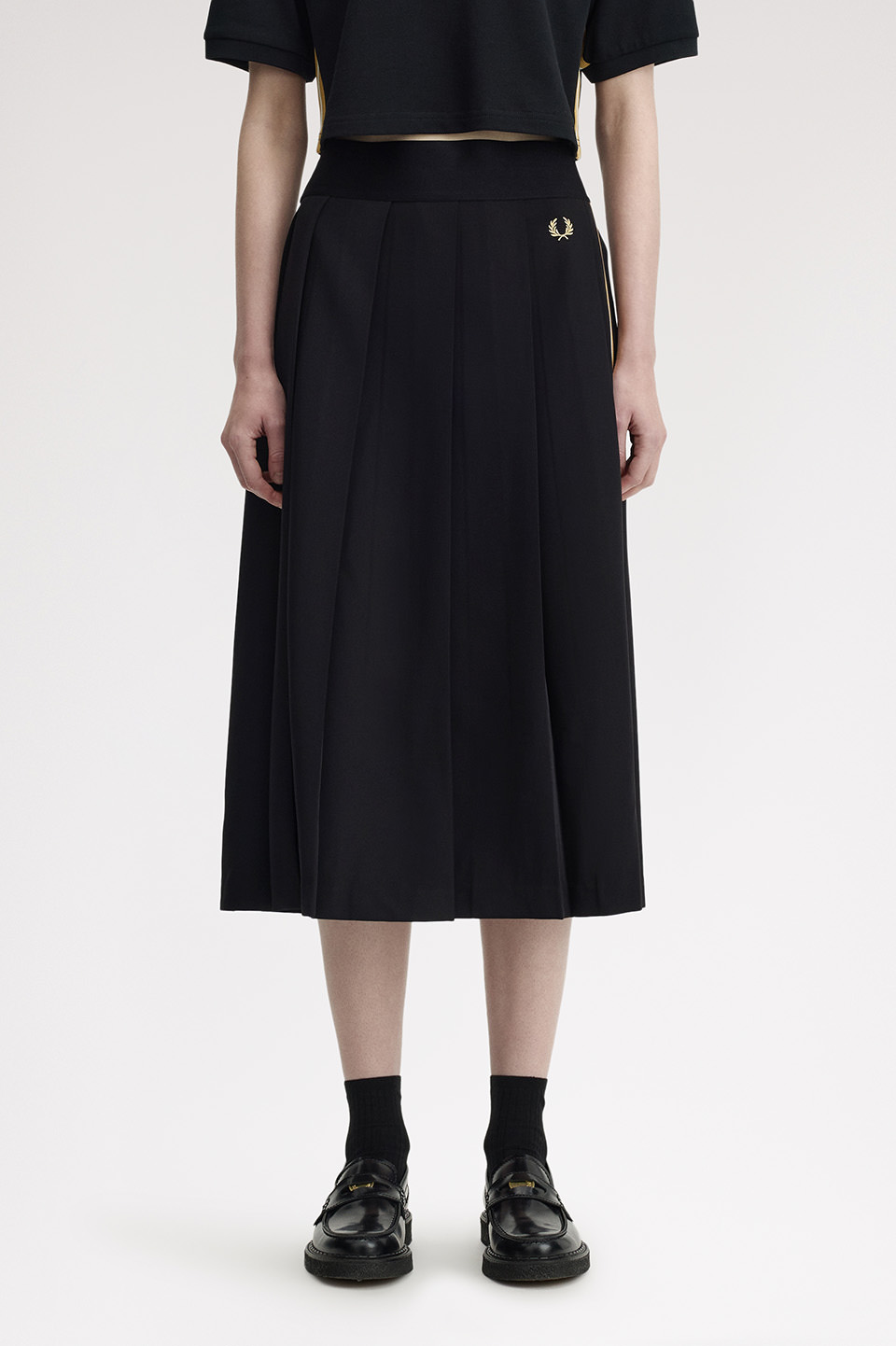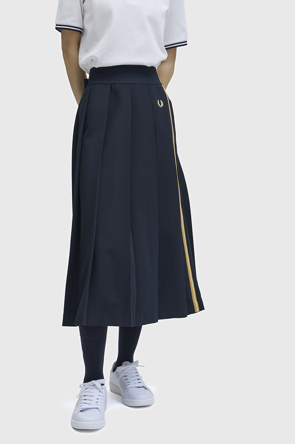 ポリエステルツイル素材を使用したプリーツスカート。ウエストゴム仕様で左サイドに取り付けられたブラック×シャンパンのテープ使いがポイントです。