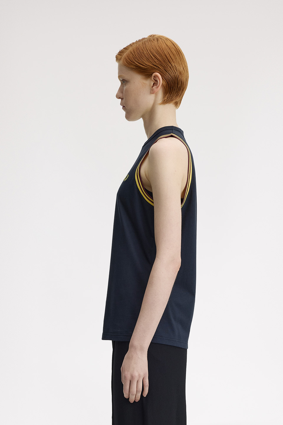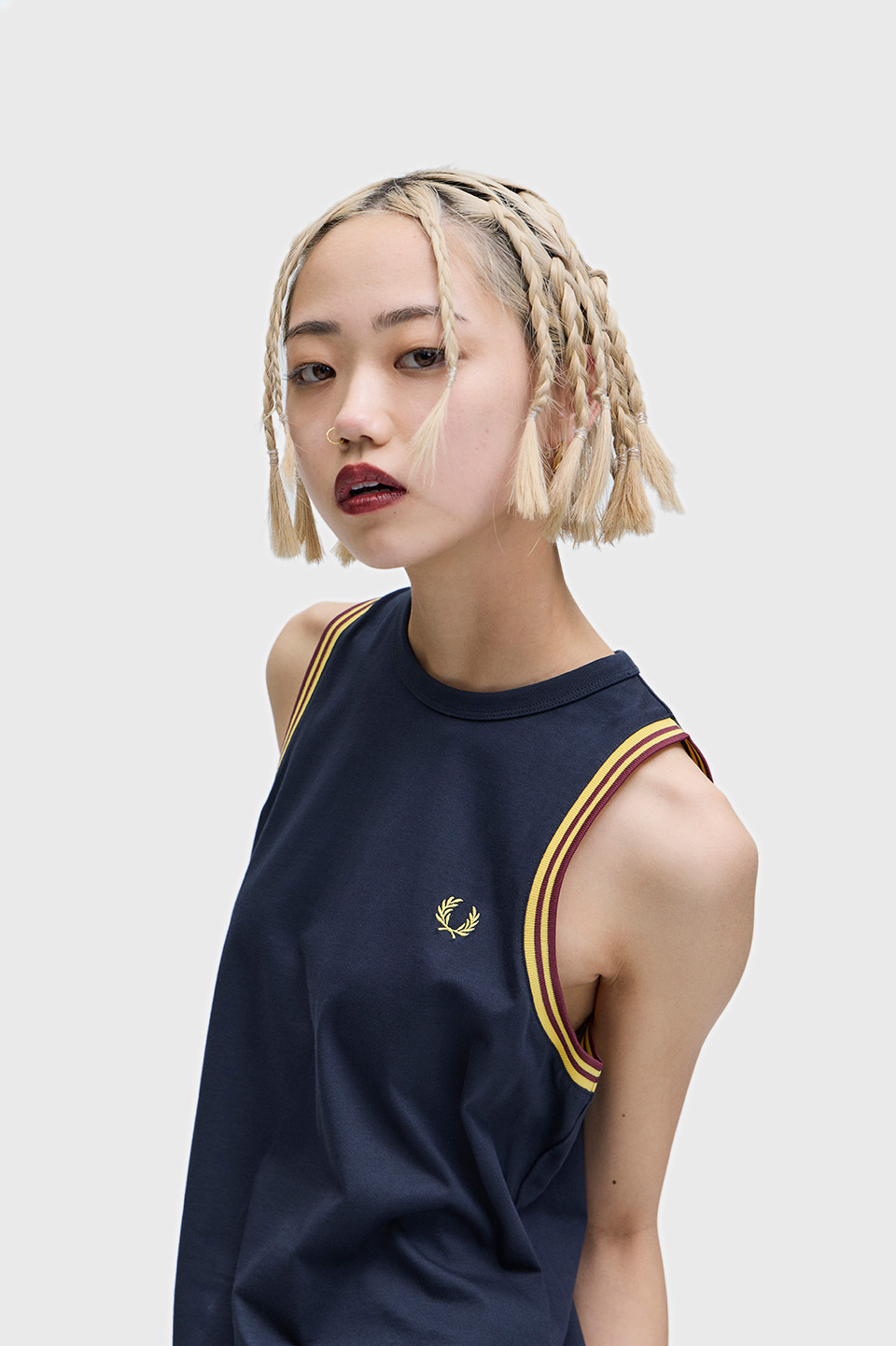 。深めのアームホールにティップラインが施されており、レイヤードしたスタイリングを楽しむことができます。