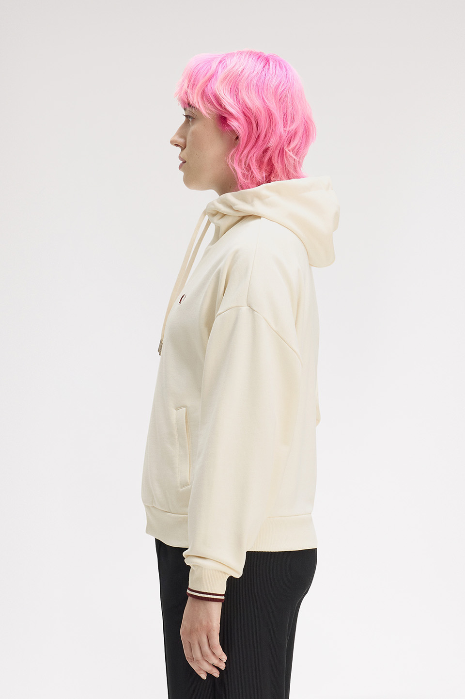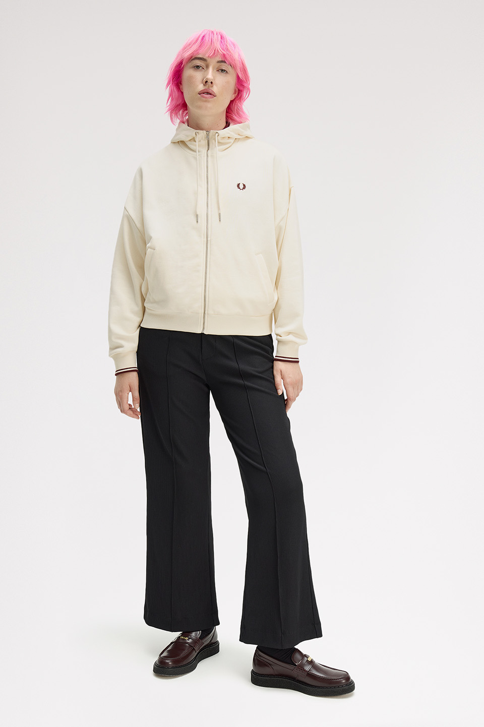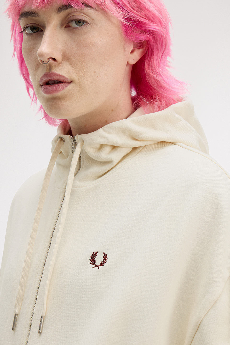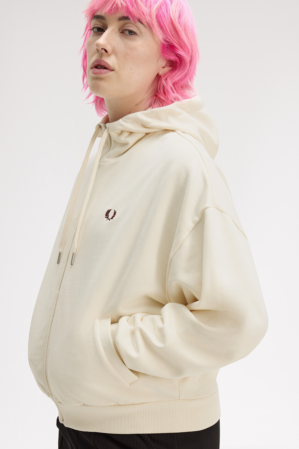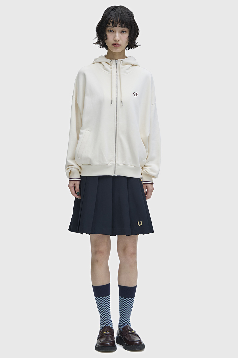 表面感のきれいな裏毛スウェット素材を使用したジップスルーフーディー。首元まで閉められる高めのネックラインと、アームホールが深いドロップショルダーが特徴です。