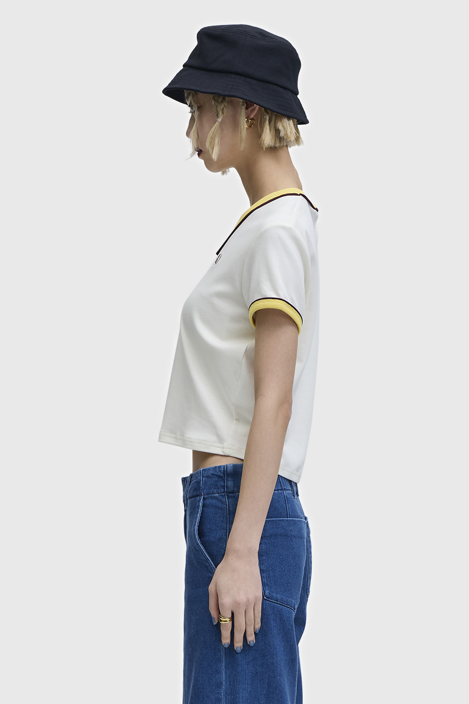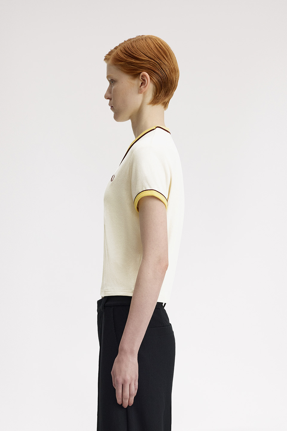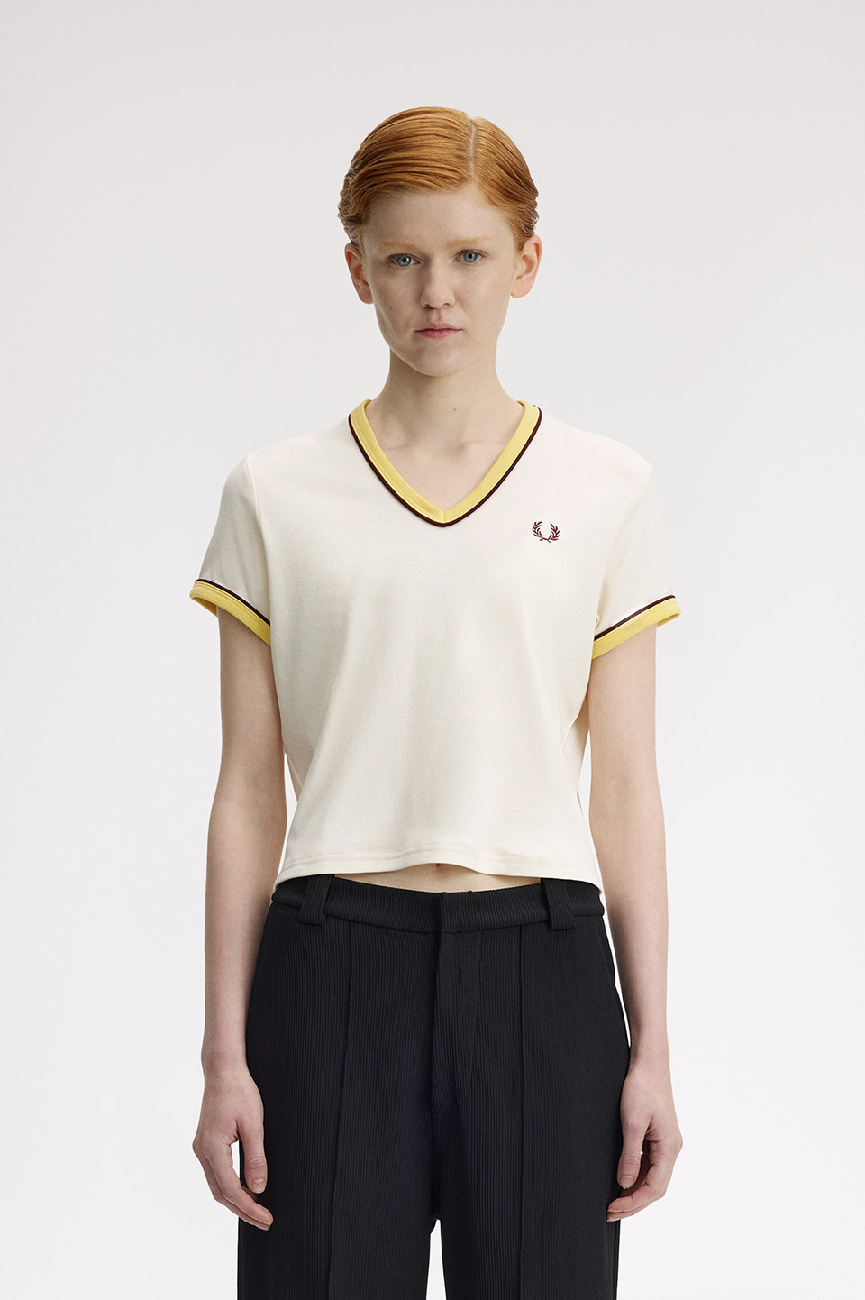 。リンガーTシャツをベースに、洗練されたVネックとパイピングシームで現代的なスタイルに仕上げられています。