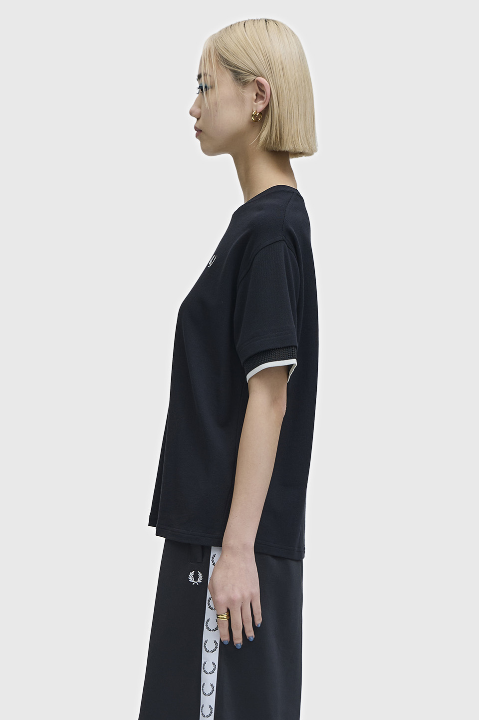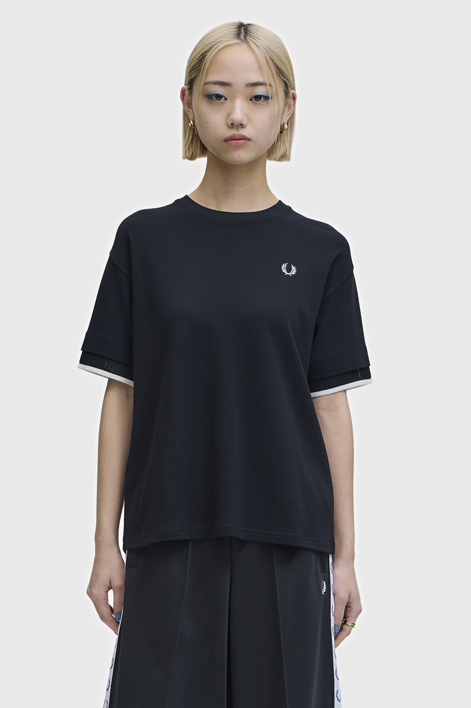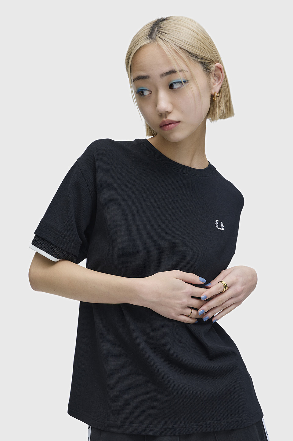 クラシックな鹿の子素材を使用したカフティップTシャツ。シングルティップ入りのジャガードメッシュニットを袖口裏から重ねた仕様がポイントです。