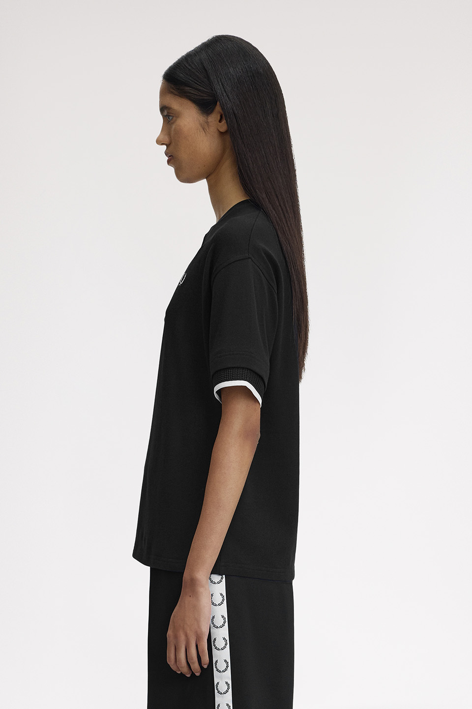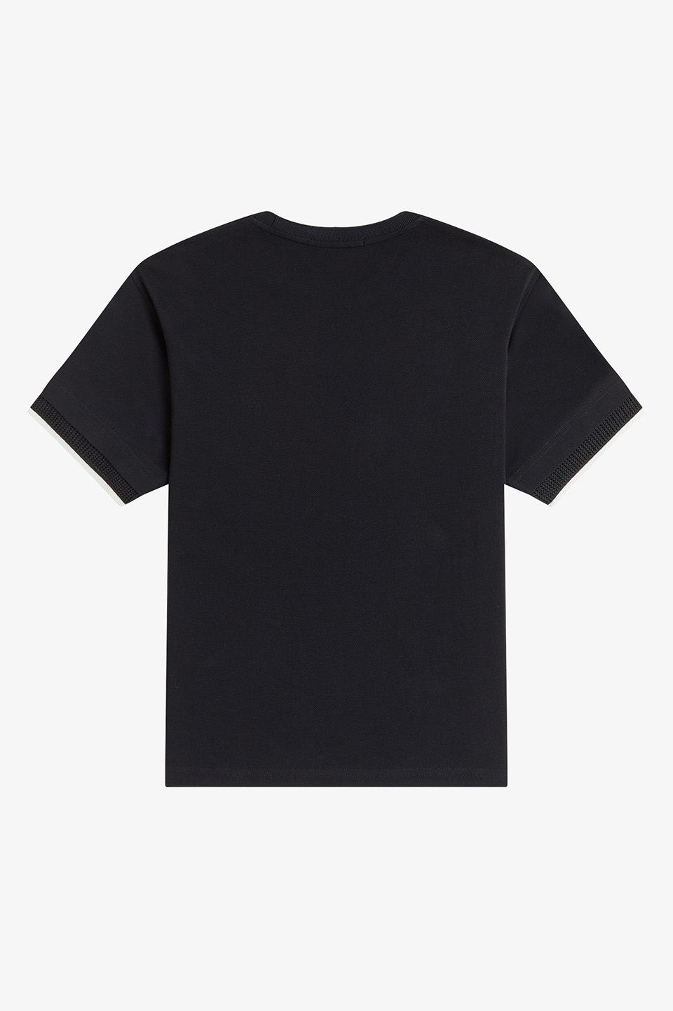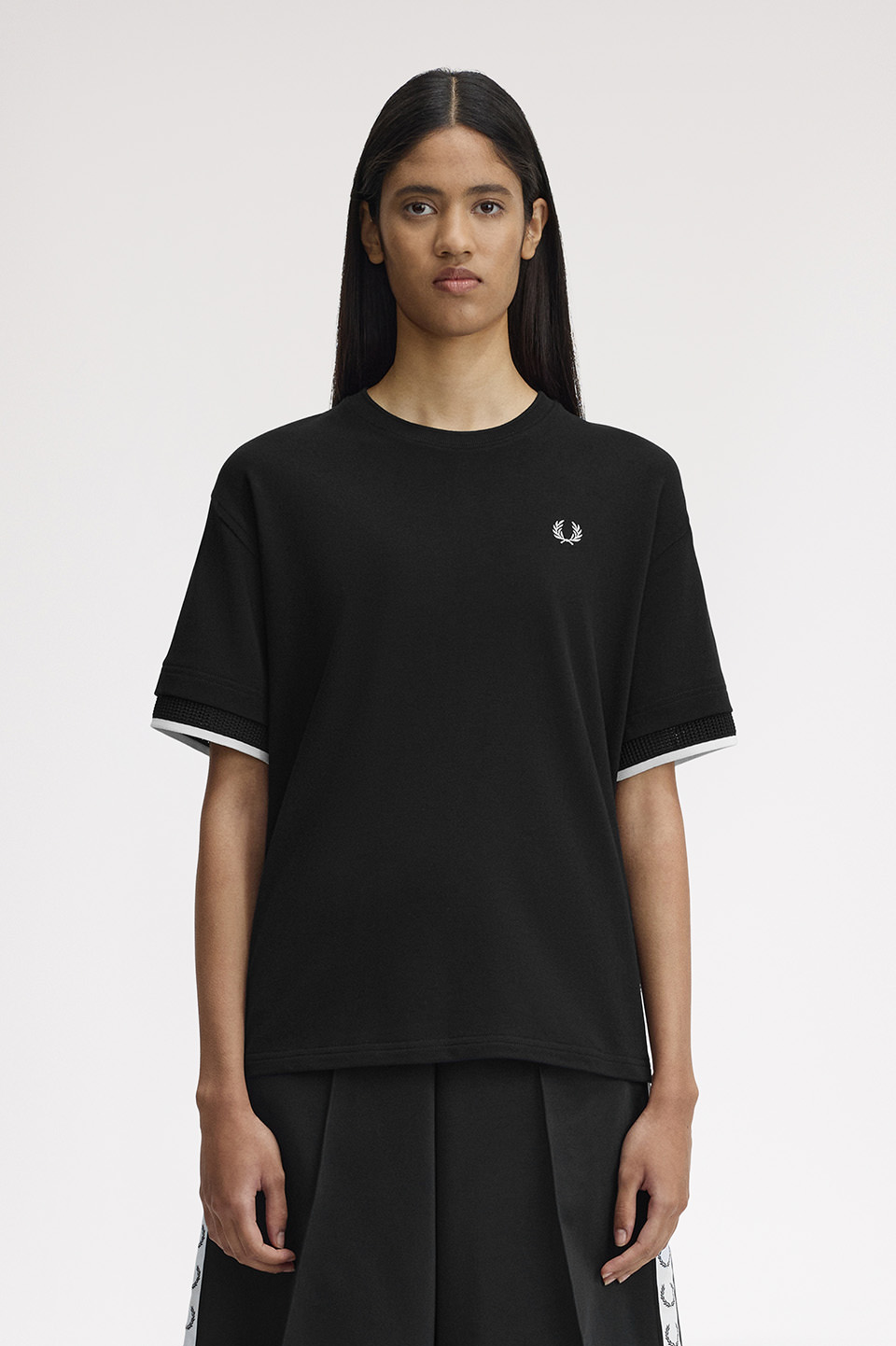 クラシックな鹿の子素材を使用したカフティップTシャツ。シングルティップ入りのジャガードメッシュニットを袖口裏から重ねた仕様がポイントです。