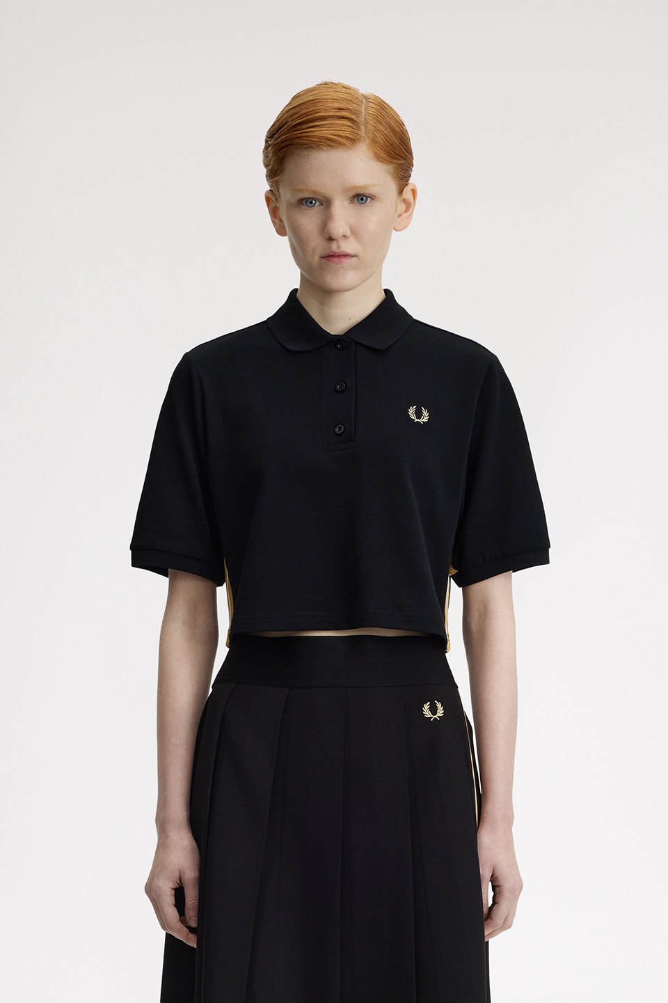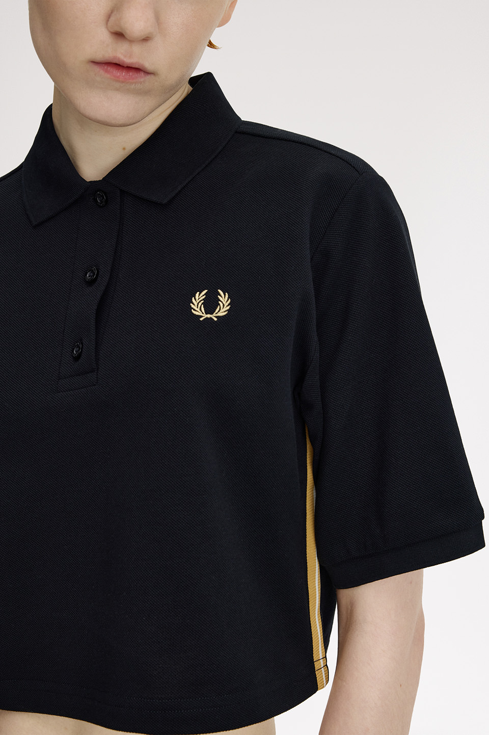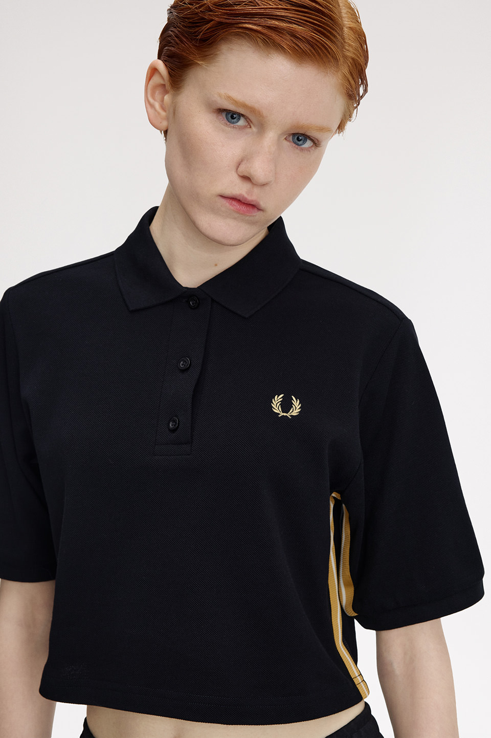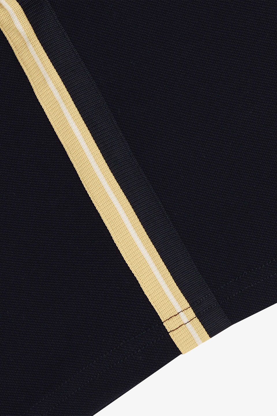 ストライプテープを施したポロシャツ。サイドシームとアンダーアームに施されたブラック×シャンパンのテープが特徴のクリーンなコットンピケポロシャツです。