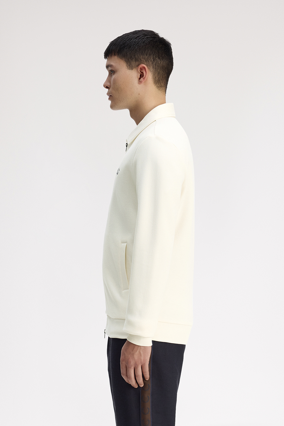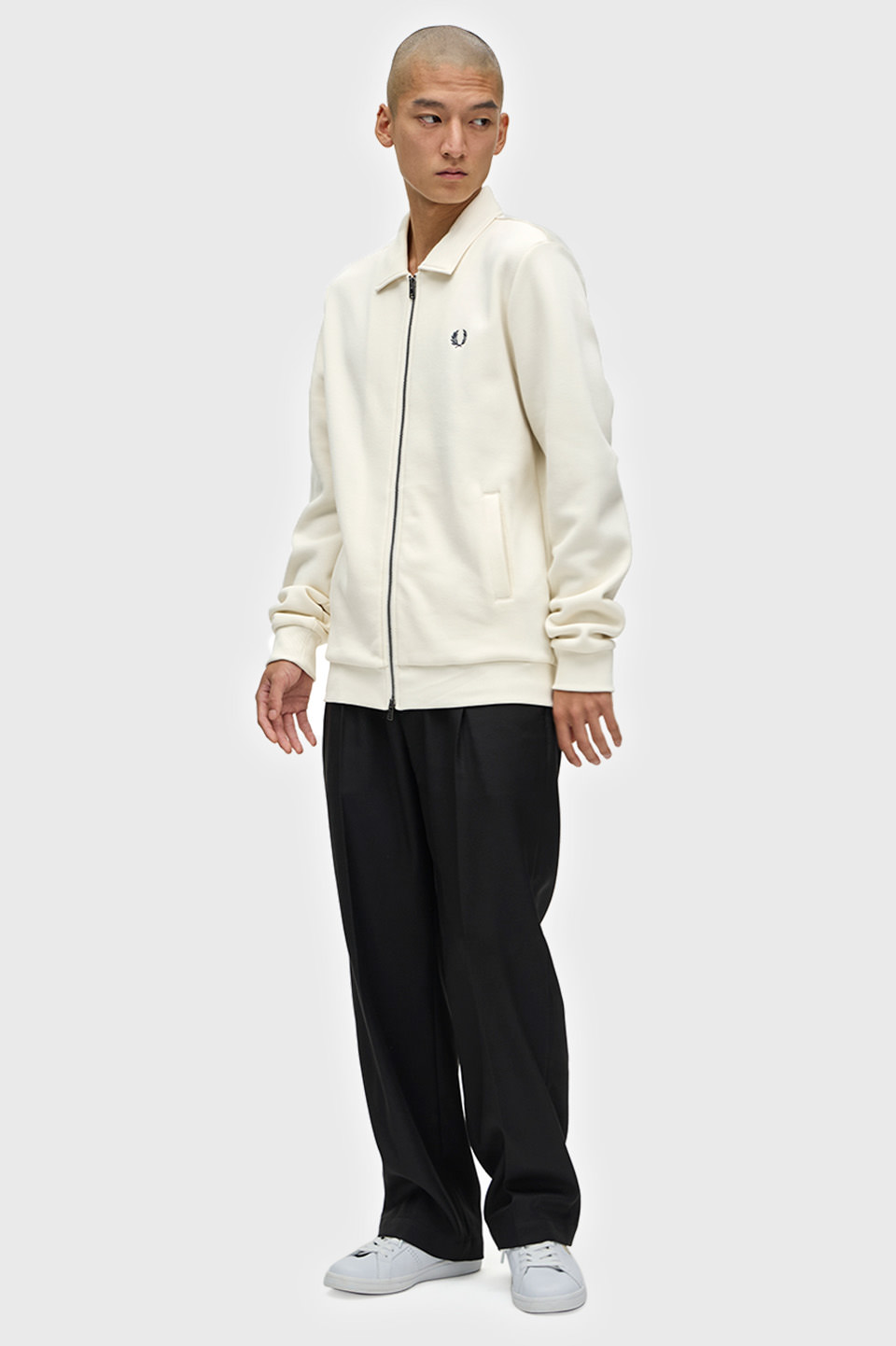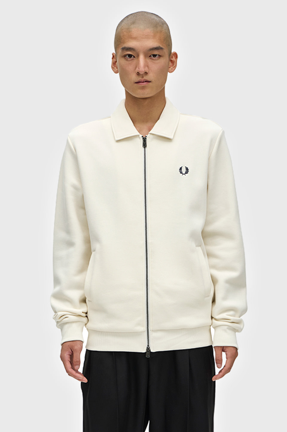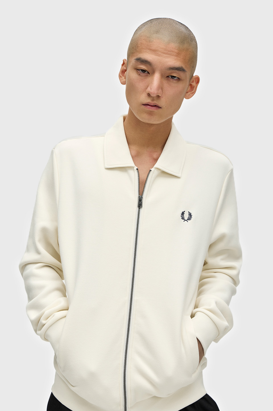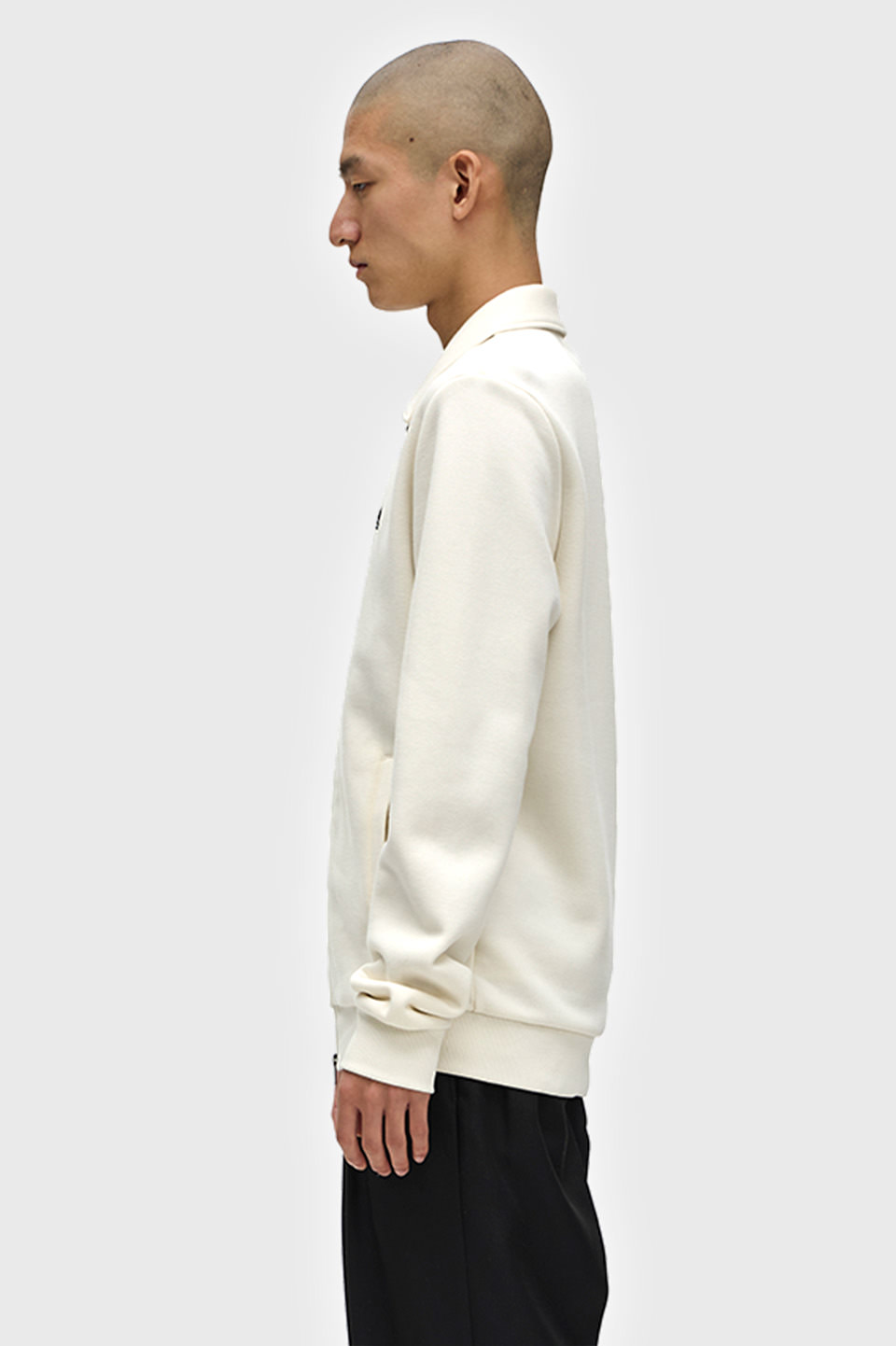襟付きデザインのジップスルースウェットシャツ。表面は鹿の子素材、内側はフリース素材で薄手でも暖かさのあるアイテムです。ダブルファスナータイプのメタルジップがデザインのポイントです。