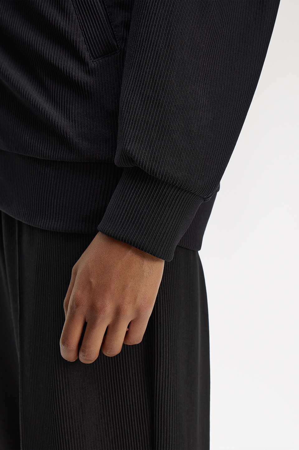 リブトリコットを使用したボマージャケット。非常に軽量でストレッチ性のある素材で快適な着心地を実現しています。セットアップ可能なトラウザーのご用意もございます。