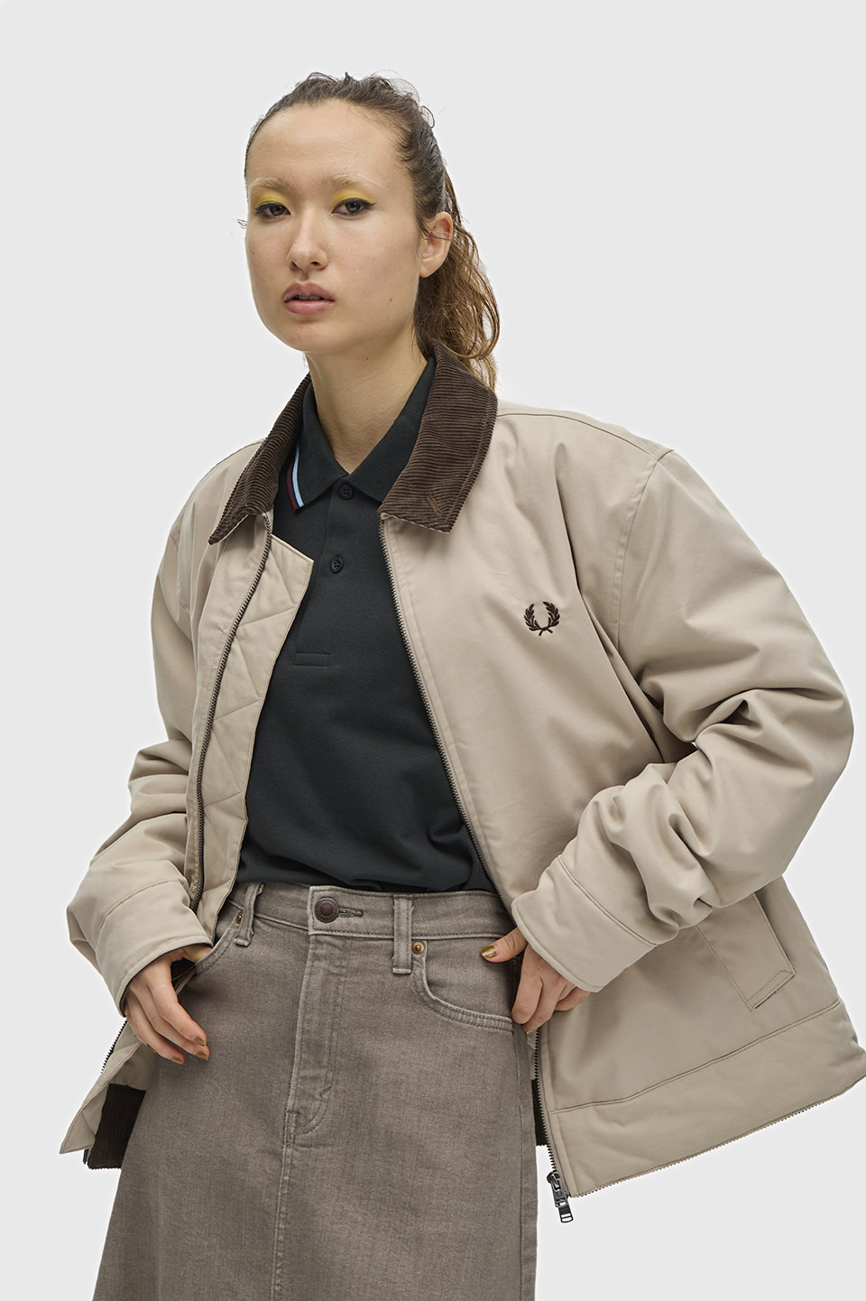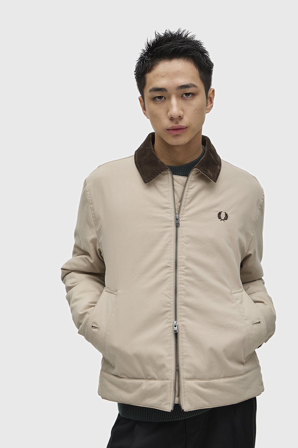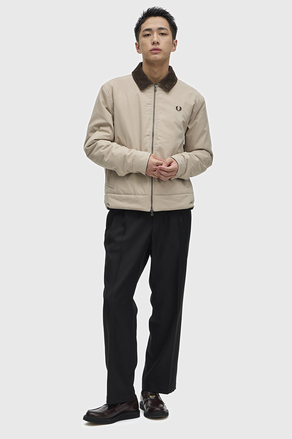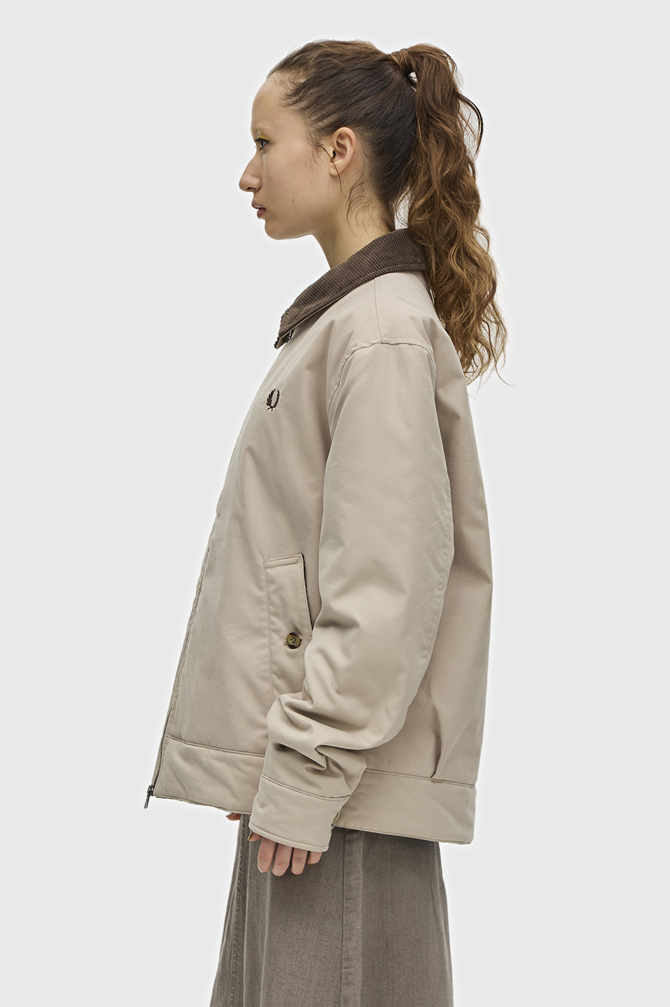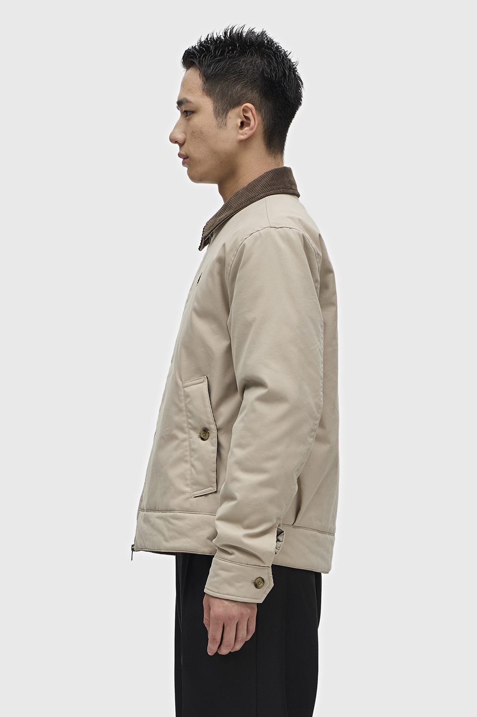 コットンポリエステルを使ったカバンジャケット。 コットンポリエステルのキャンバスは上品な光沢が有り、微起毛されソフトなタッチです。 衿や袖口、ポケット口や裾口にコーデュロイで補強されています。