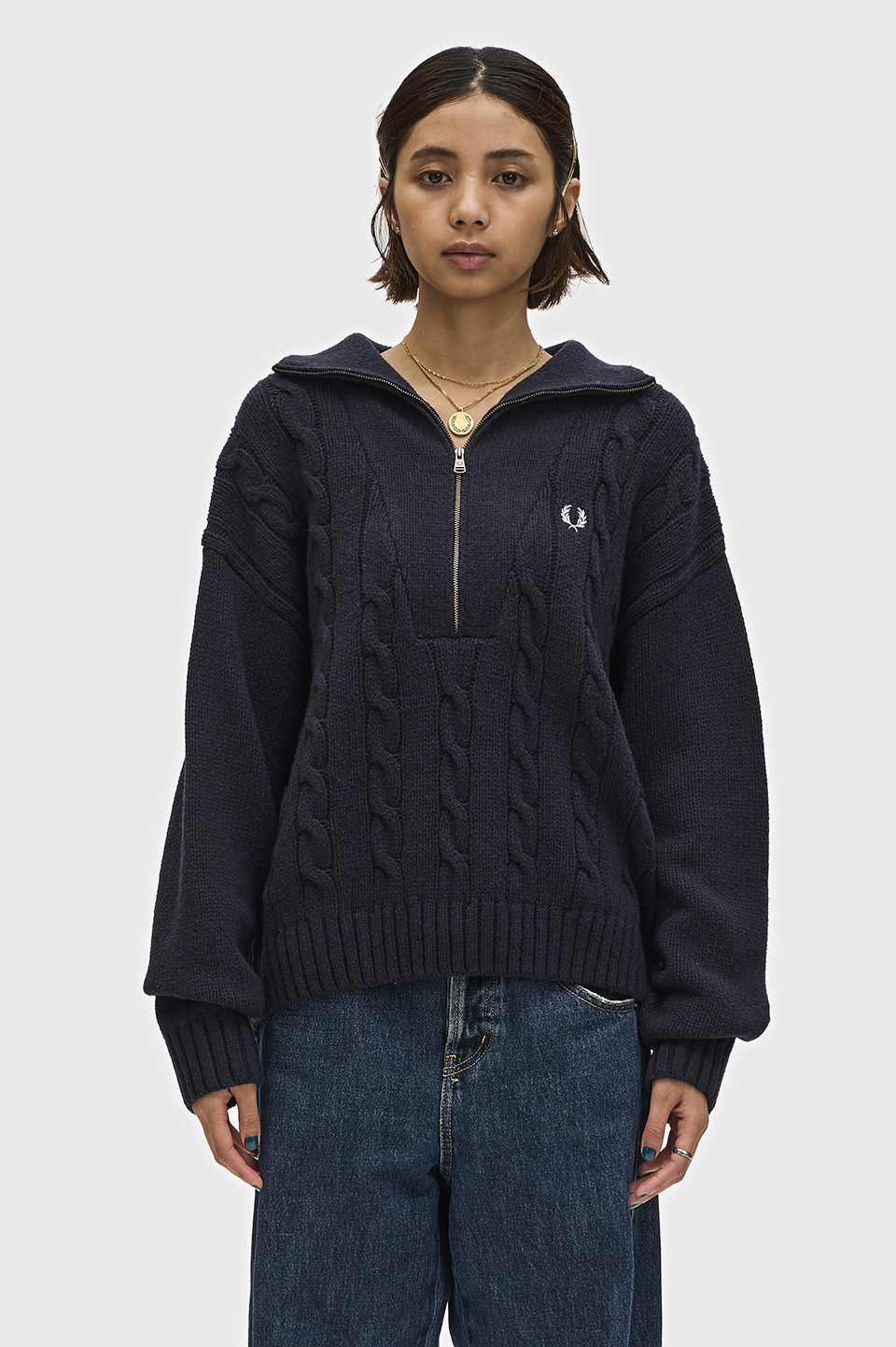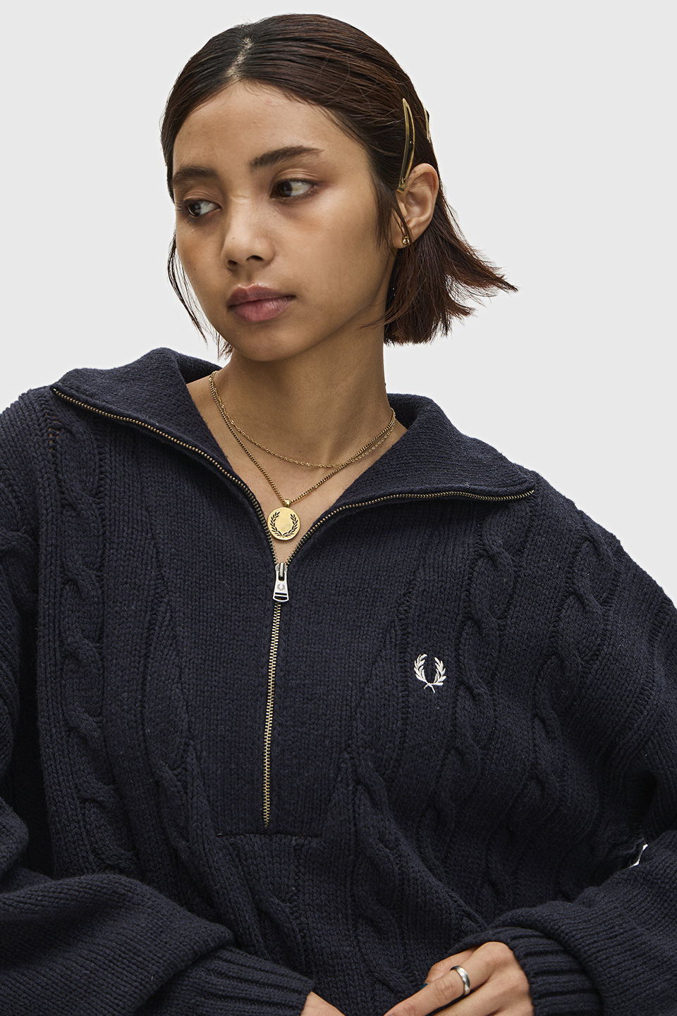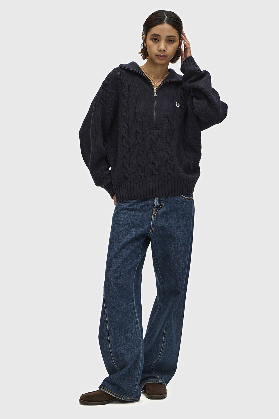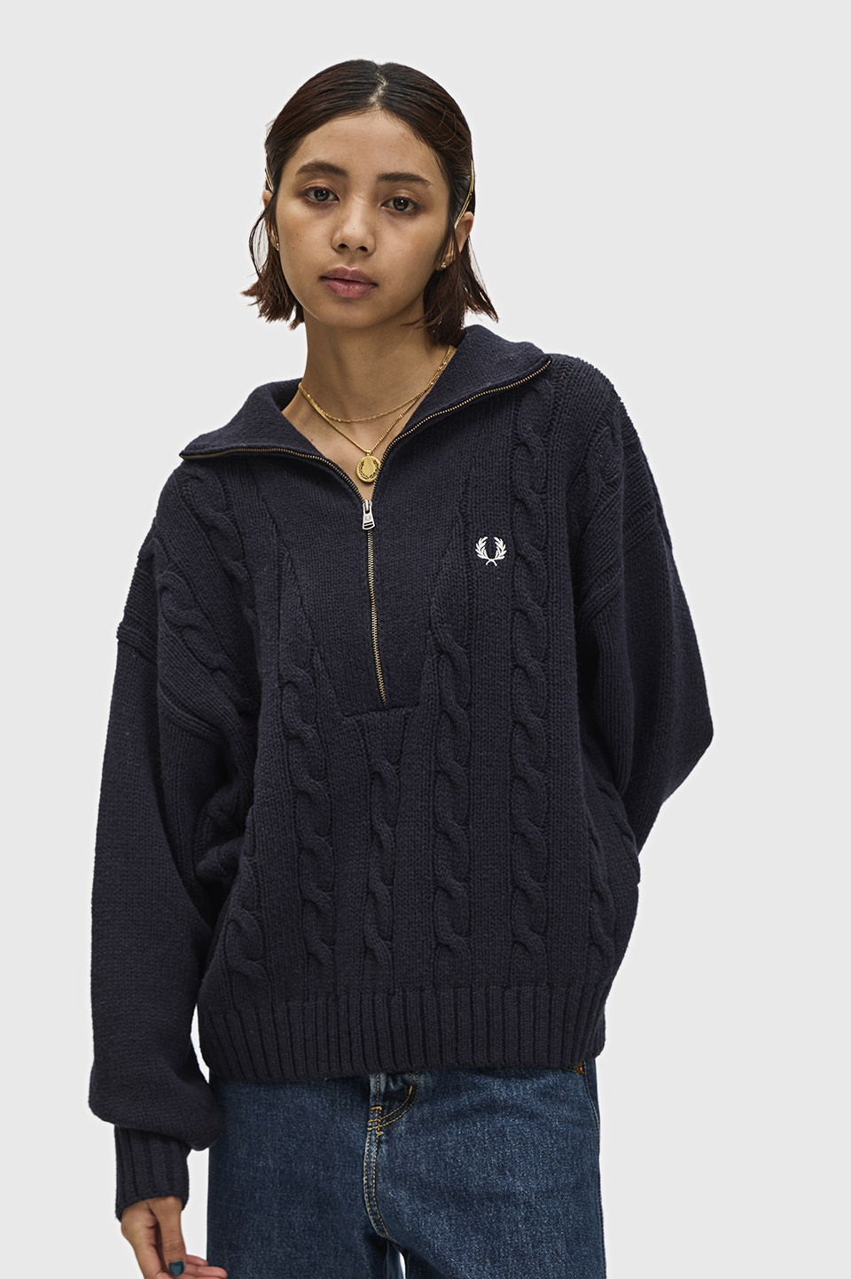 トップス。深めのハーフジップに大きめな衿が特徴です。