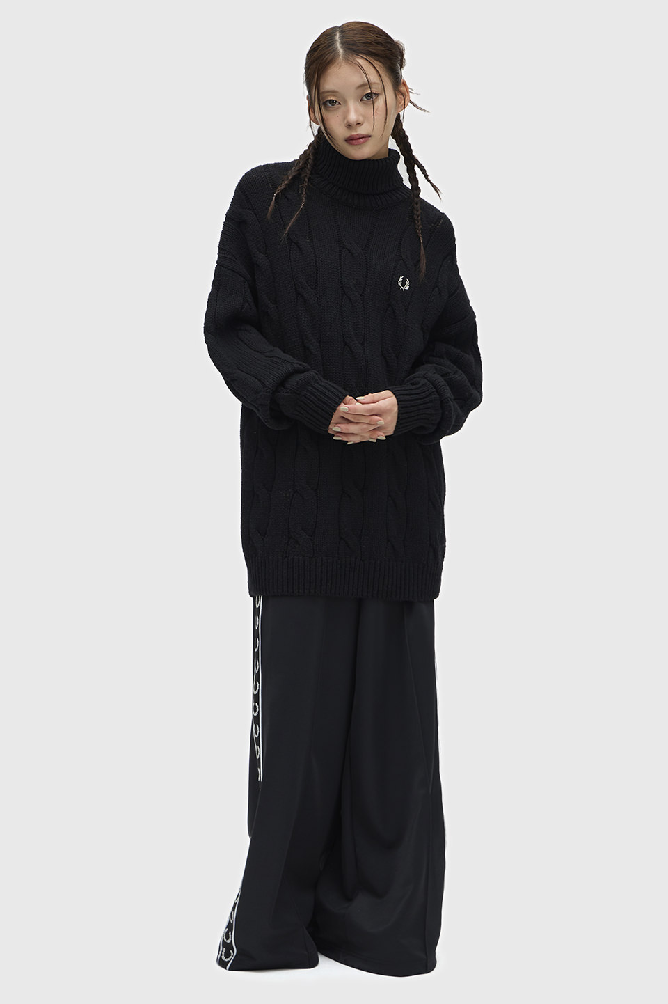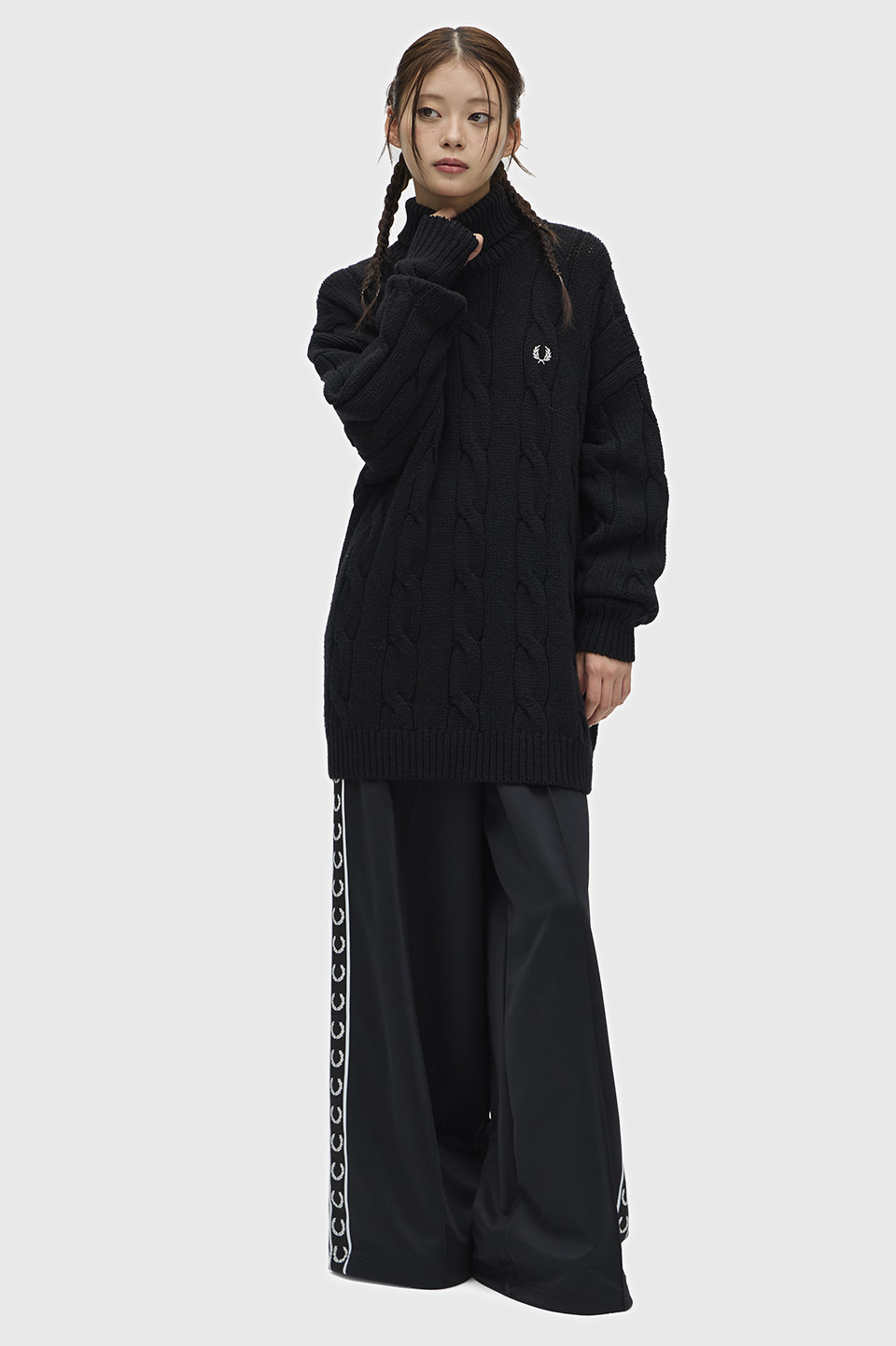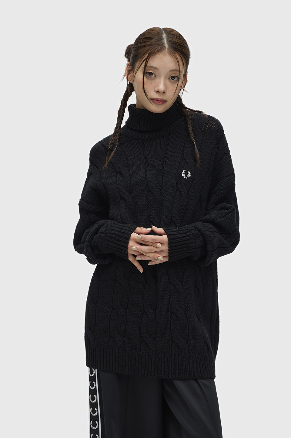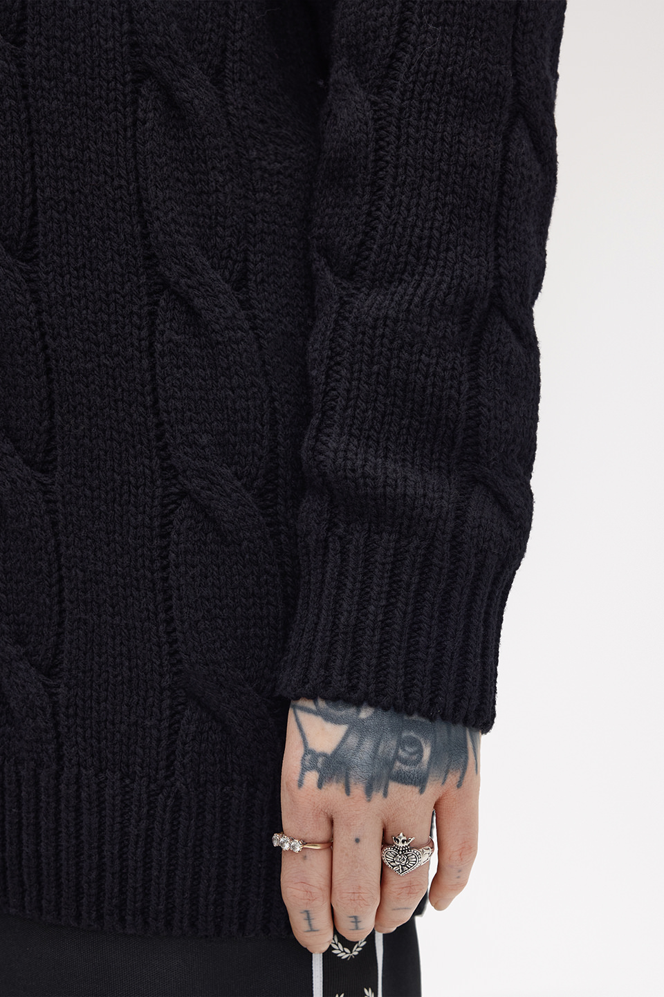 。メンズライクに着られるようゆったりしたシルエットにケーブル柄を大きく調整しモダンに仕上げています。