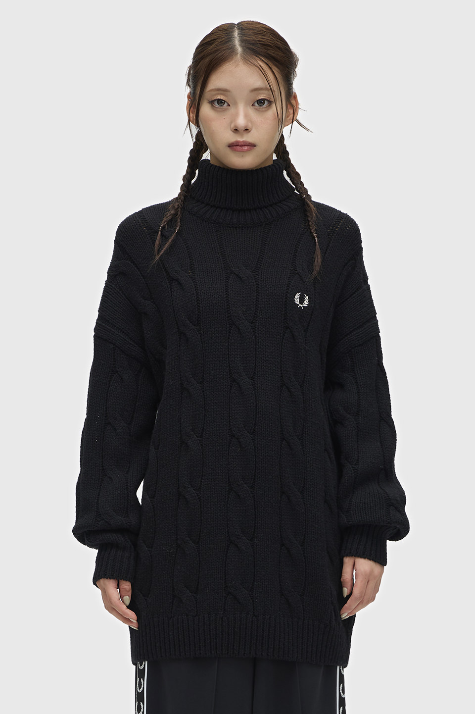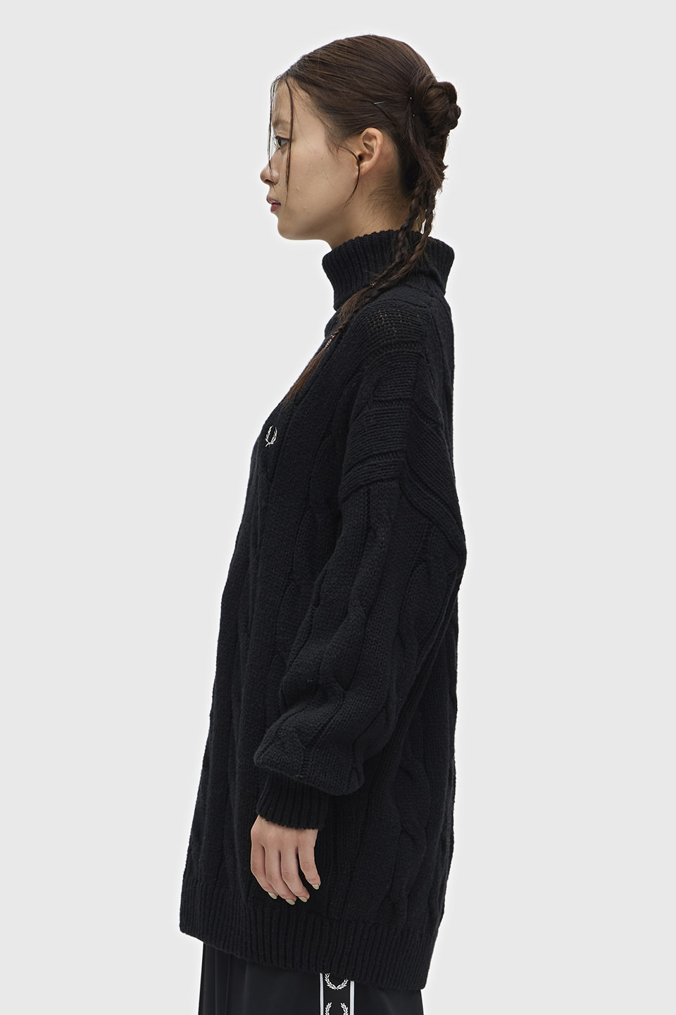 ウールナイロンの軽量の混紡糸で、ケーブル編みで仕上げたロールネックのニット。メンズライクに着られるようゆったりしたシルエットにケーブル柄を大きく調整しモダンに仕上げています。