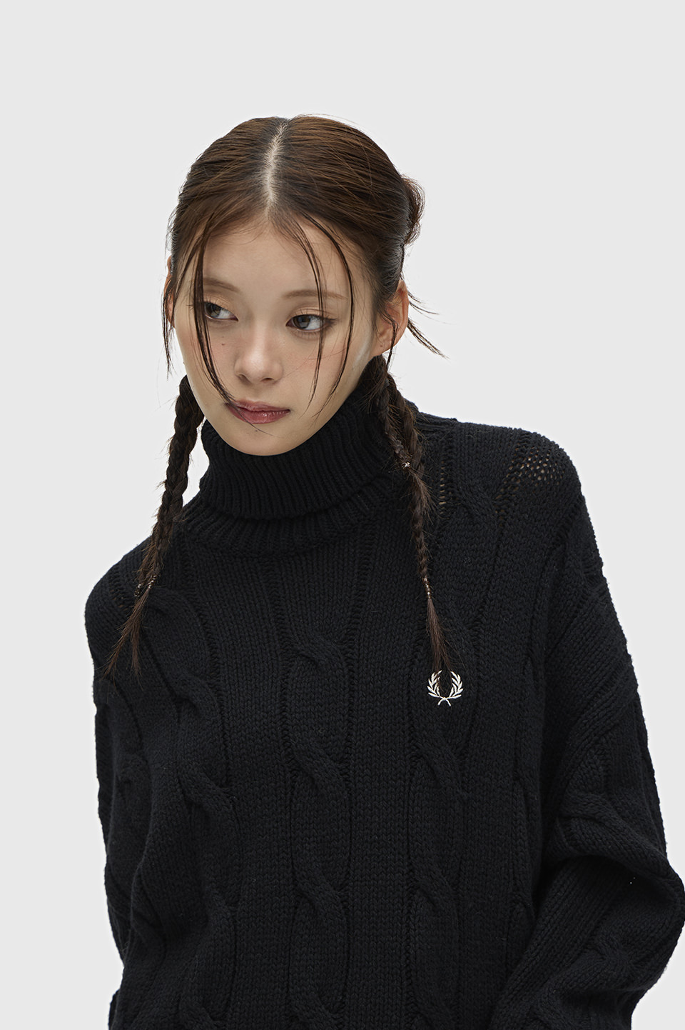 ウールナイロンの軽量の混紡糸で、ケーブル編みで仕上げたロールネックの