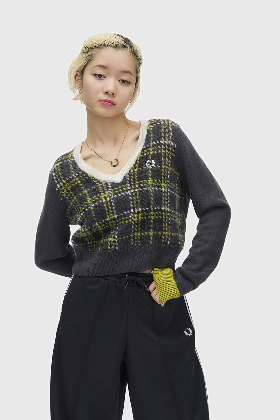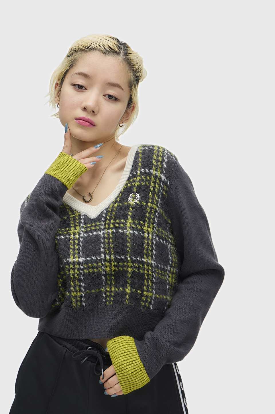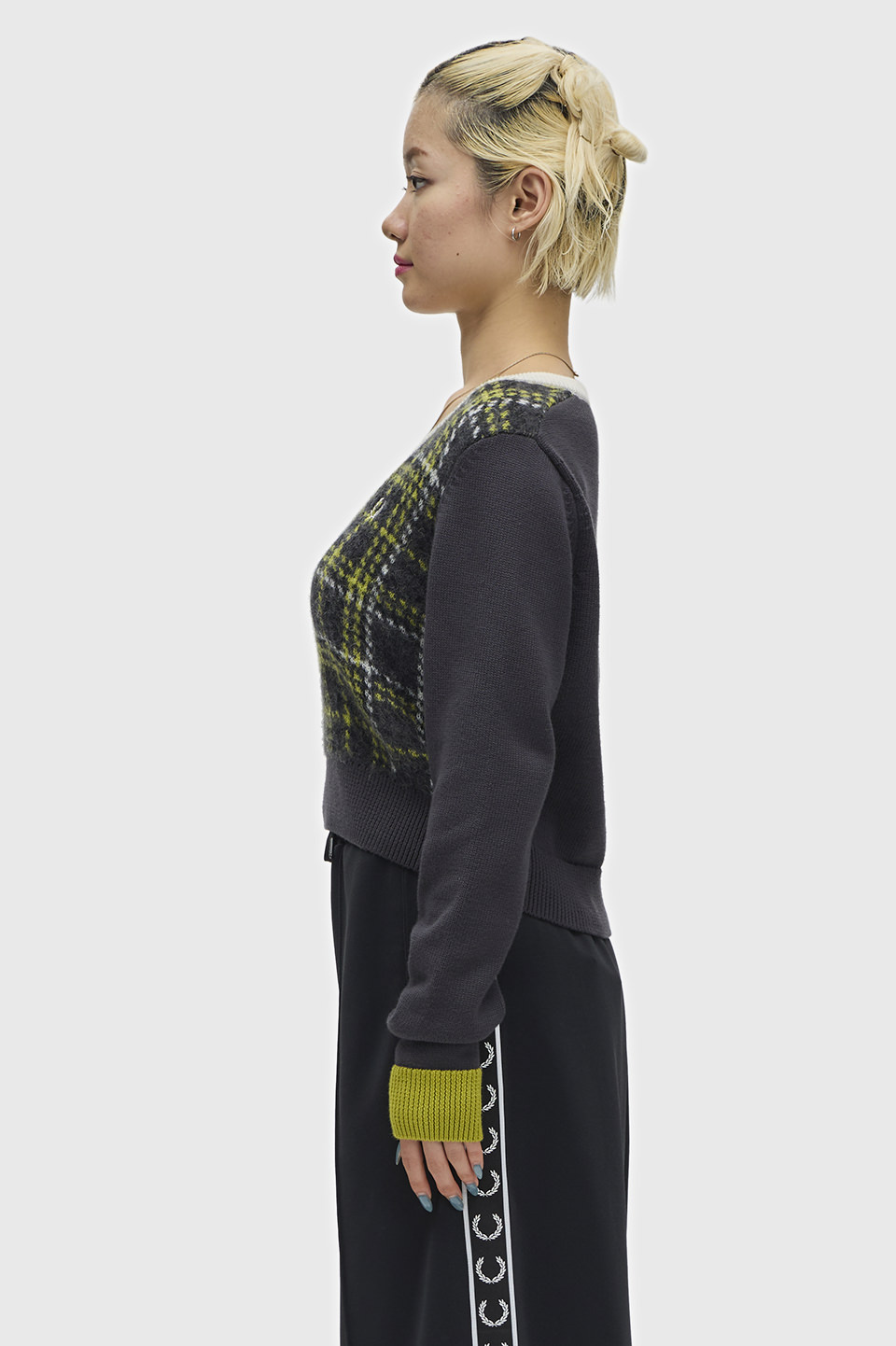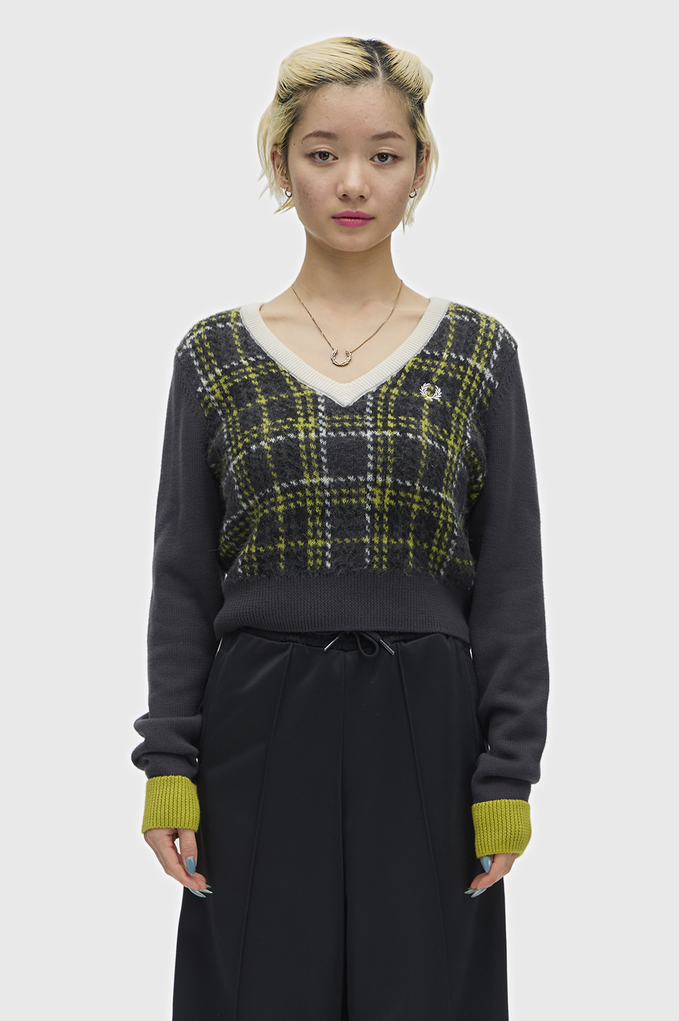 。前身頃にチェックのジャガード柄、衿と袖口を配色になっており深めのVネックがポイントです。