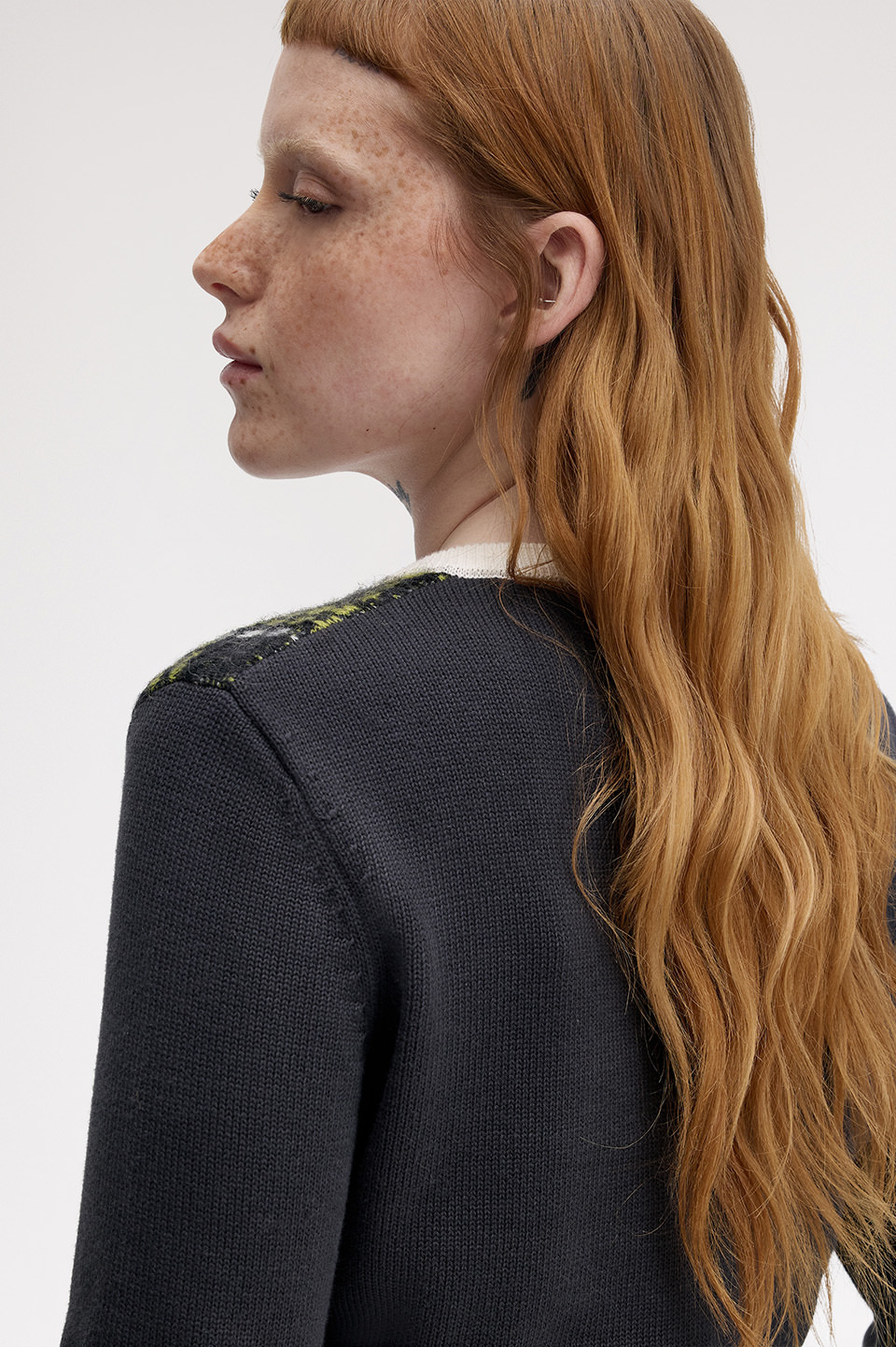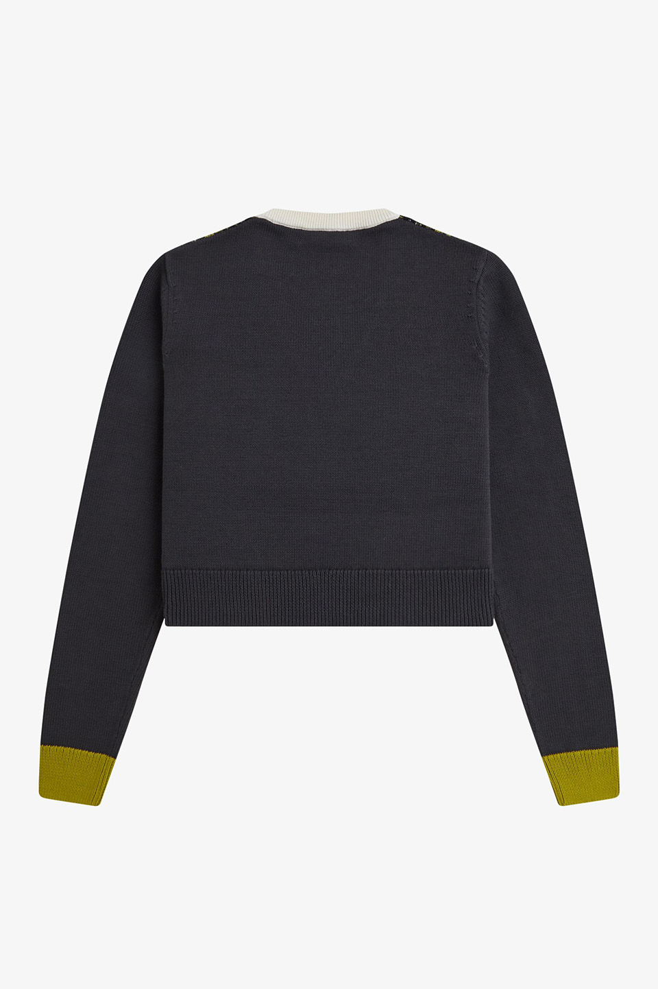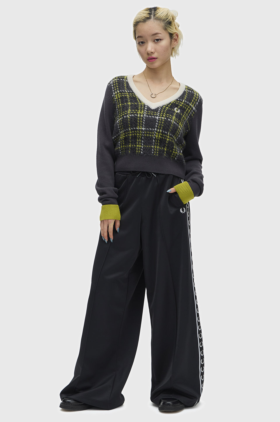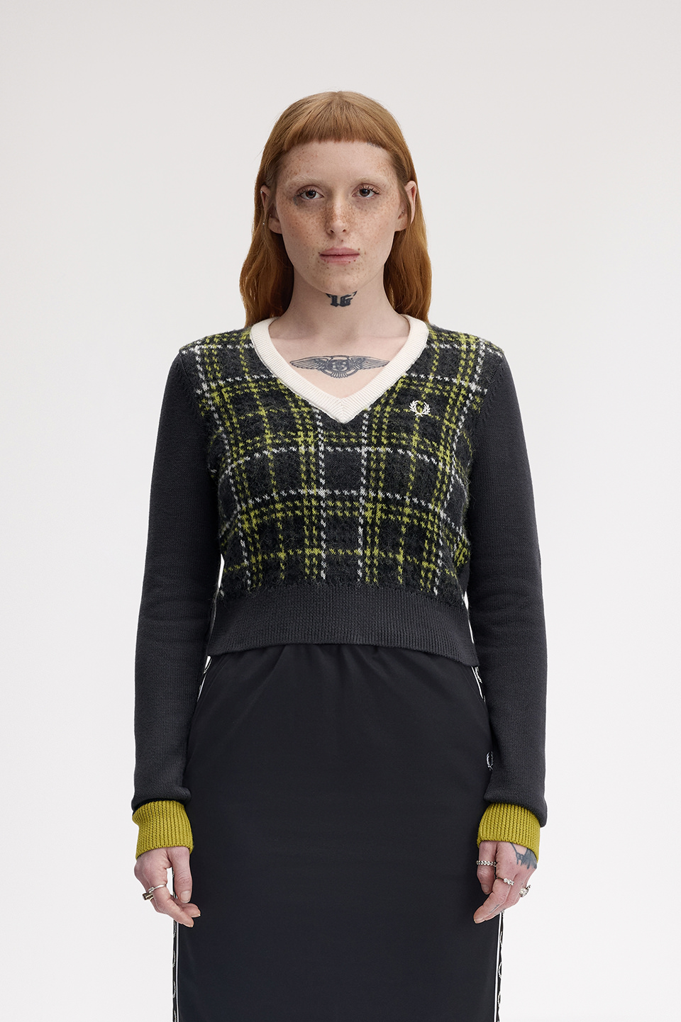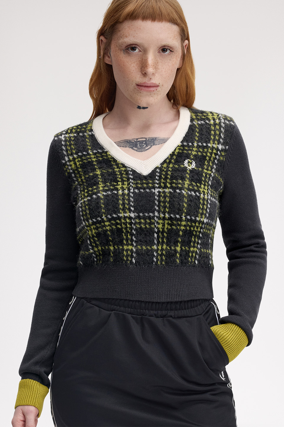 。前身頃にチェックのジャガード柄、衿と袖口を配色になっており深めのVネックがポイントです。