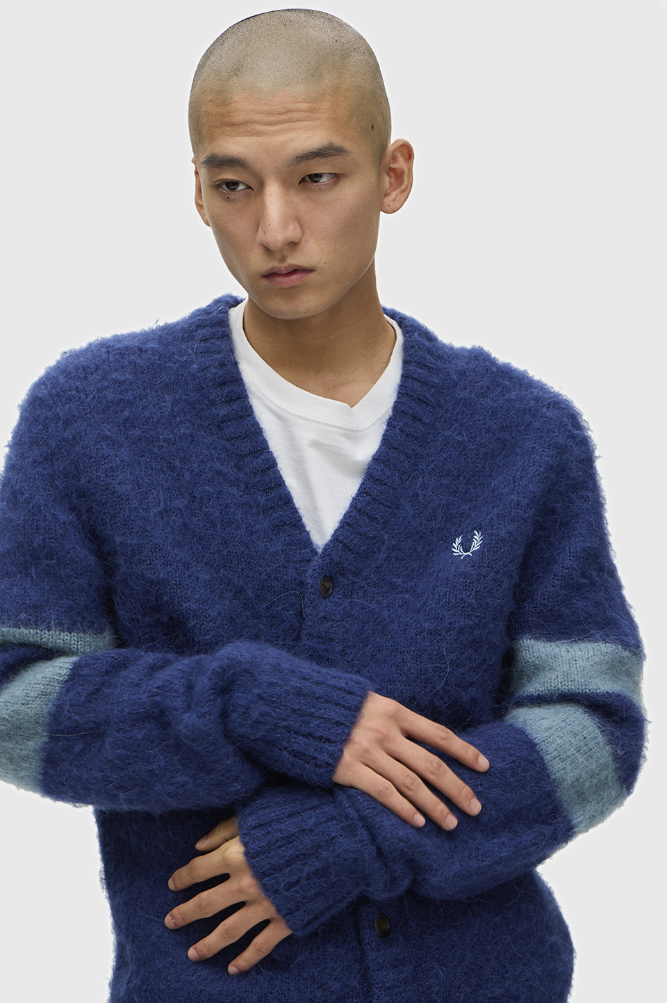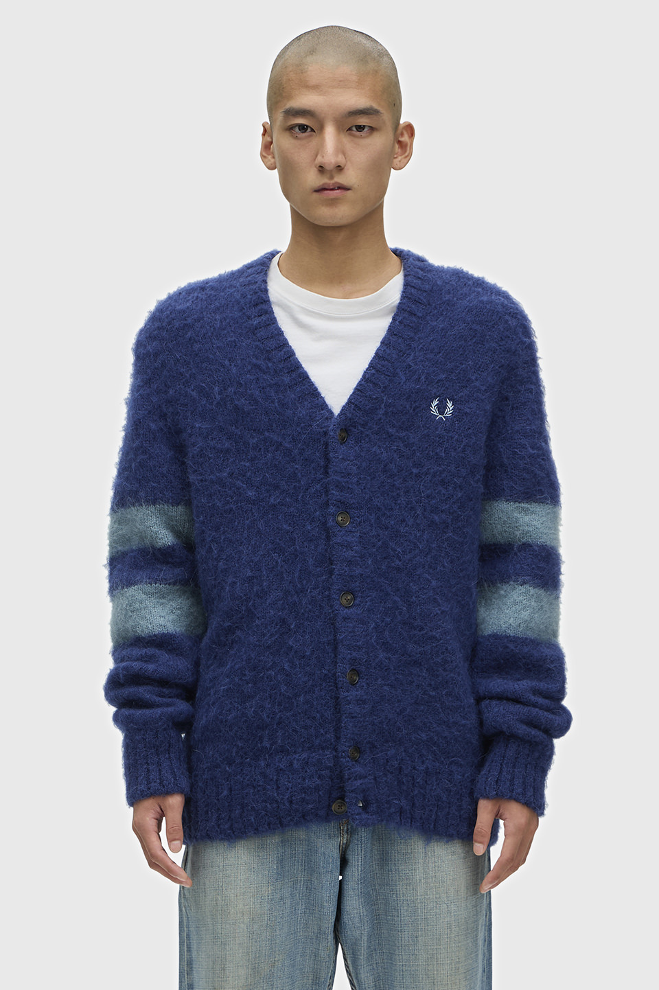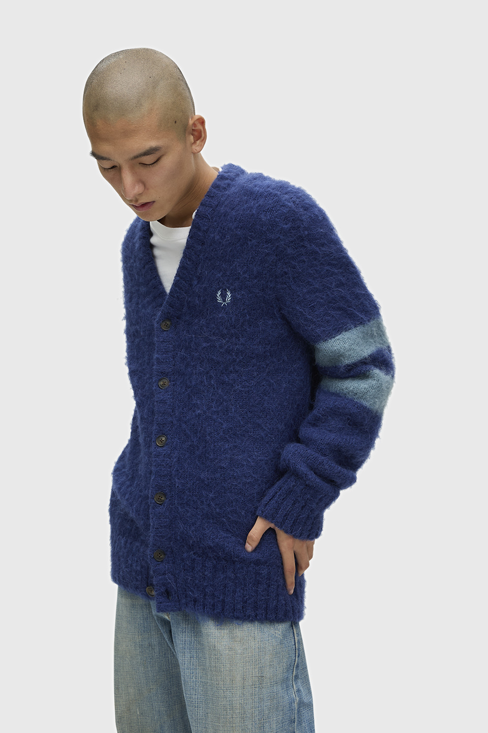 毛足の長いアルパカブレンドのカーディガン。アーム部分の5-4-4のティップラインがデザインのポイントです。