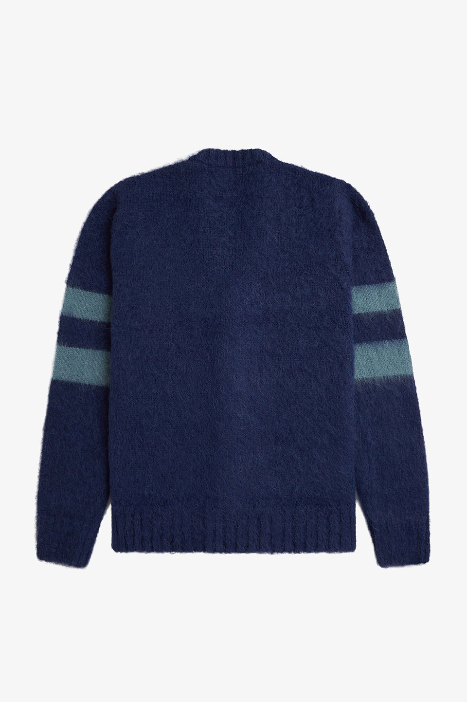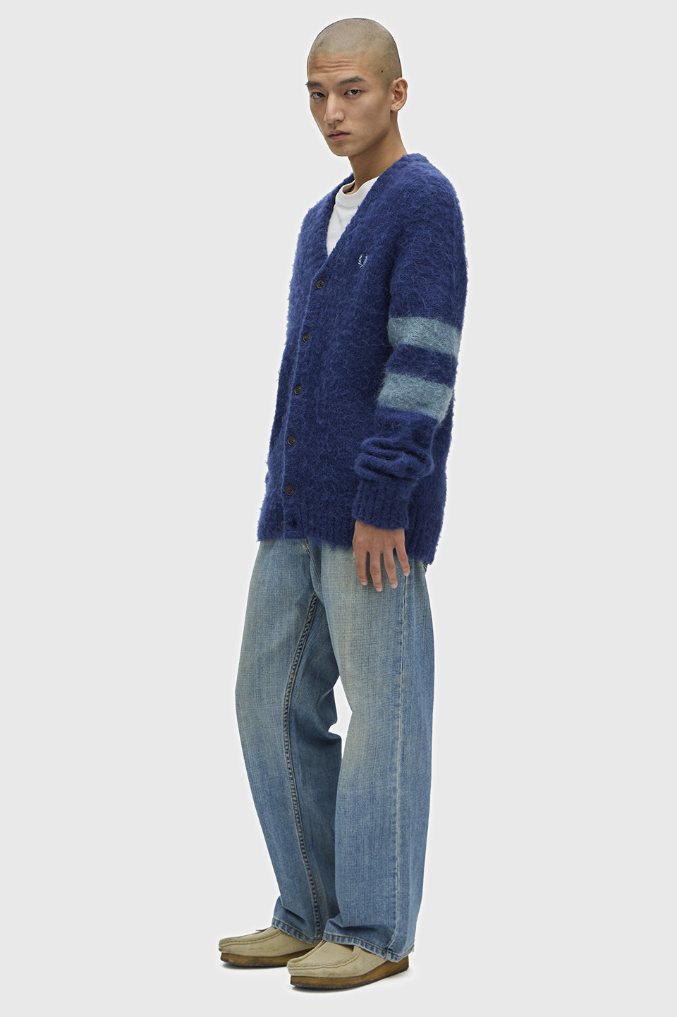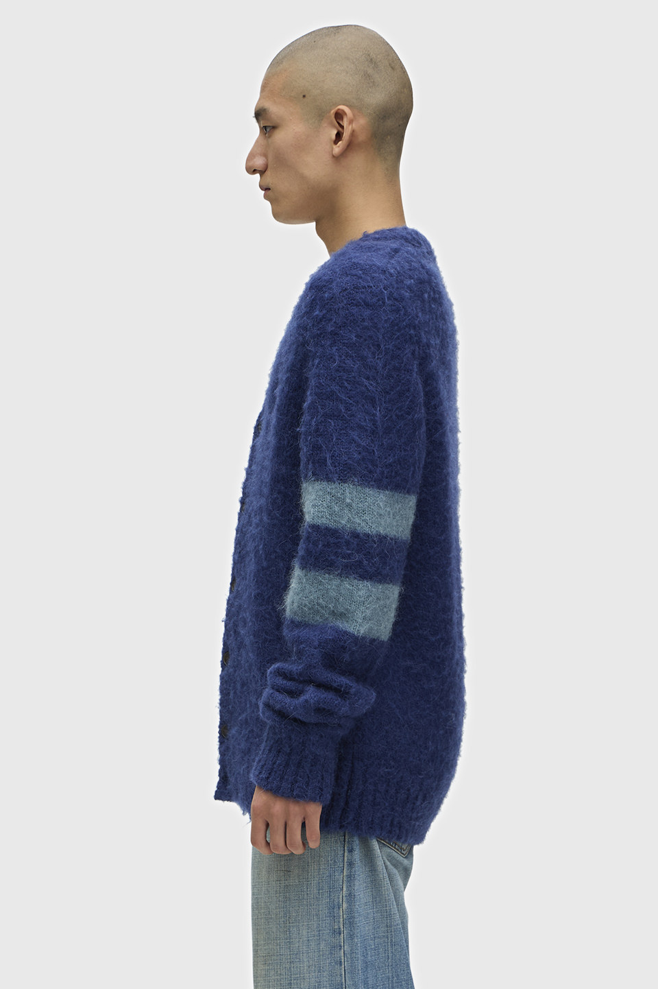 毛足の長いアルパカブレンドのカーディガン。アーム部分の5-4-4のティップラインがデザインのポイントです。