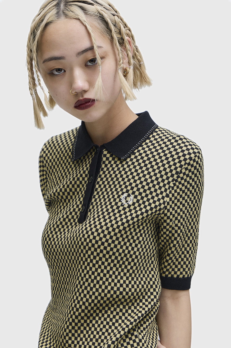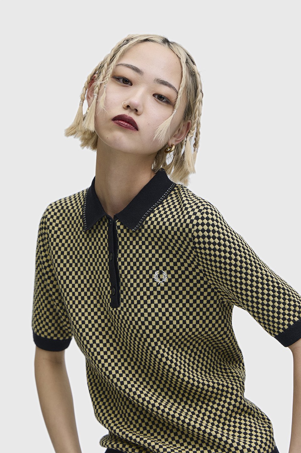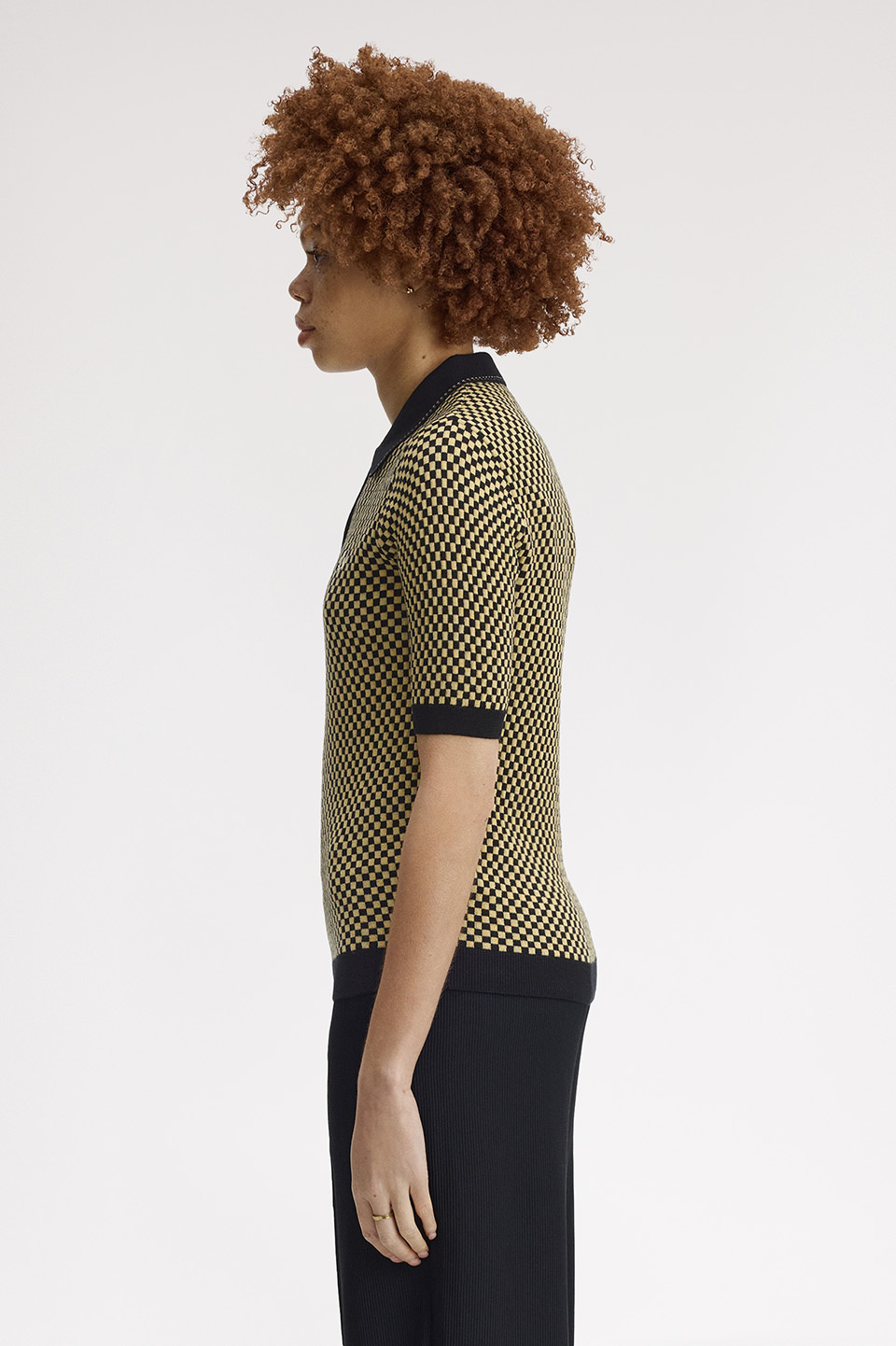 ウールとコットンを組み合わせた素材のチェッカーボード柄のニットポロシャツ。全面を凹凸感のあるチェッカー柄で編立て、襟や前立て、袖先と裾のブラックパーツが全体を引き締めています。