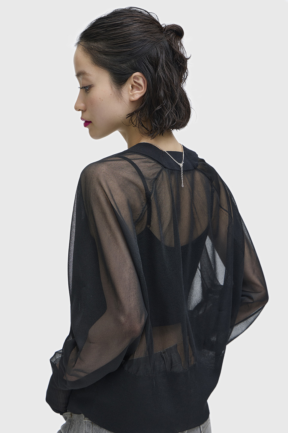 。軽やかで透け感のある素材を使用しています。レイヤードスタイルに最適な一着です。