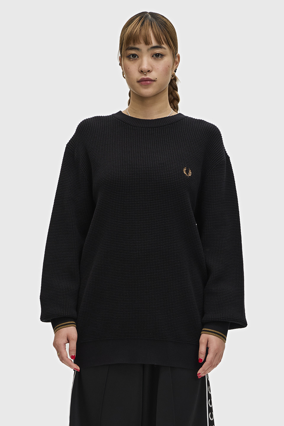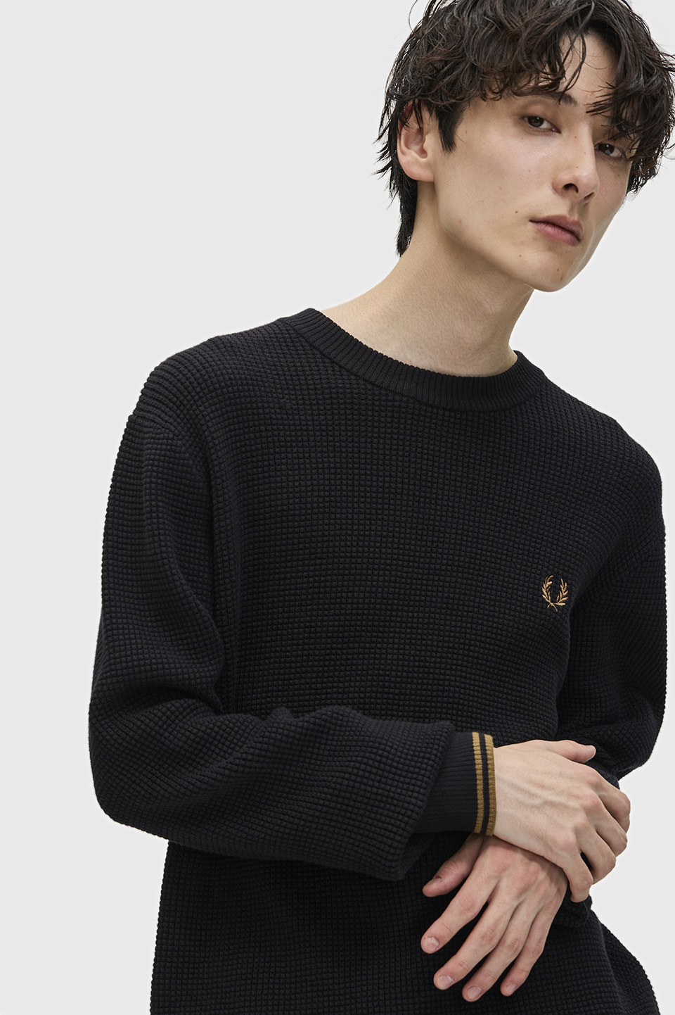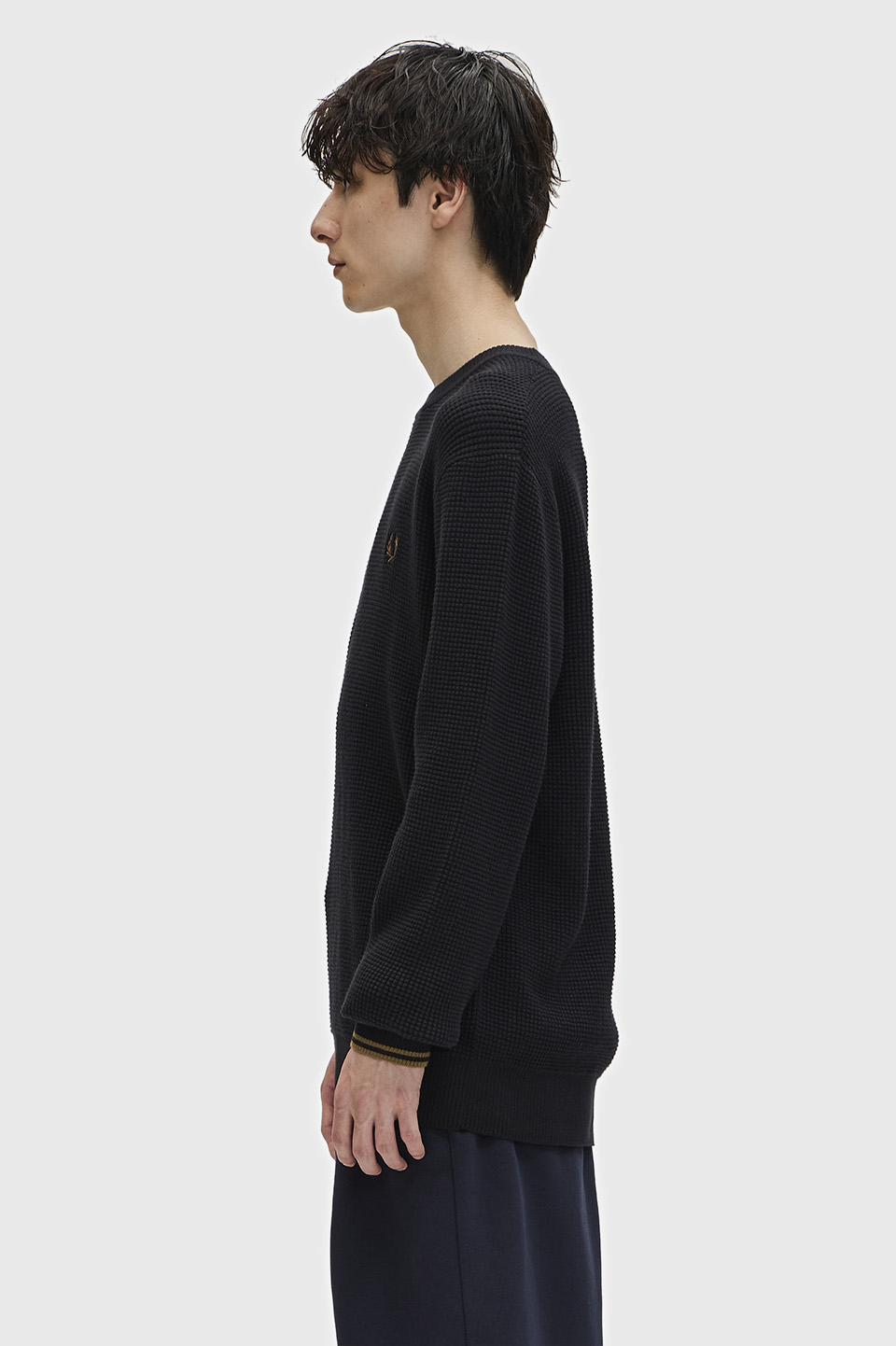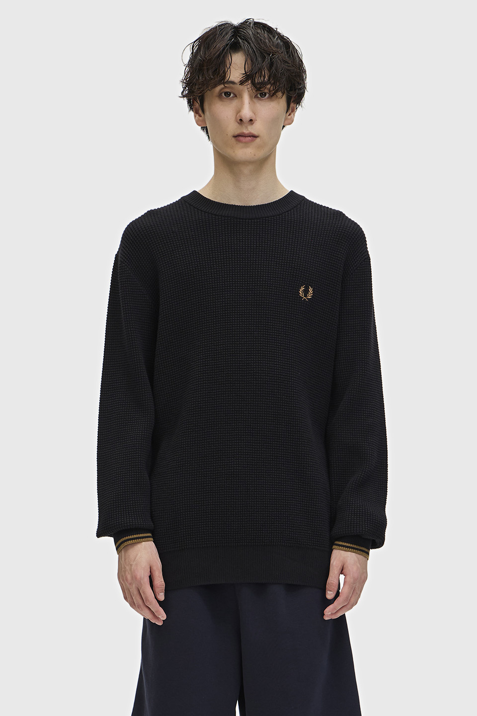 上質なコットンを使用したミドルゲージのワッフル編みクルーネックニット。