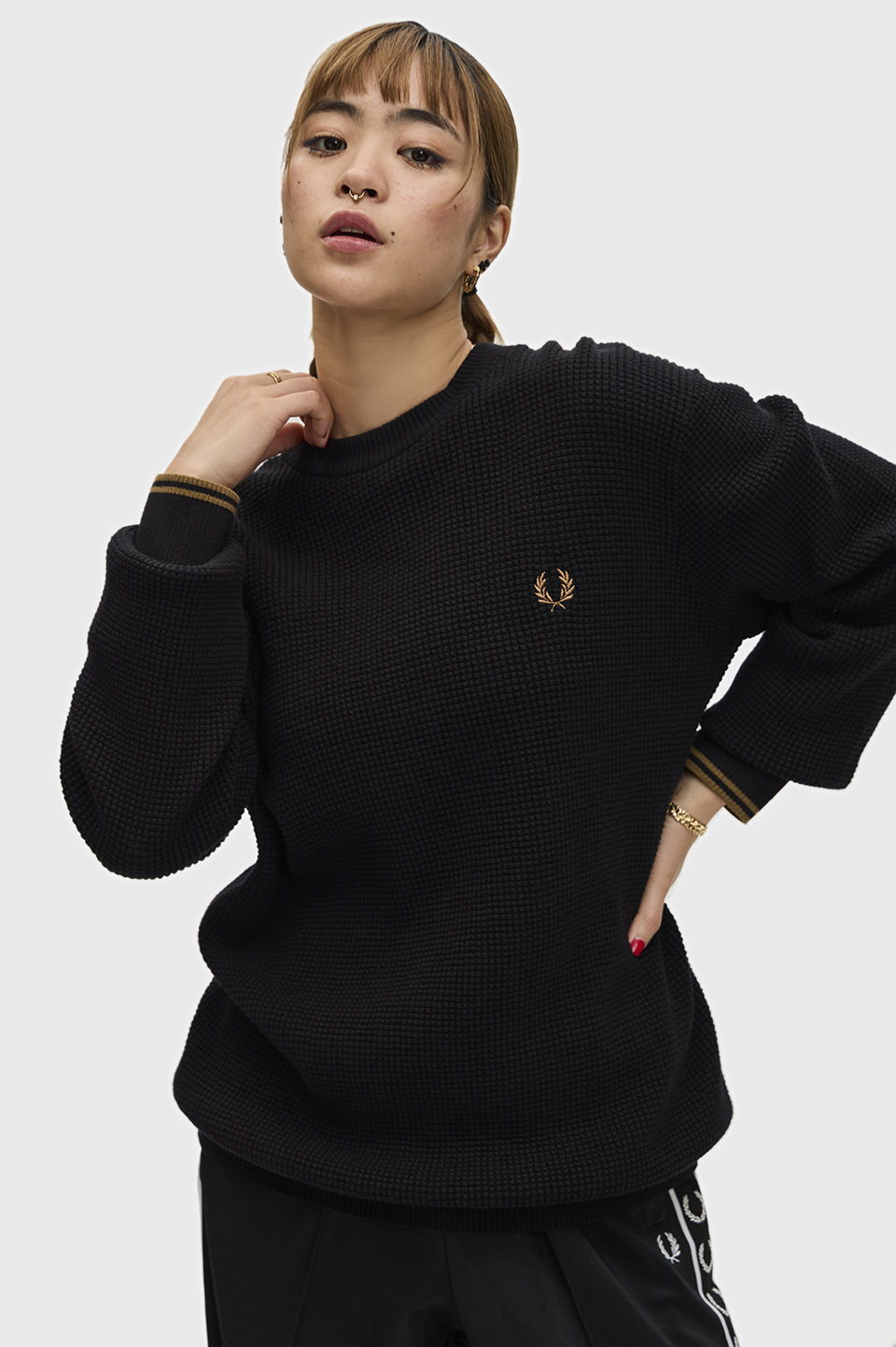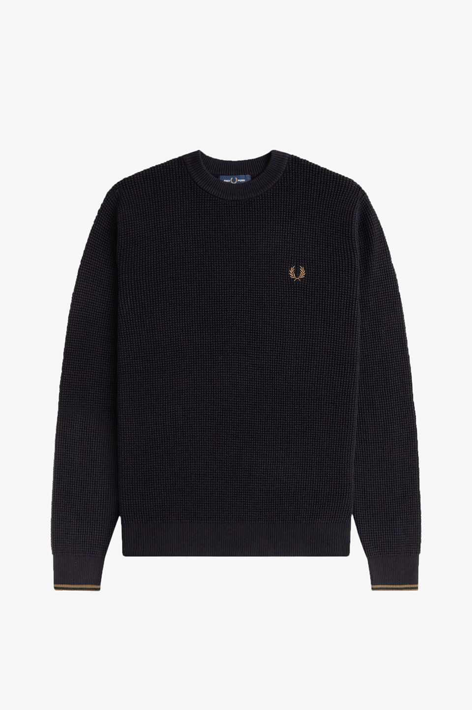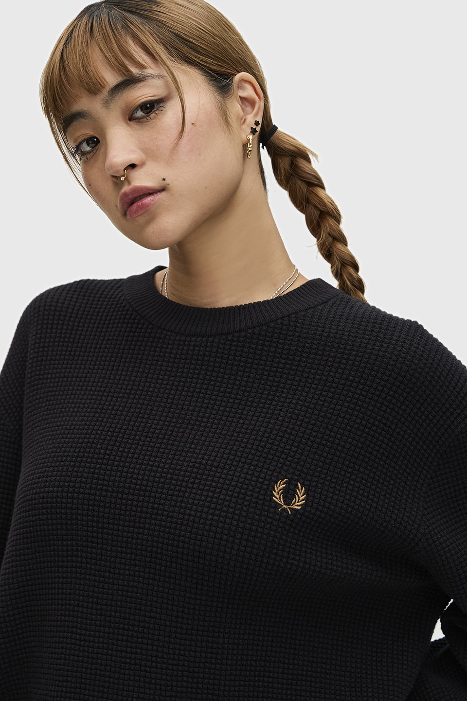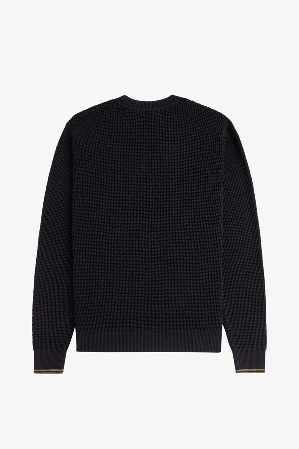 上質なコットンを使用したミドルゲージのワッフル編みクルーネックニット。
