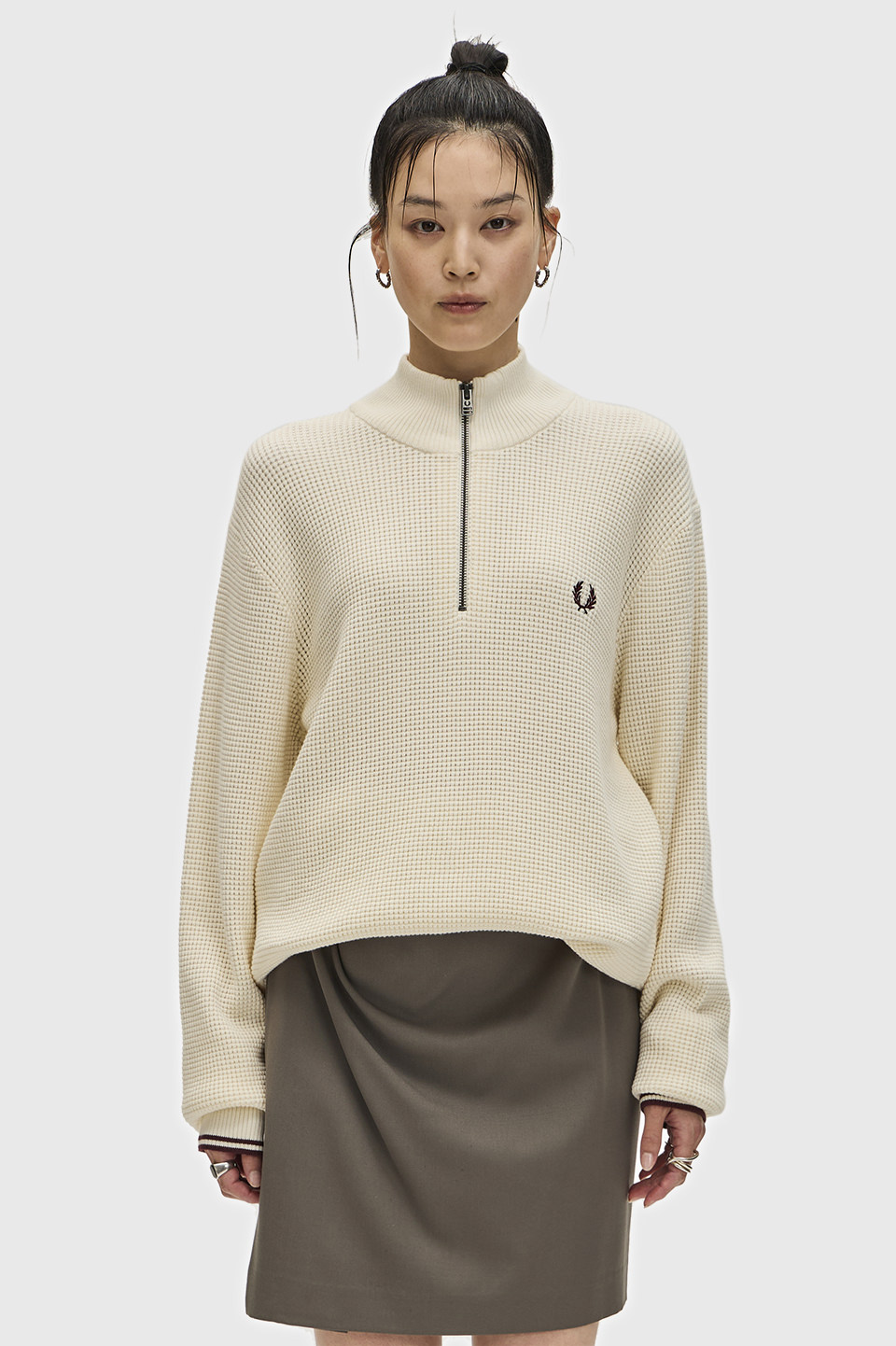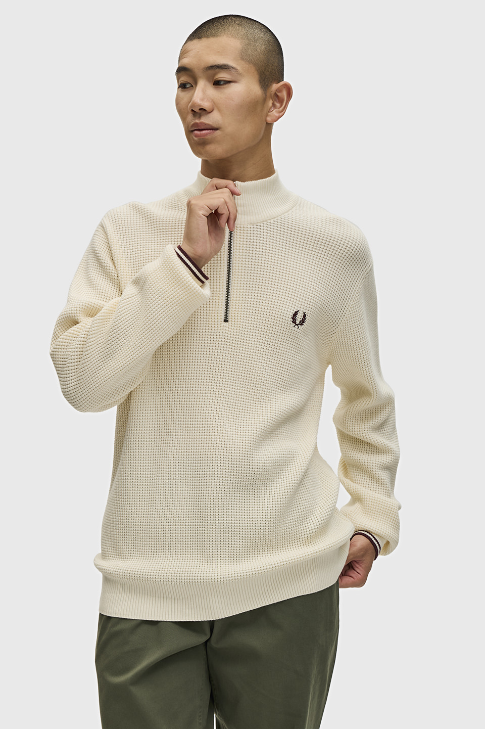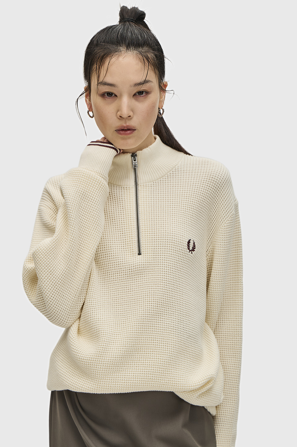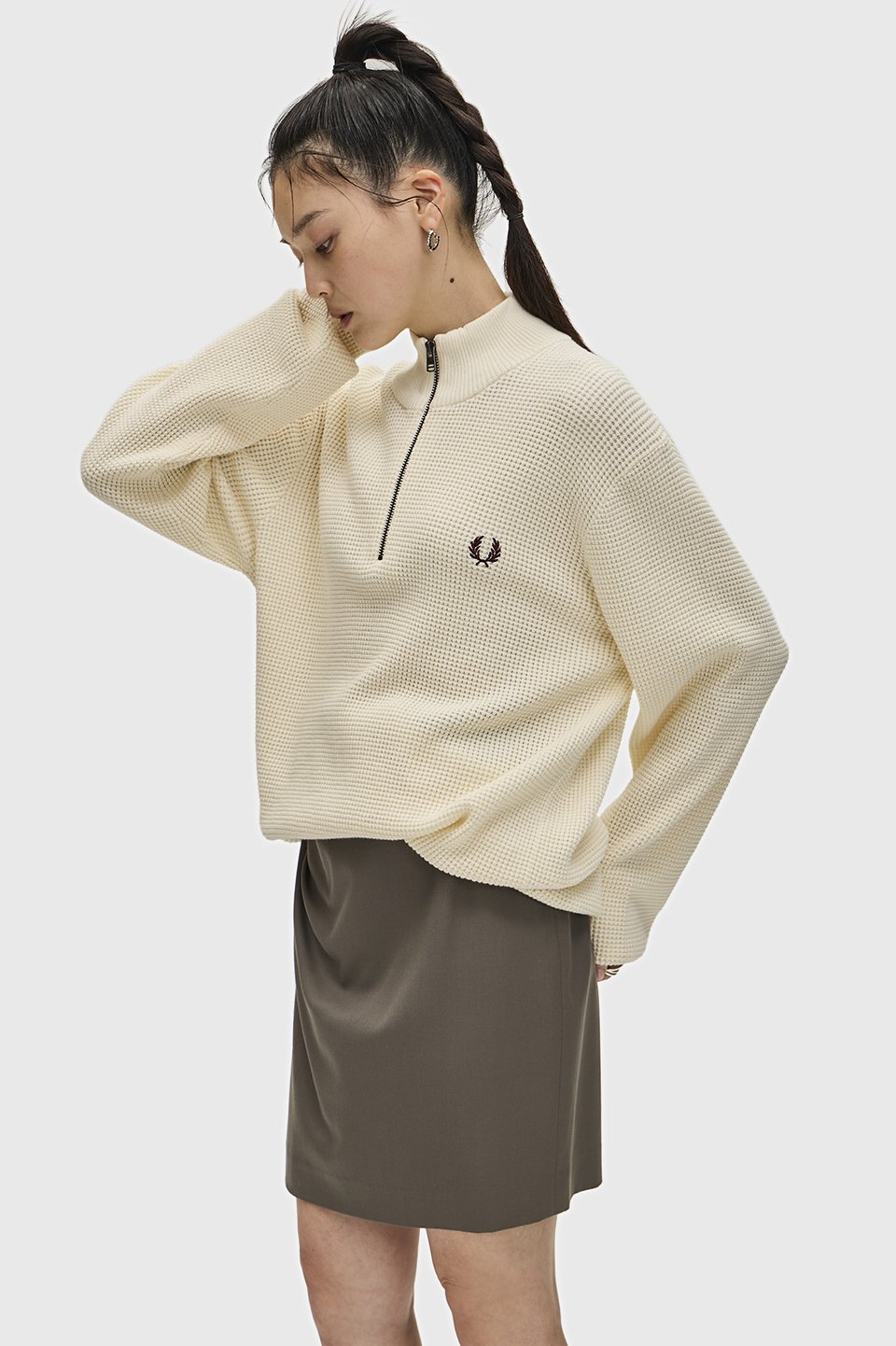上質なコットンを使用したミドルゲージのワッフル編みのハーフジップニット。袖口にはローレル刺繍と同色のティップラインをあしらい、アクセントにしています。