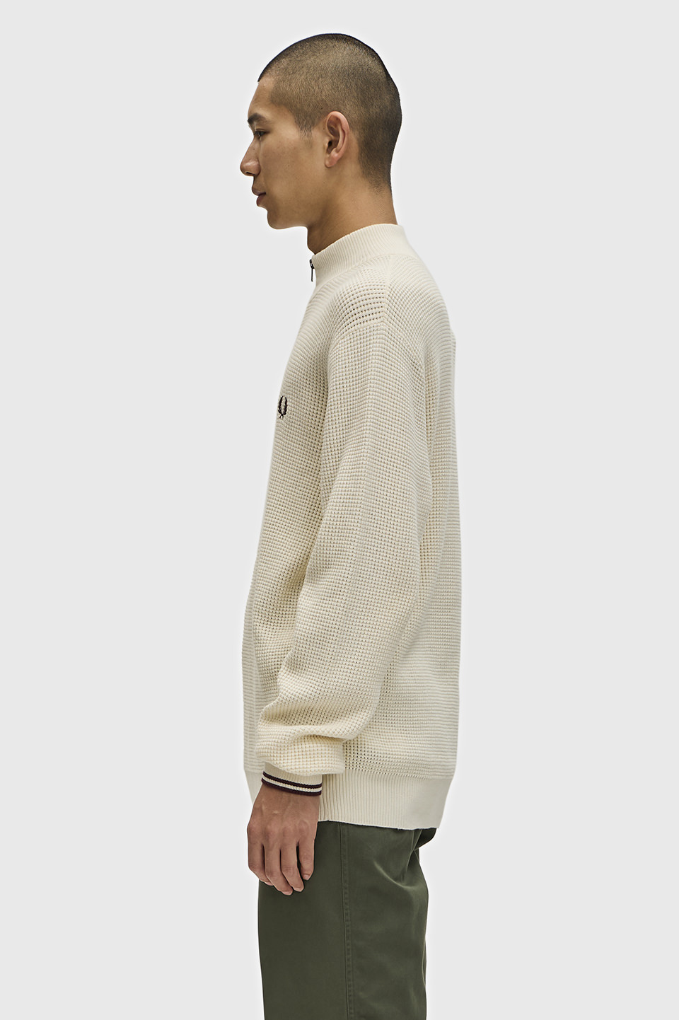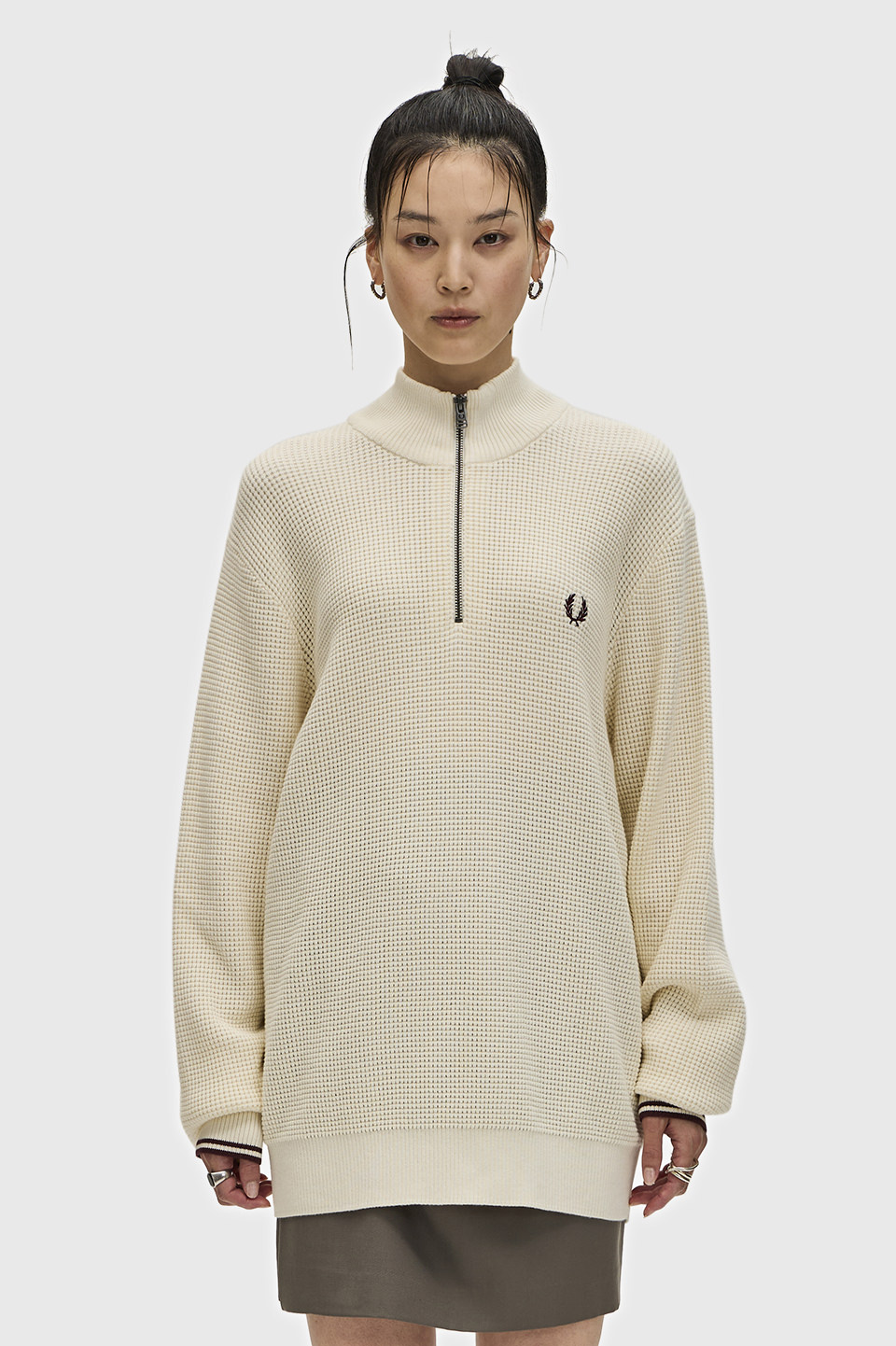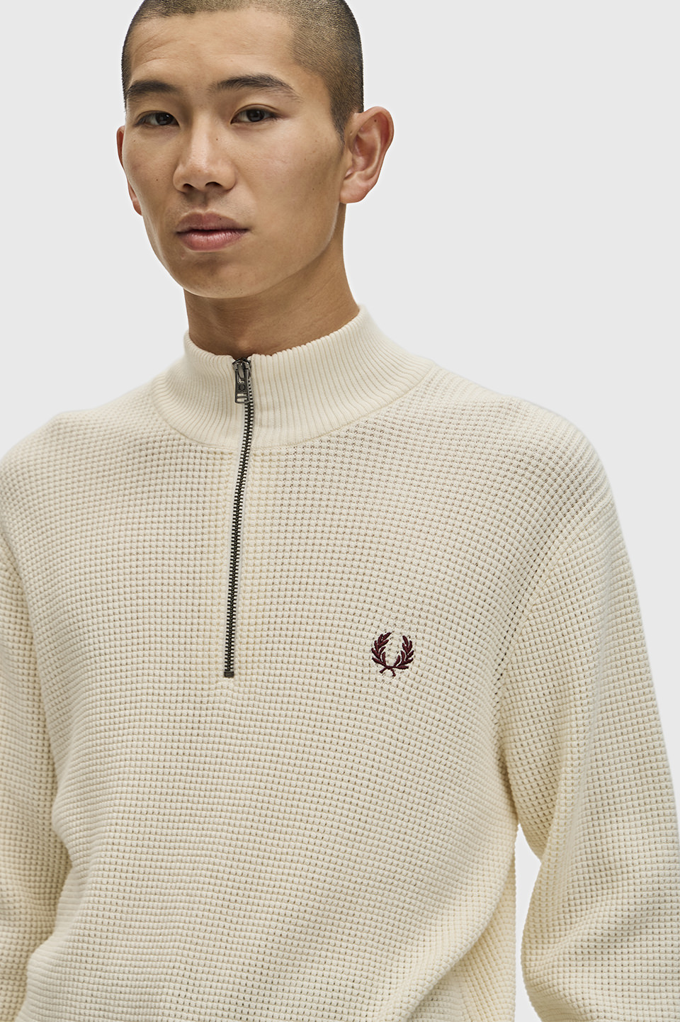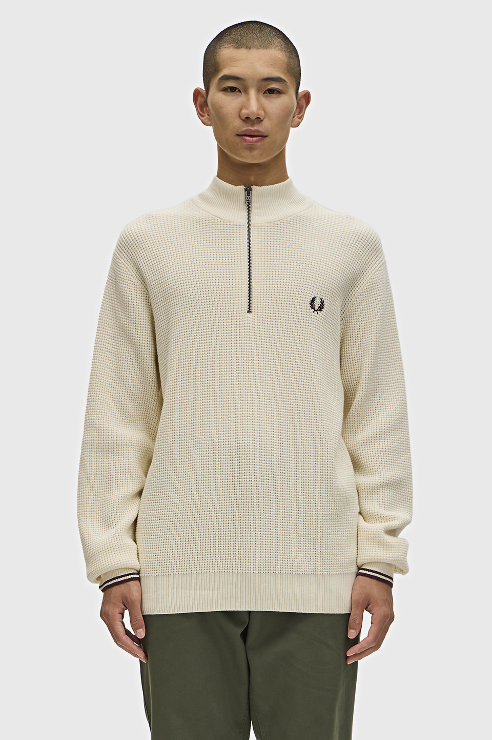 上質なコットンを使用したミドルゲージのワッフル編みのハーフジップニット。袖口にはローレル刺繍と同色のティップラインをあしらい、アクセントにしています。