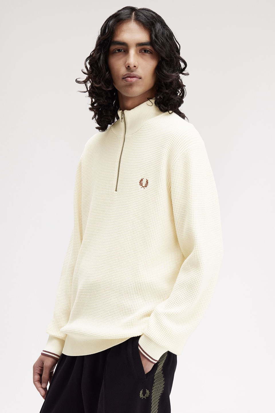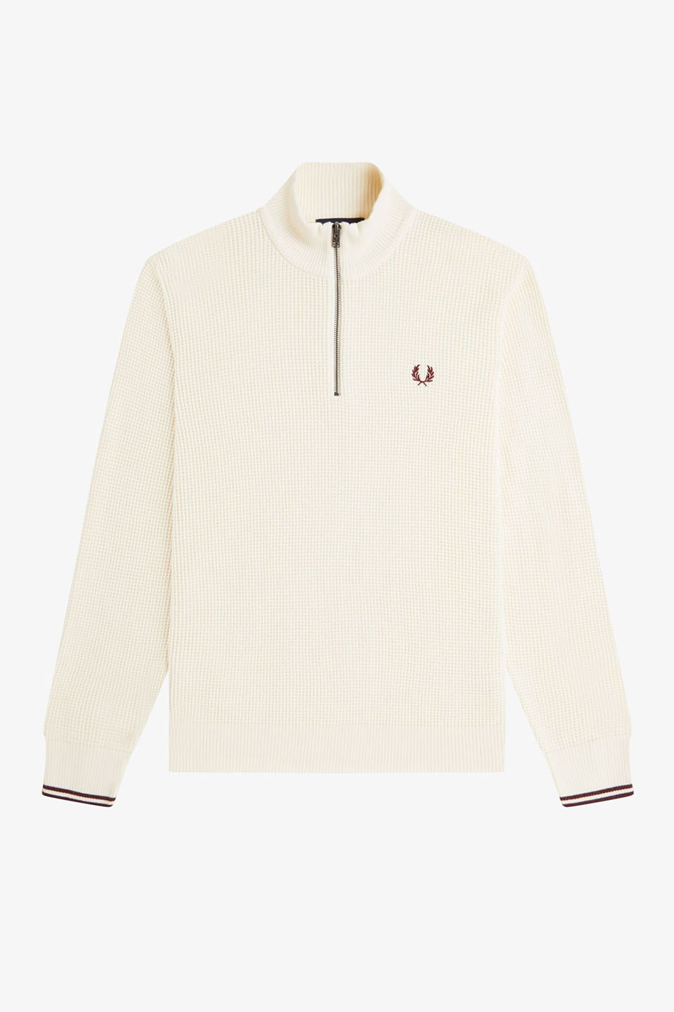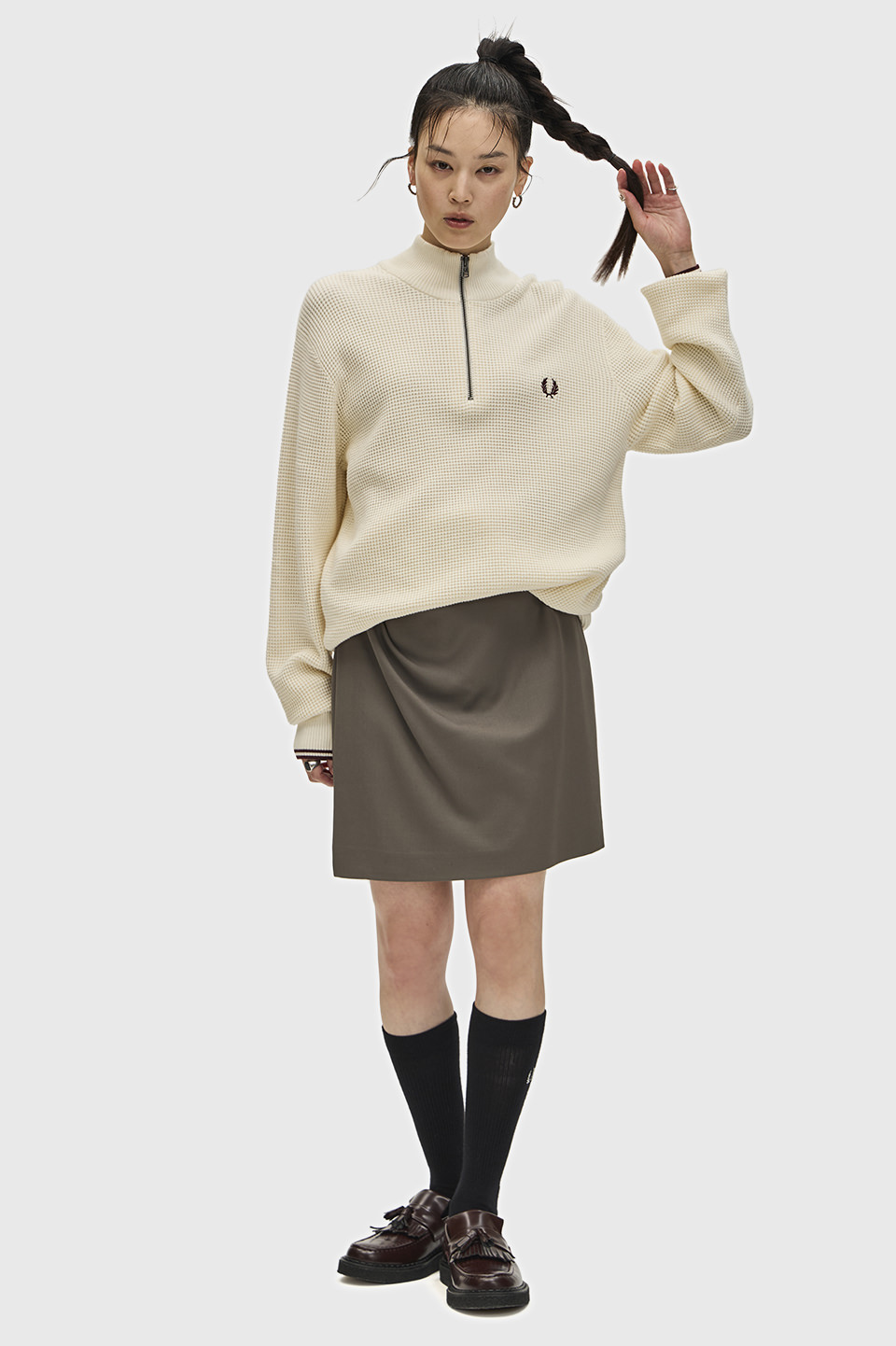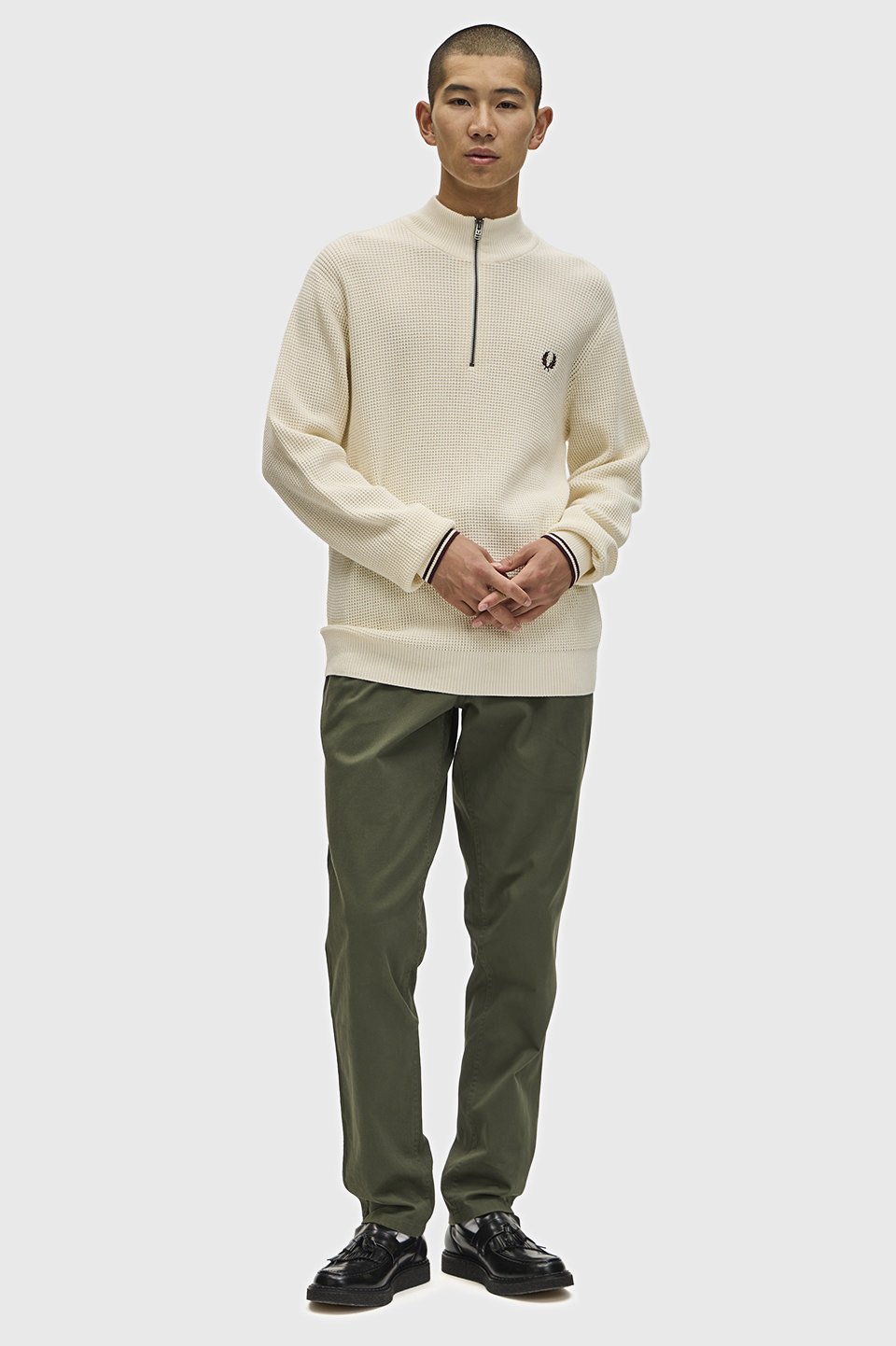 上質なコットンを使用したミドルゲージのワッフル編みのハーフジップニット。袖口にはローレル刺繍と同色のティップラインをあしらい、アクセントにしています。