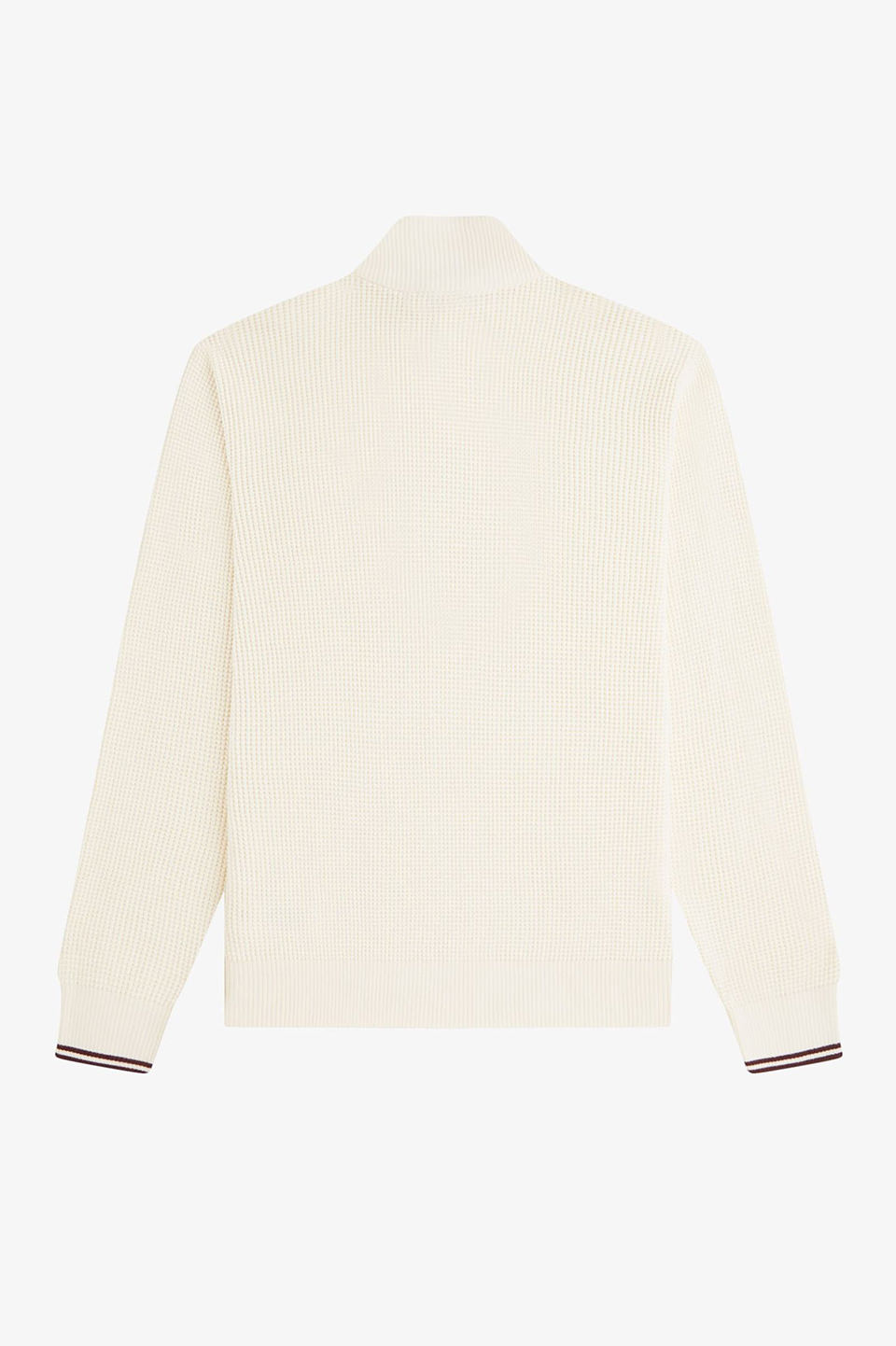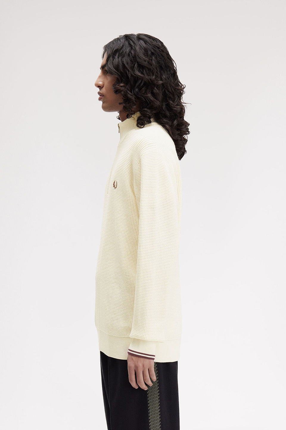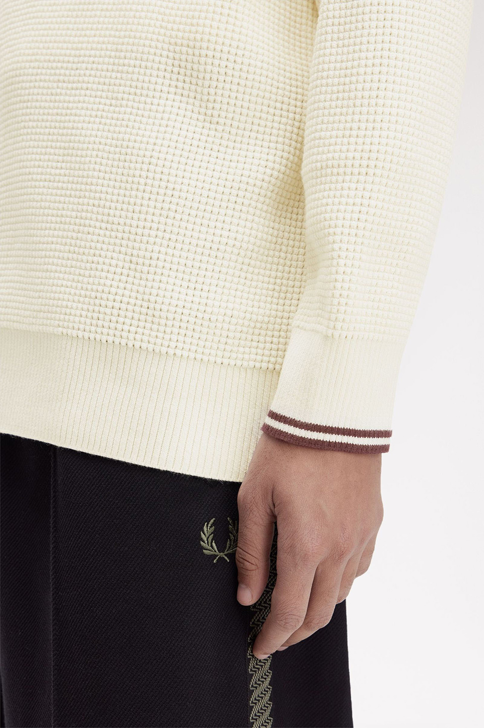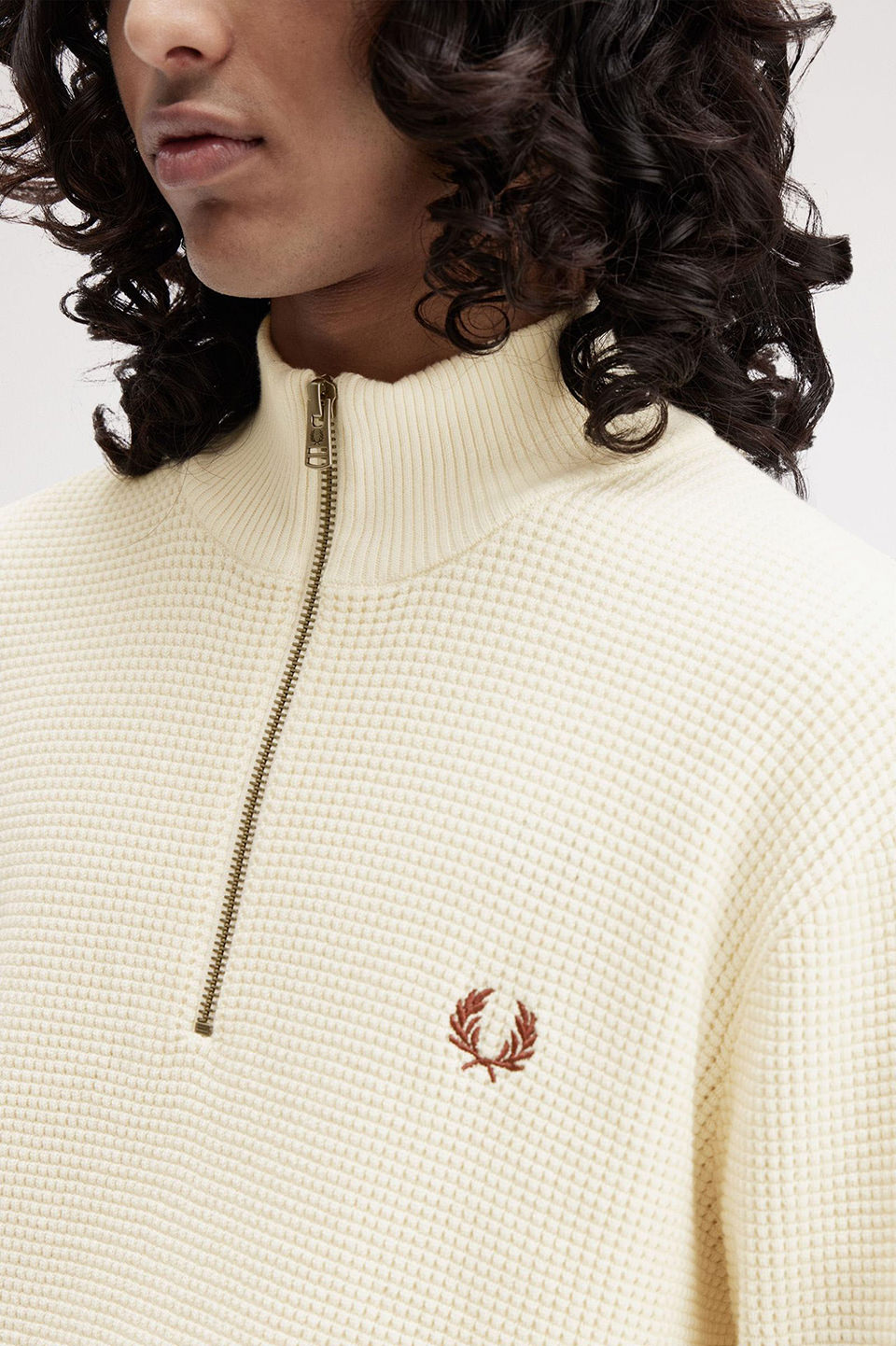 上質なコットンを使用したミドルゲージのワッフル編みのハーフジップニット。袖口にはローレル刺繍と同色のティップラインをあしらい、アクセントにしています。