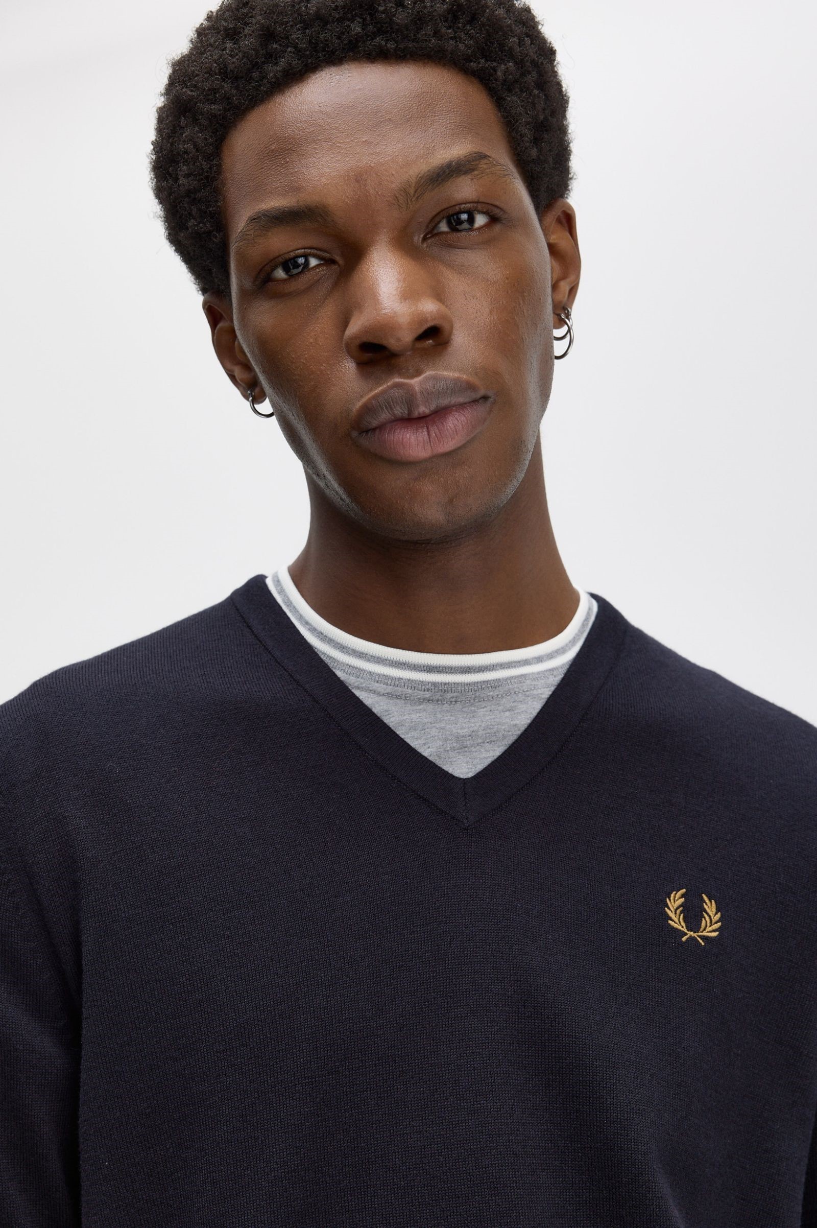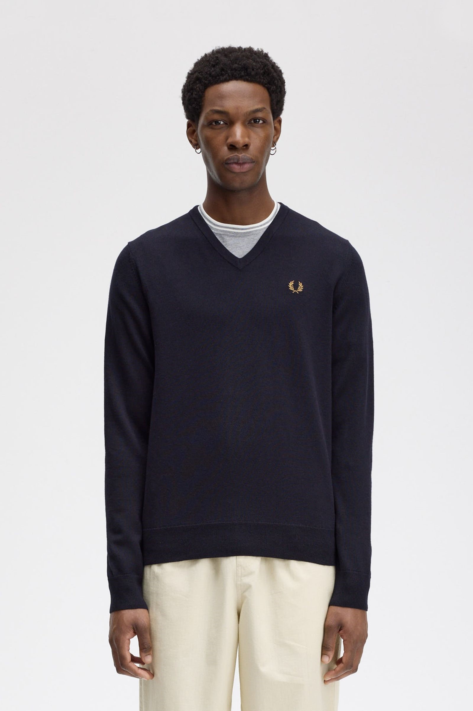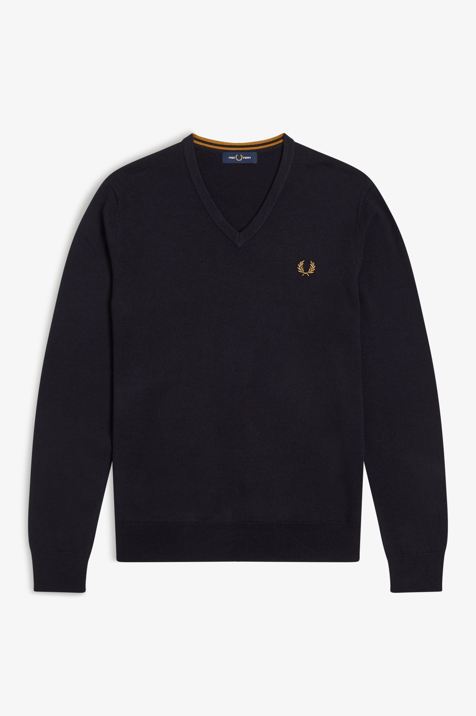 メリノウールとコットンのブレンド素材を使用した、フレッドペリーのクラシックなVネックニット。ネックの内側にはティップラインをあしらい、さらにカラーマッチするローレルリースの刺繍で仕上げました。