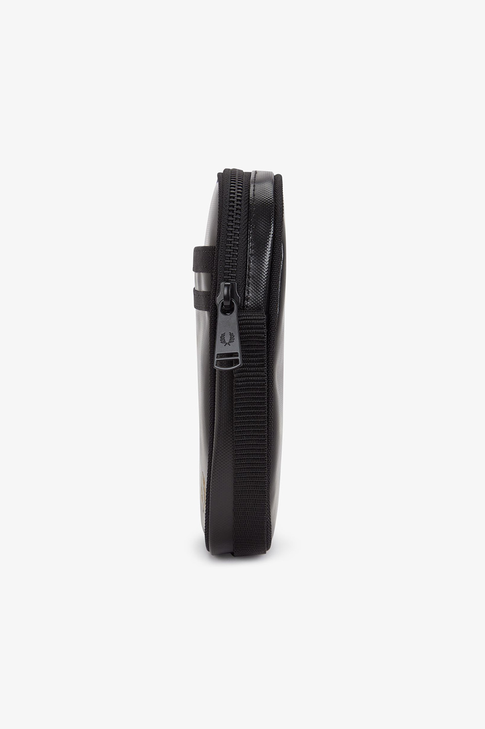 全体をブラックカラーで統一し、モダンな印象に仕上げました。フロントに施した同色のティップラインや、ゴールドのローレルマークがポイントです。ジップの引手にはローレルマークが刻印されています。