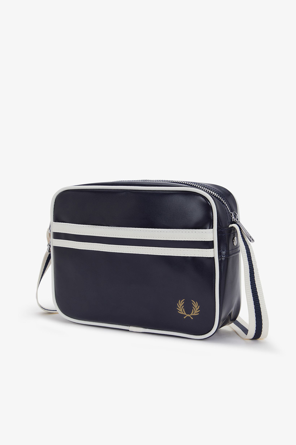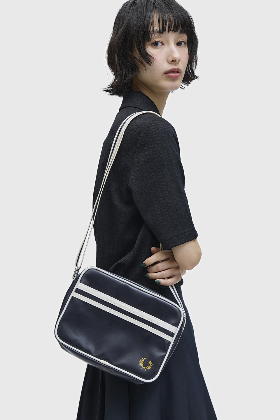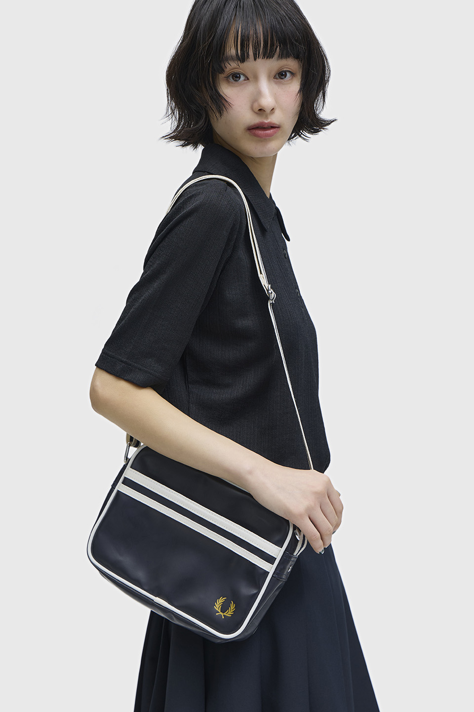 しっかりとしたマチ付きのスクエア型デザイン。外ポケットに施したコントラストカラーのティップラインや、ゴールドのローレルマークがデザインポイントになっています。ショルダーストラップにもティッピングを施し、スポーティな印象に仕上げました。ジップの引手にはローレルマークが刻印されています。