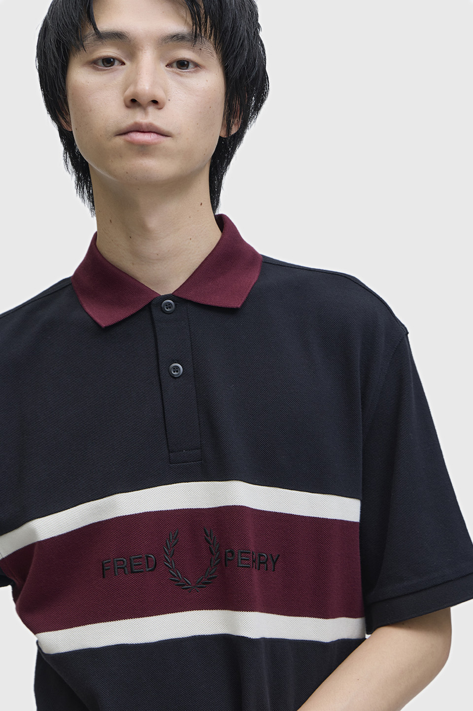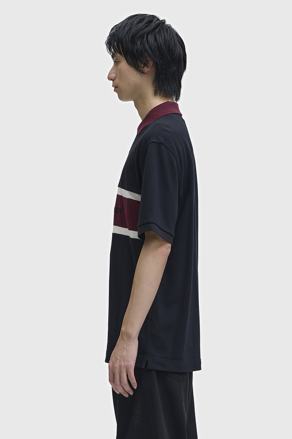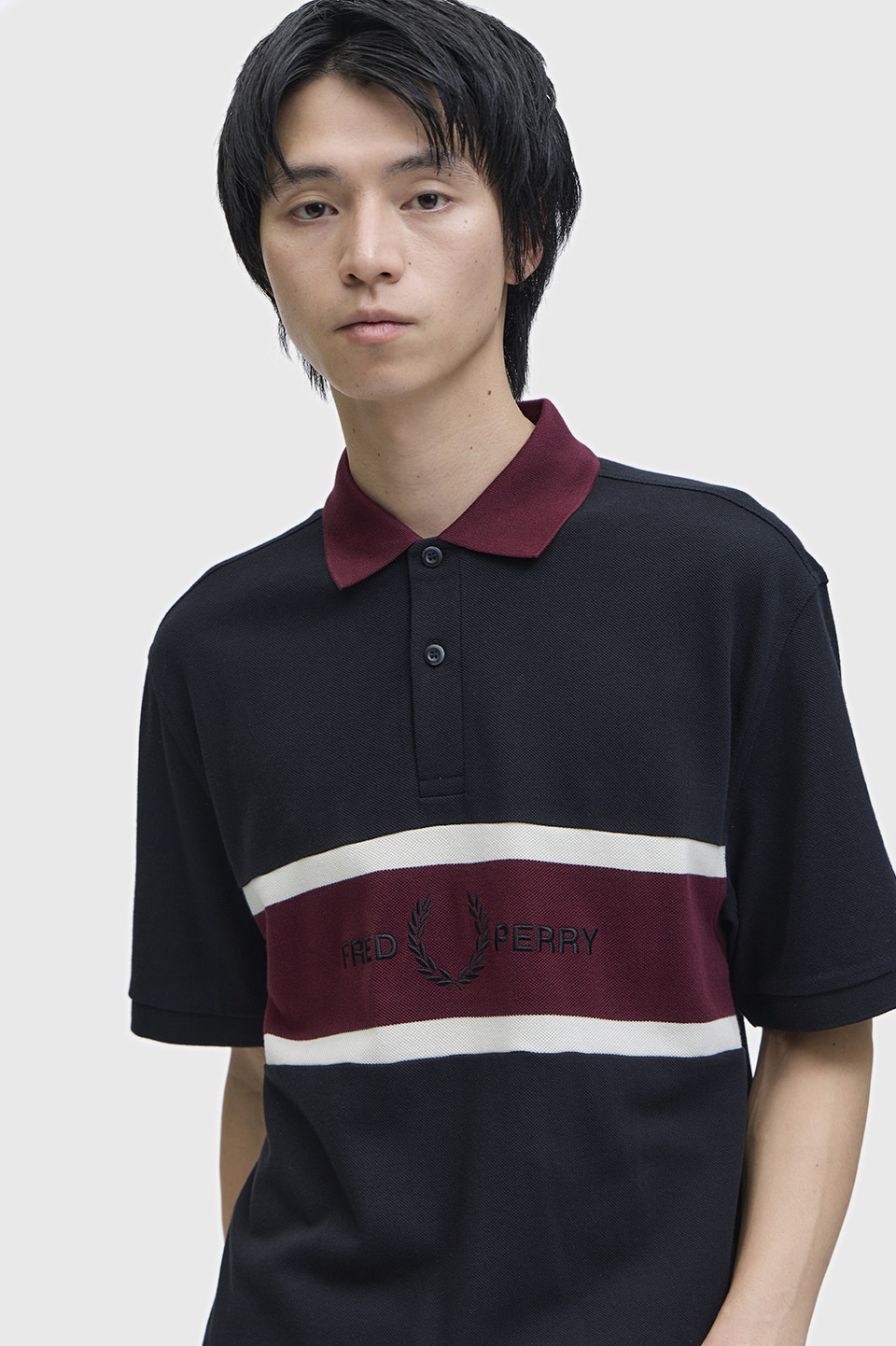 コットン鹿の子素材を使用した、リラックス感のあるポロシャツ。フロントにコントラストの効いたパネルデザインをあしらい、スポーツウェアの要素を取り入れています。