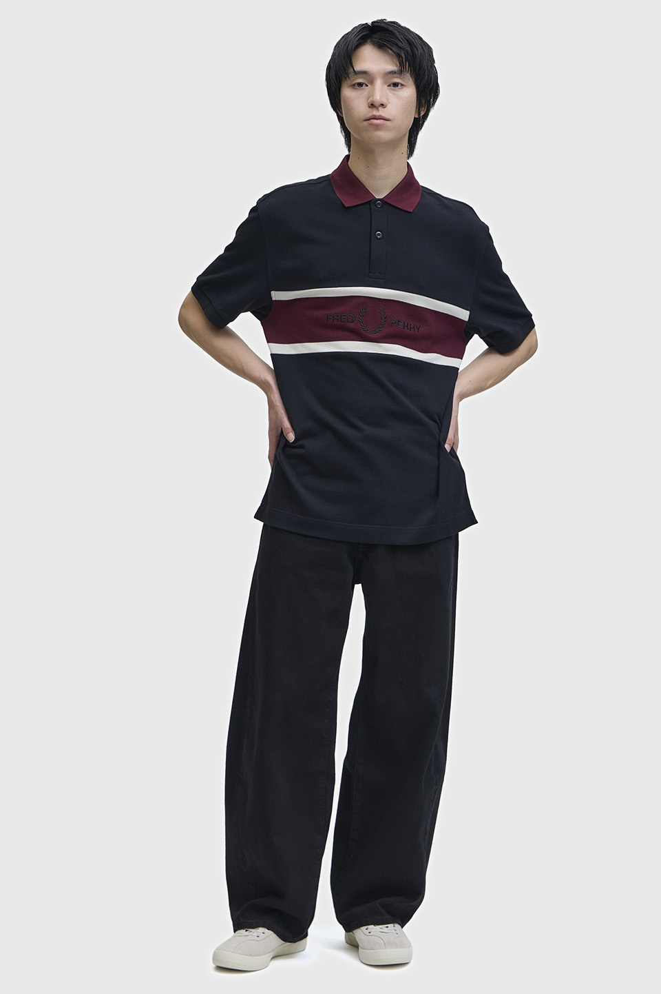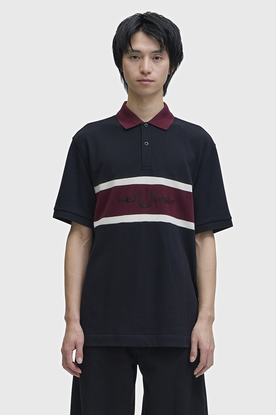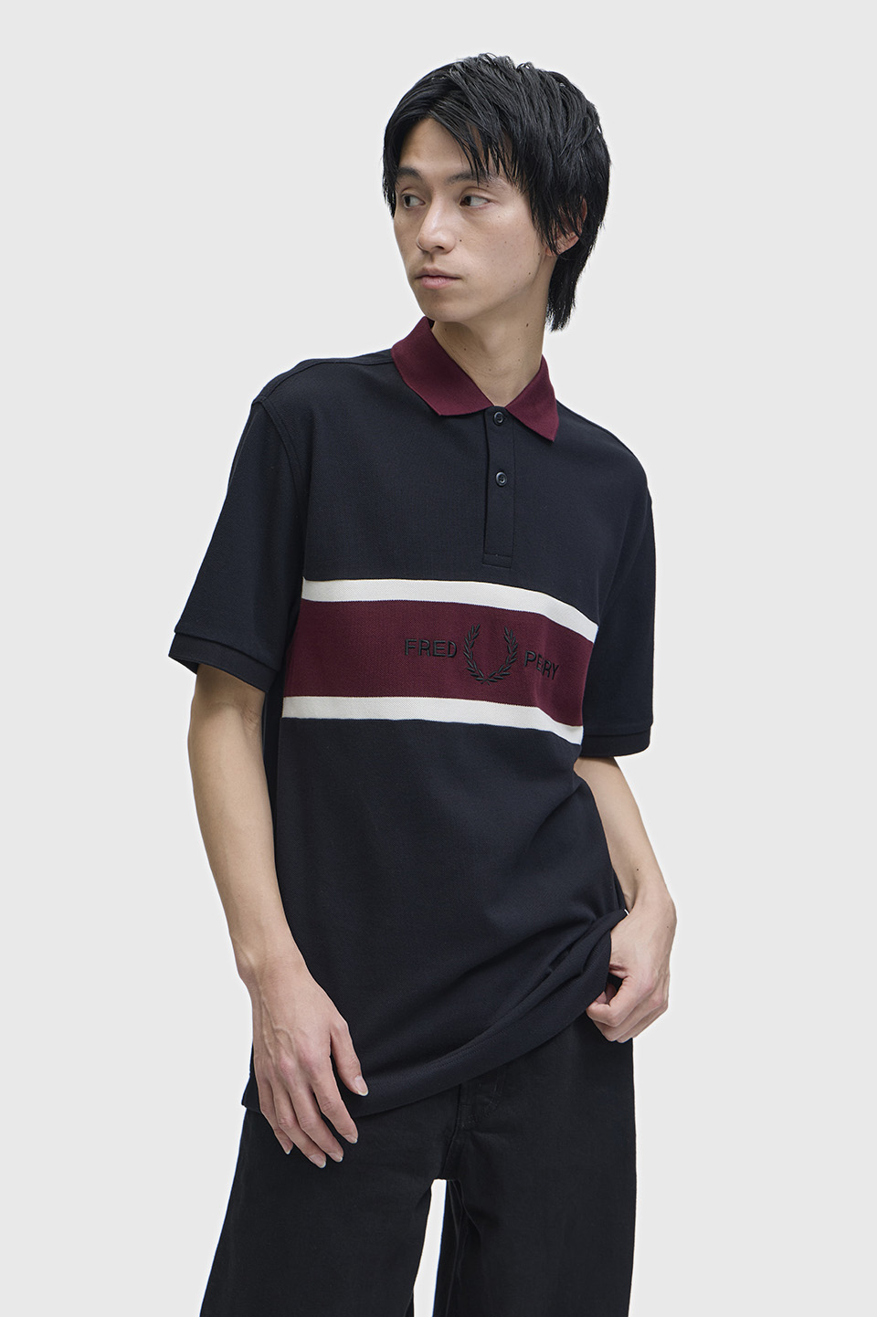 コットン鹿の子素材を使用した、リラックス感のあるポロシャツ。フロントにコントラストの効いたパネルデザインをあしらい、スポーツウェアの要素を取り入れています。