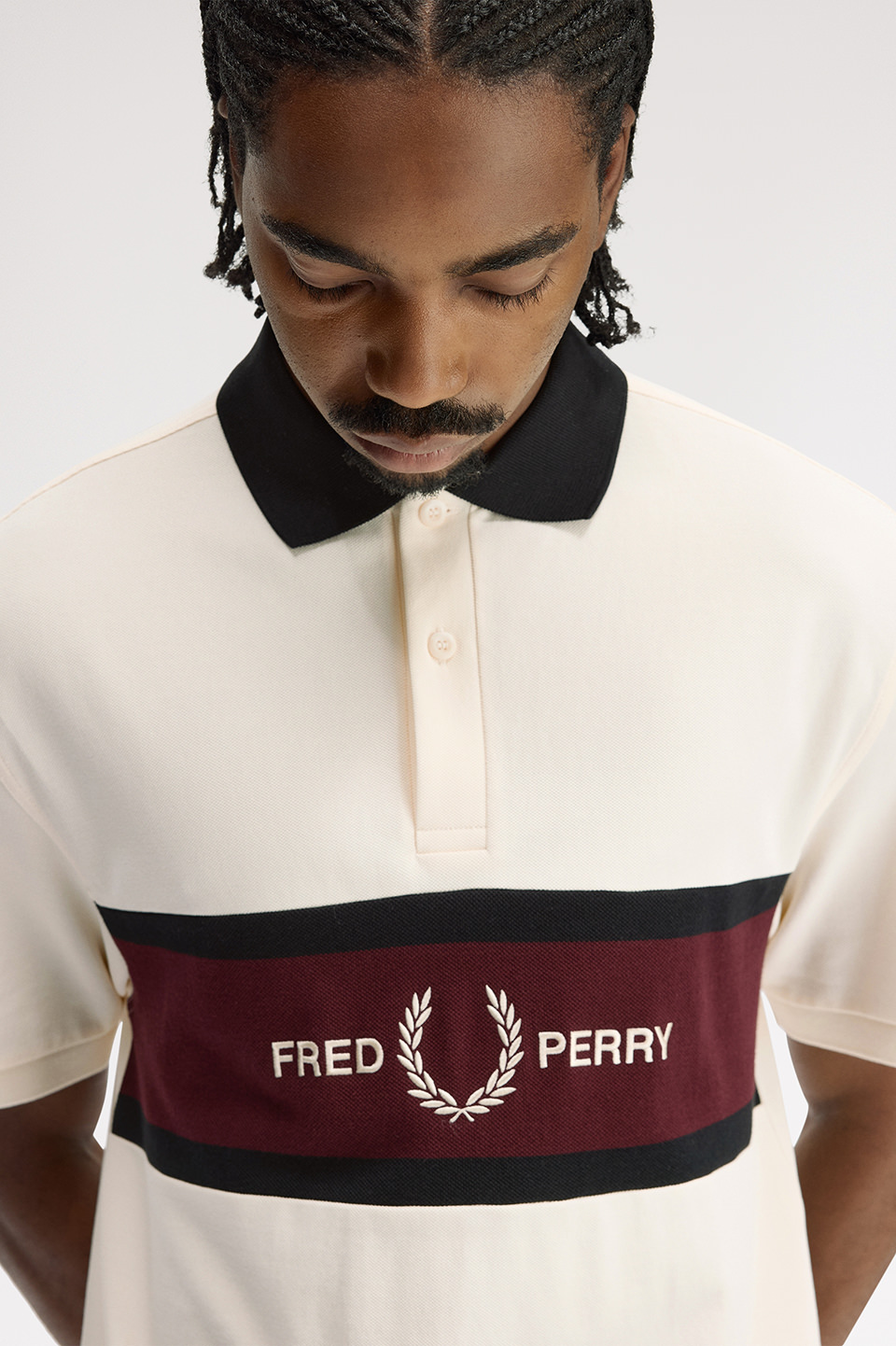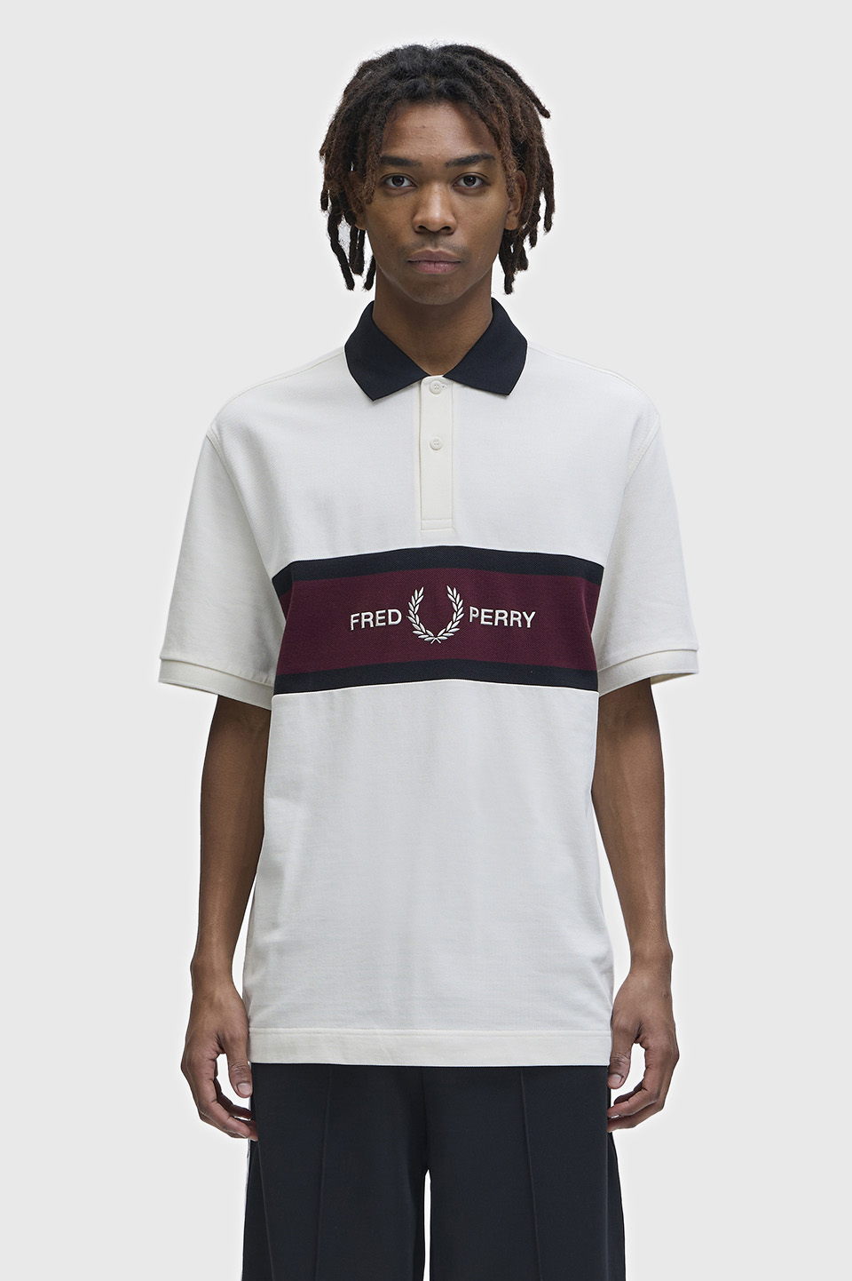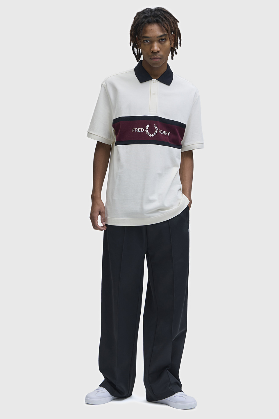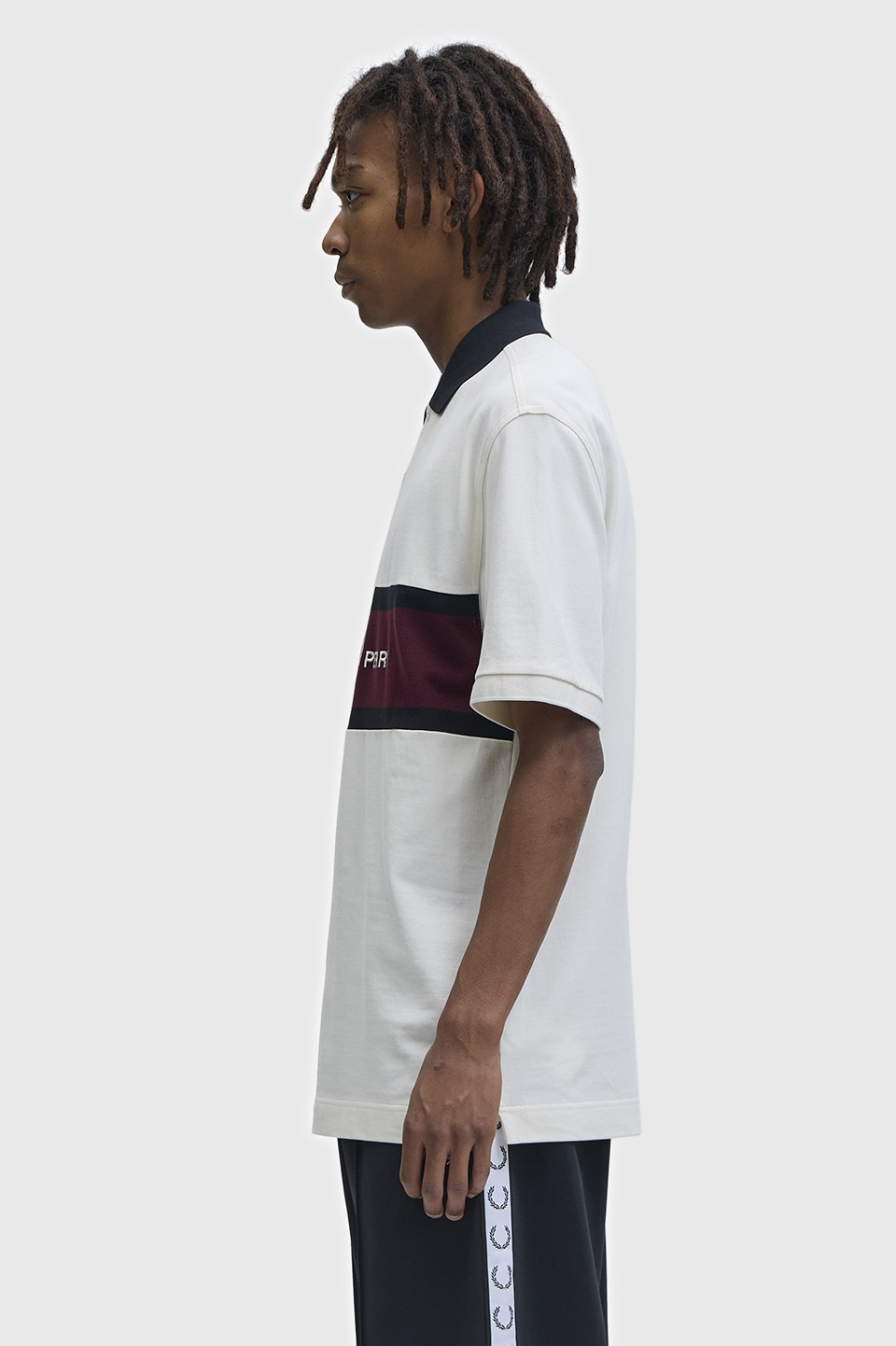 コットン鹿の子素材を使用した、リラックス感のあるポロシャツ。フロントにコントラストの効いたパネルデザインをあしらい、スポーツウェアの要素を取り入れています。