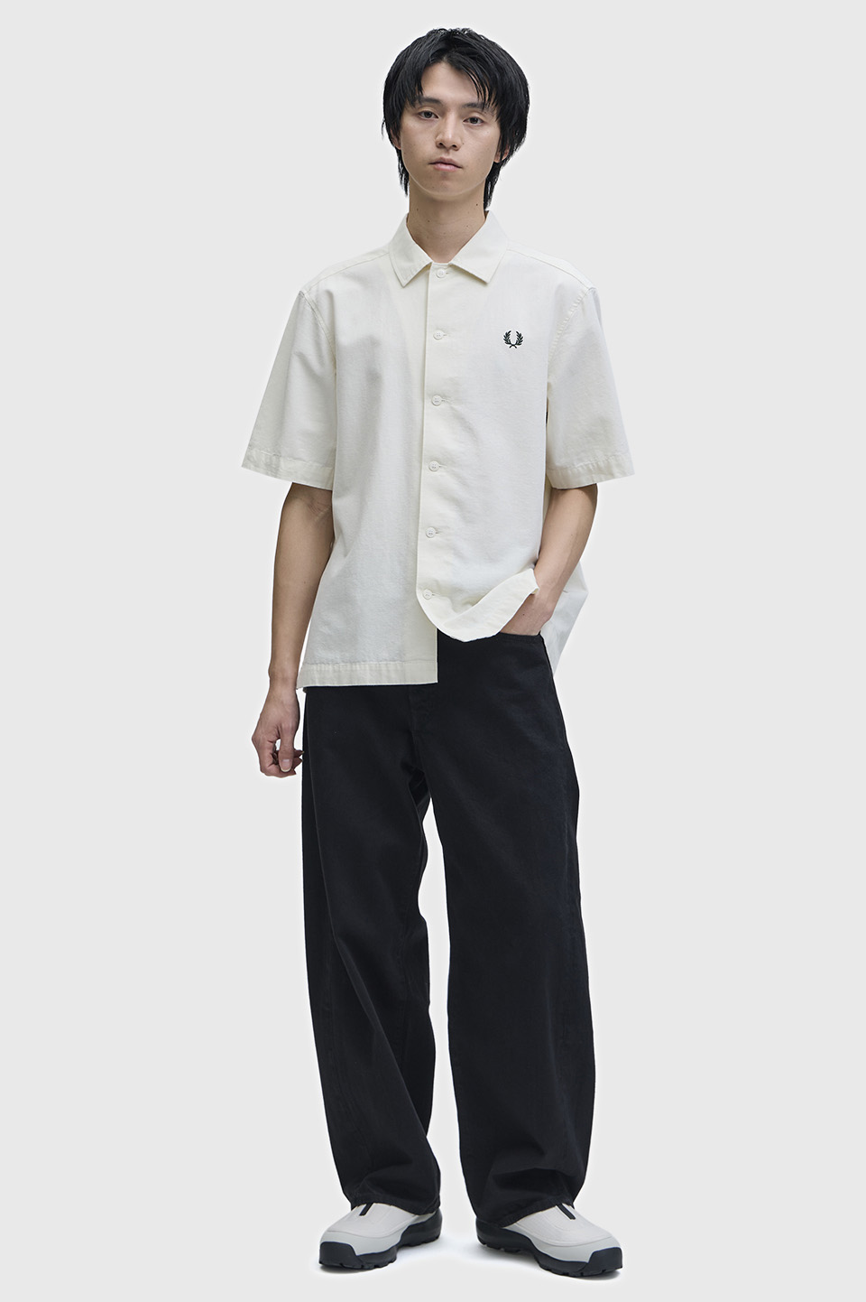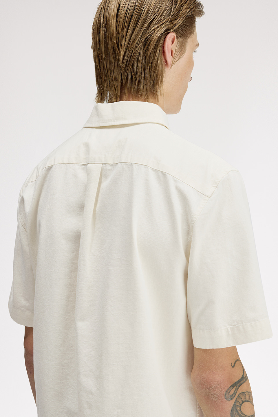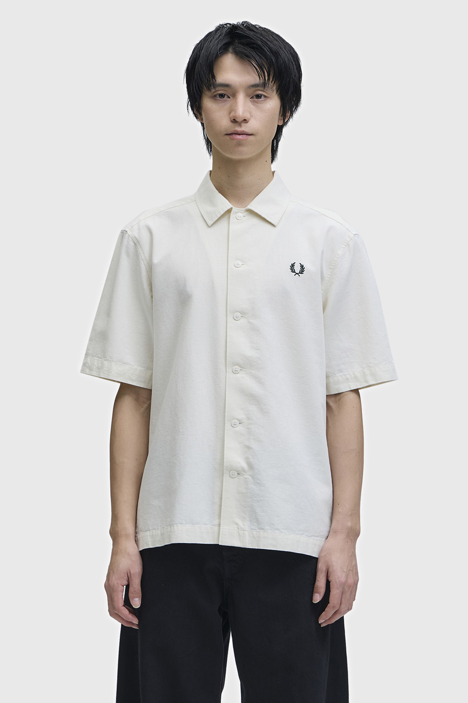 ヘビーオックス素材の半袖シャツ。ムラ糸による表面の凹凸と製品洗いにより表面に表情が生まれ涼し気な印象です。前立て無しのシャープなスタイルです。