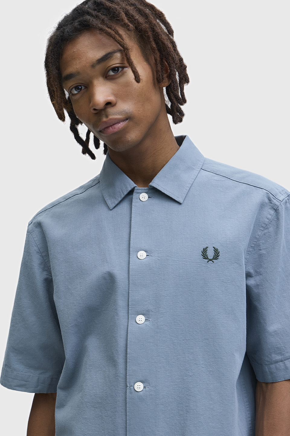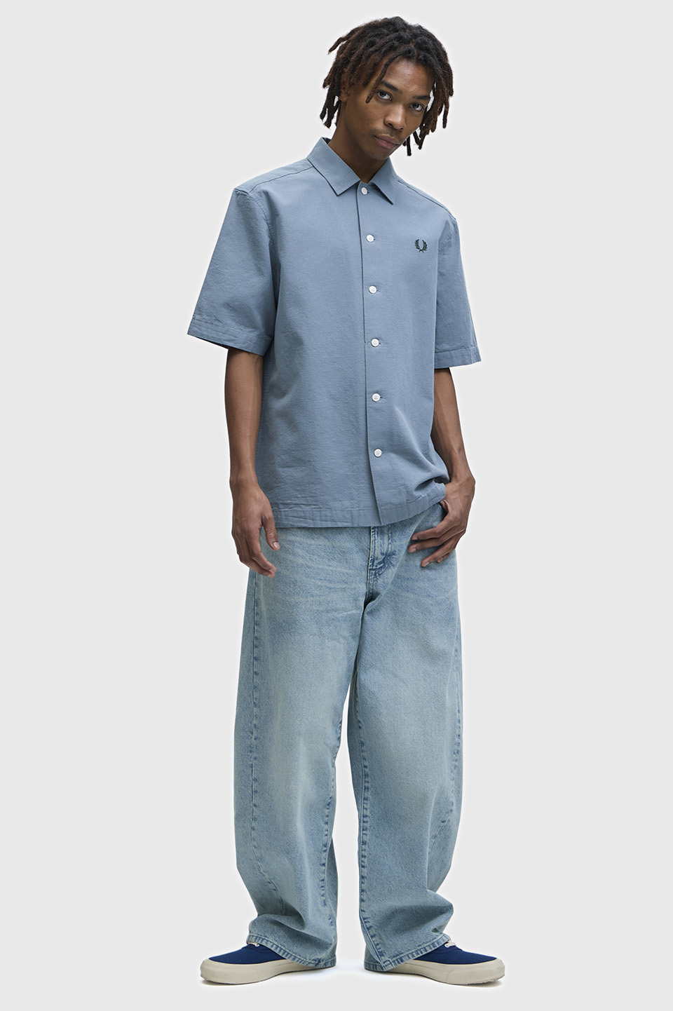 ヘビーオックス素材の半袖シャツ。ムラ糸による表面の凹凸と製品洗いにより表面に表情が生まれ涼し気な印象です。前立て無しのシャープなスタイルです。