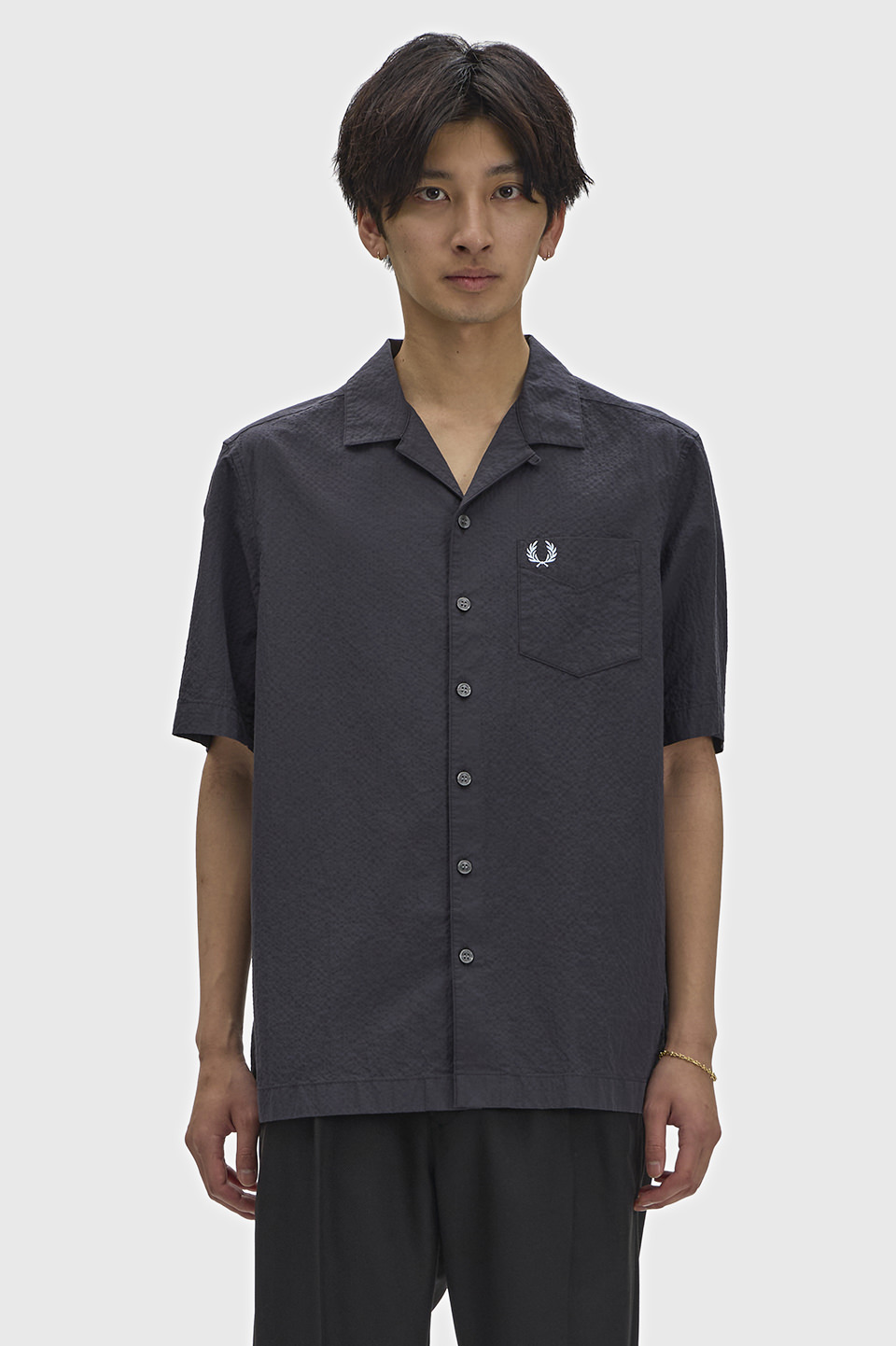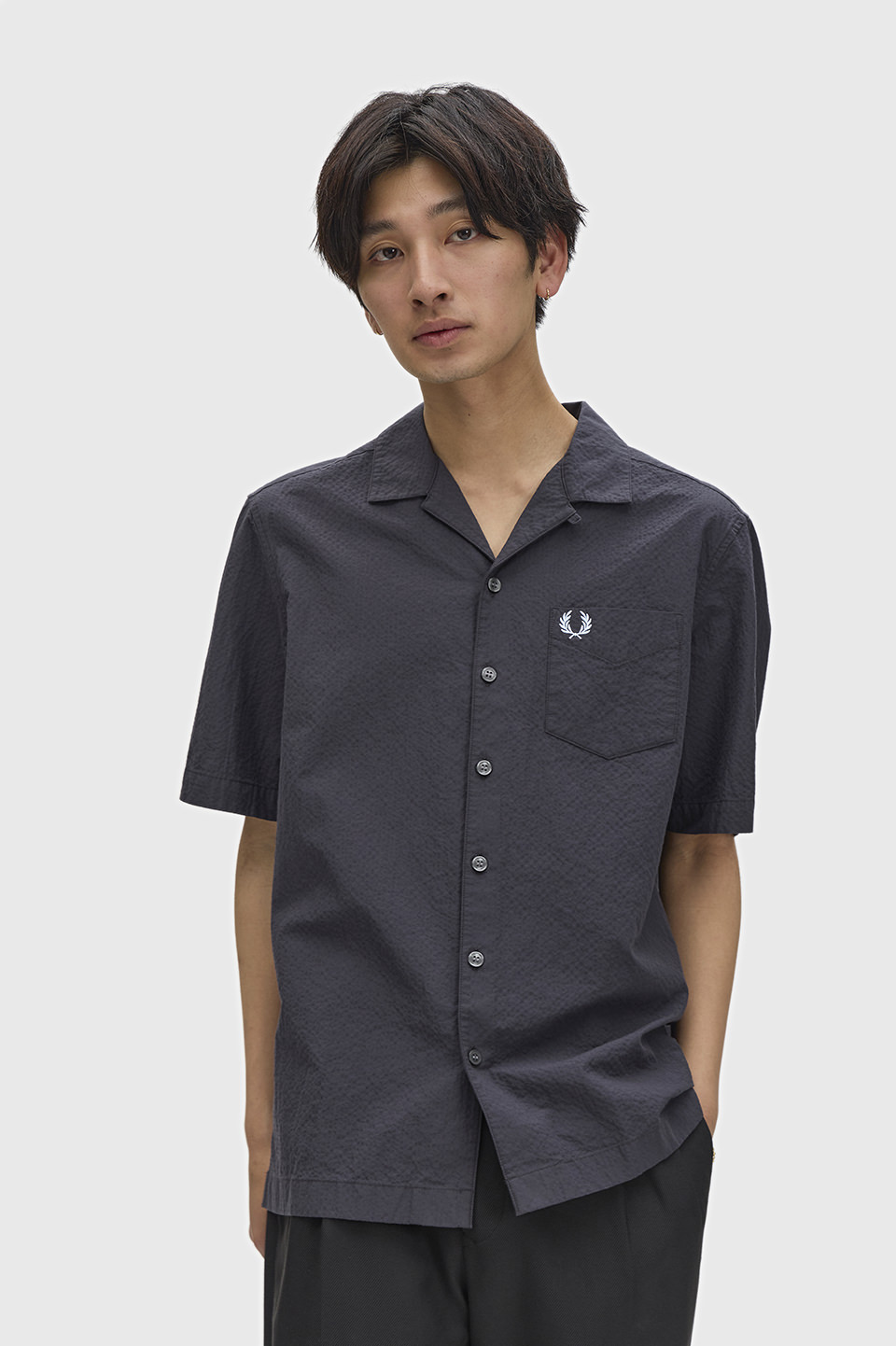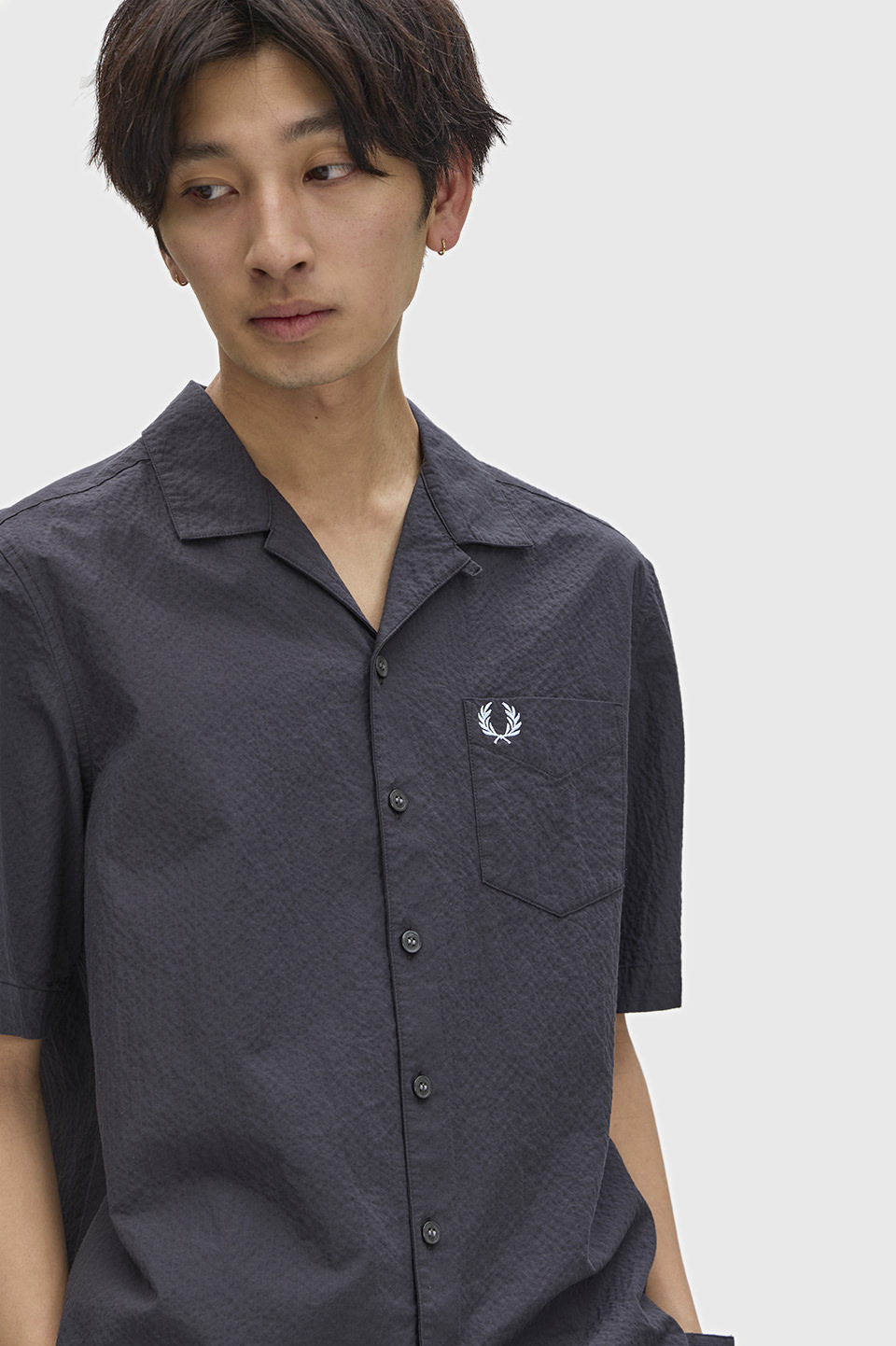 コットンシアサッカーを使用したリオープンカラーシャツ。台衿や前立てのないデザインで、夏に最適なカジュアルシャツです。生地に凹凸があり、肌離れがよく、涼しげな着心地が特徴です。便利な胸ポケット付きです。
