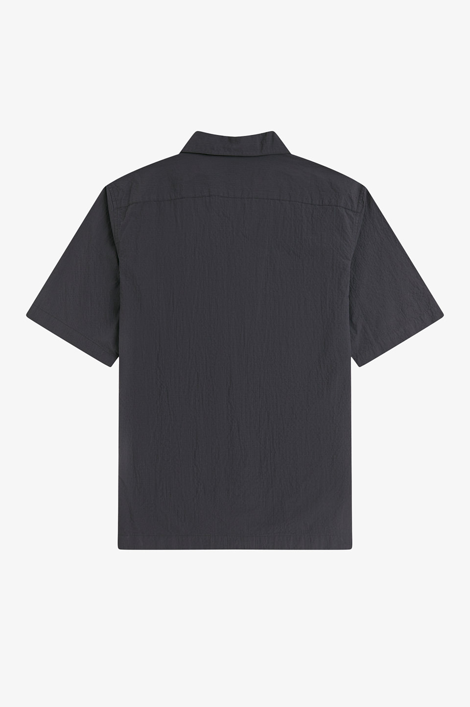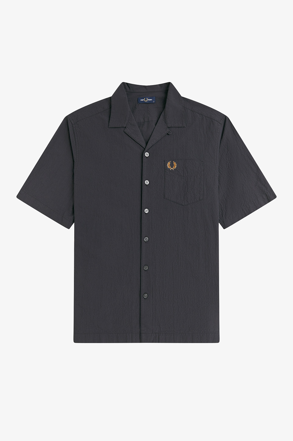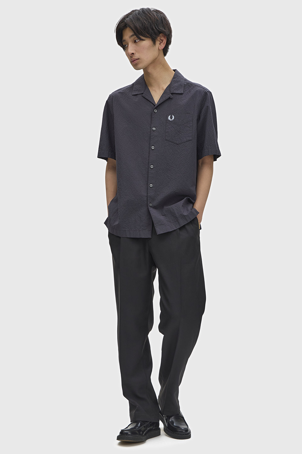 コットンシアサッカーを使用したリオープンカラーシャツ。台衿や前立てのないデザインで、夏に最適なカジュアルシャツです。生地に凹凸があり、肌離れがよく、涼しげな着心地が特徴です。便利な胸ポケット付きです。