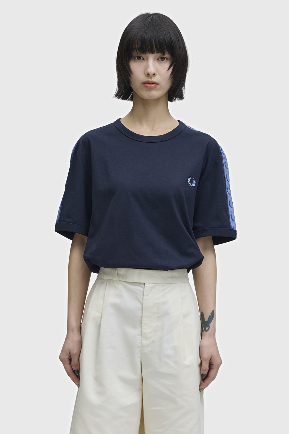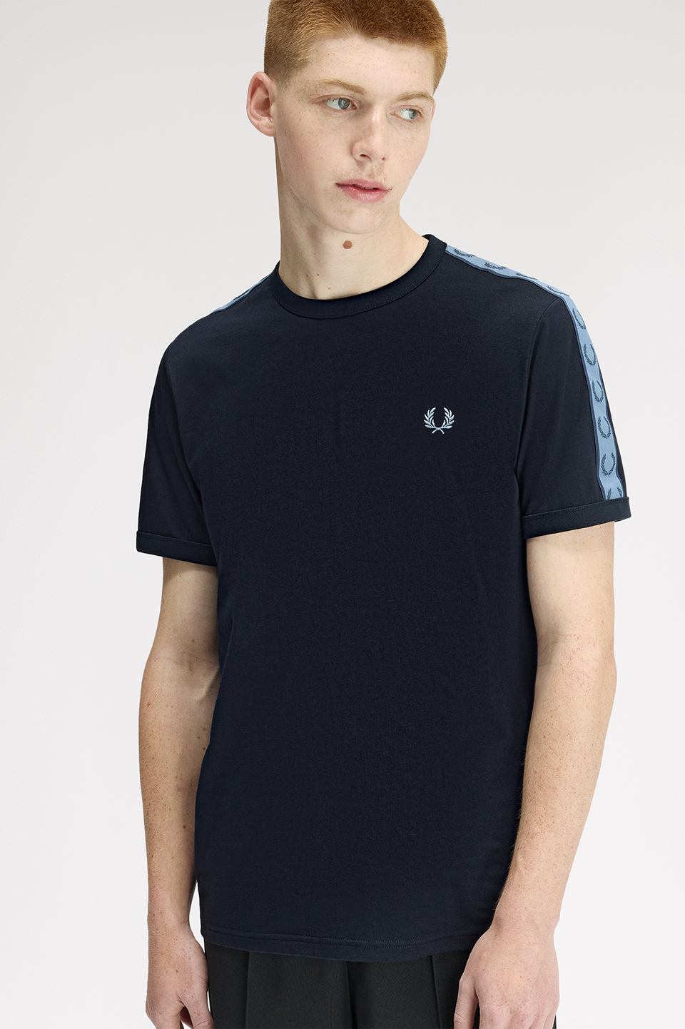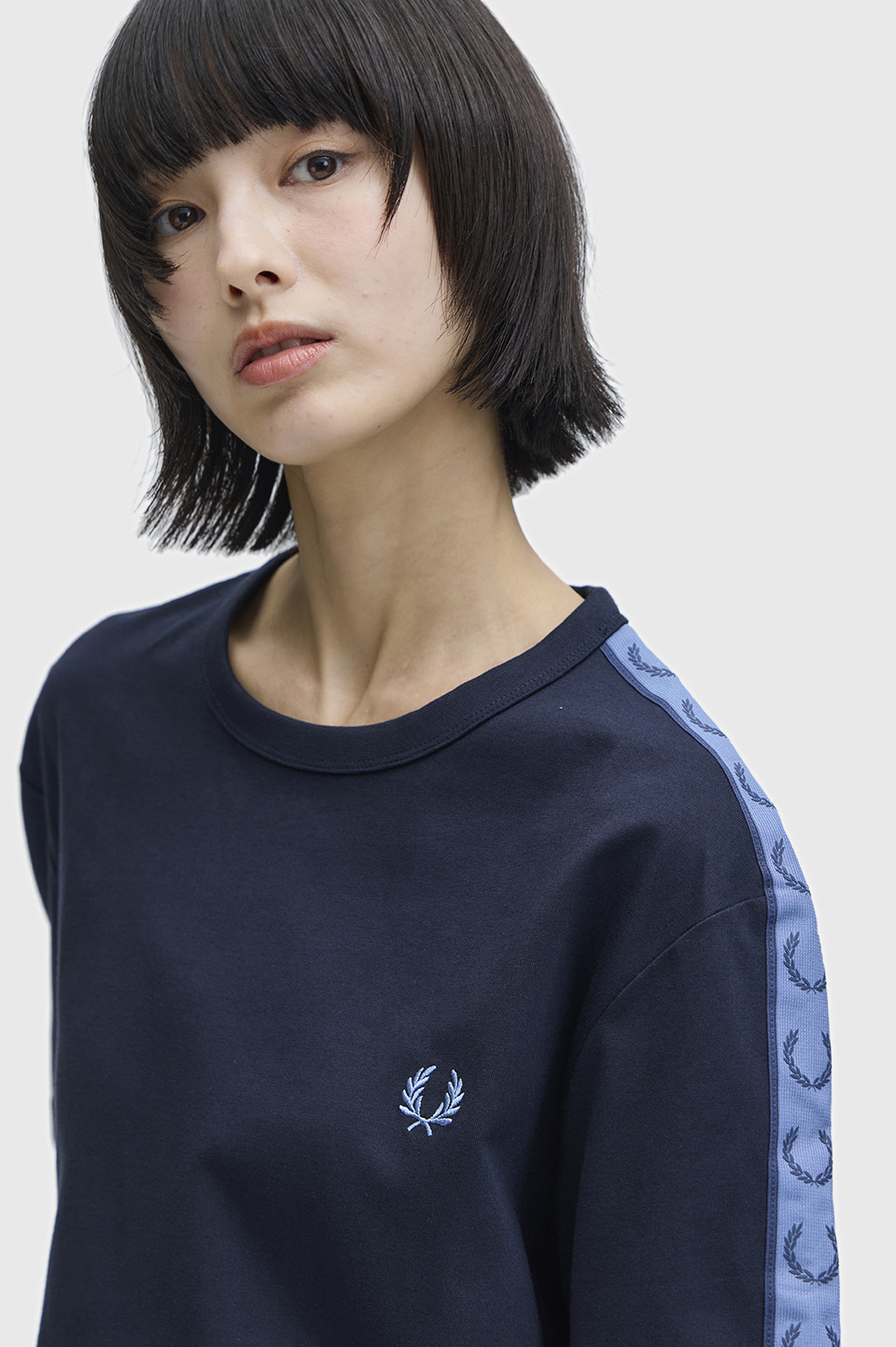コットン100%のきれいめな細番手の糸を高密度で編み立てたソフトでリッチな素材のリンガーTシャツ。袖部分にはローレルリースデザインのテープをあしらい仕上げています。