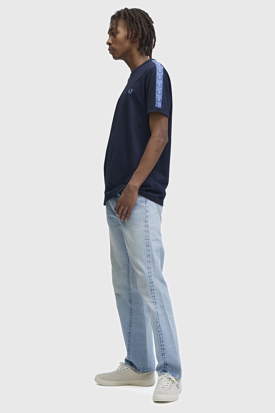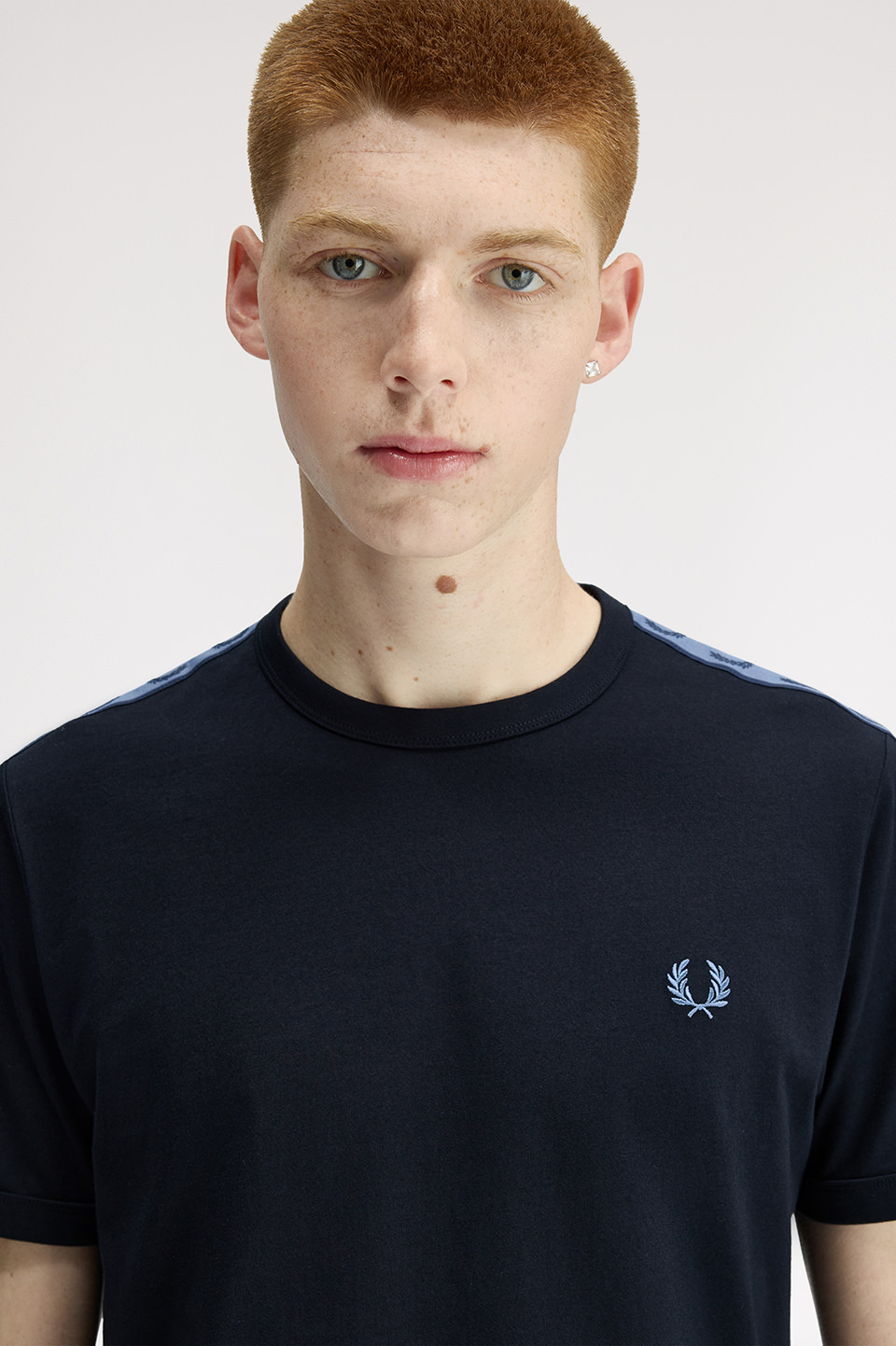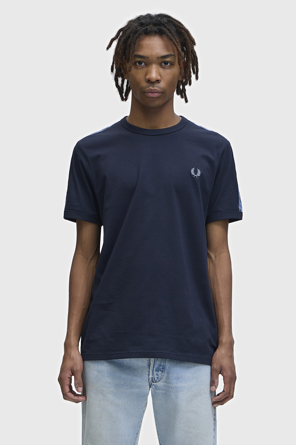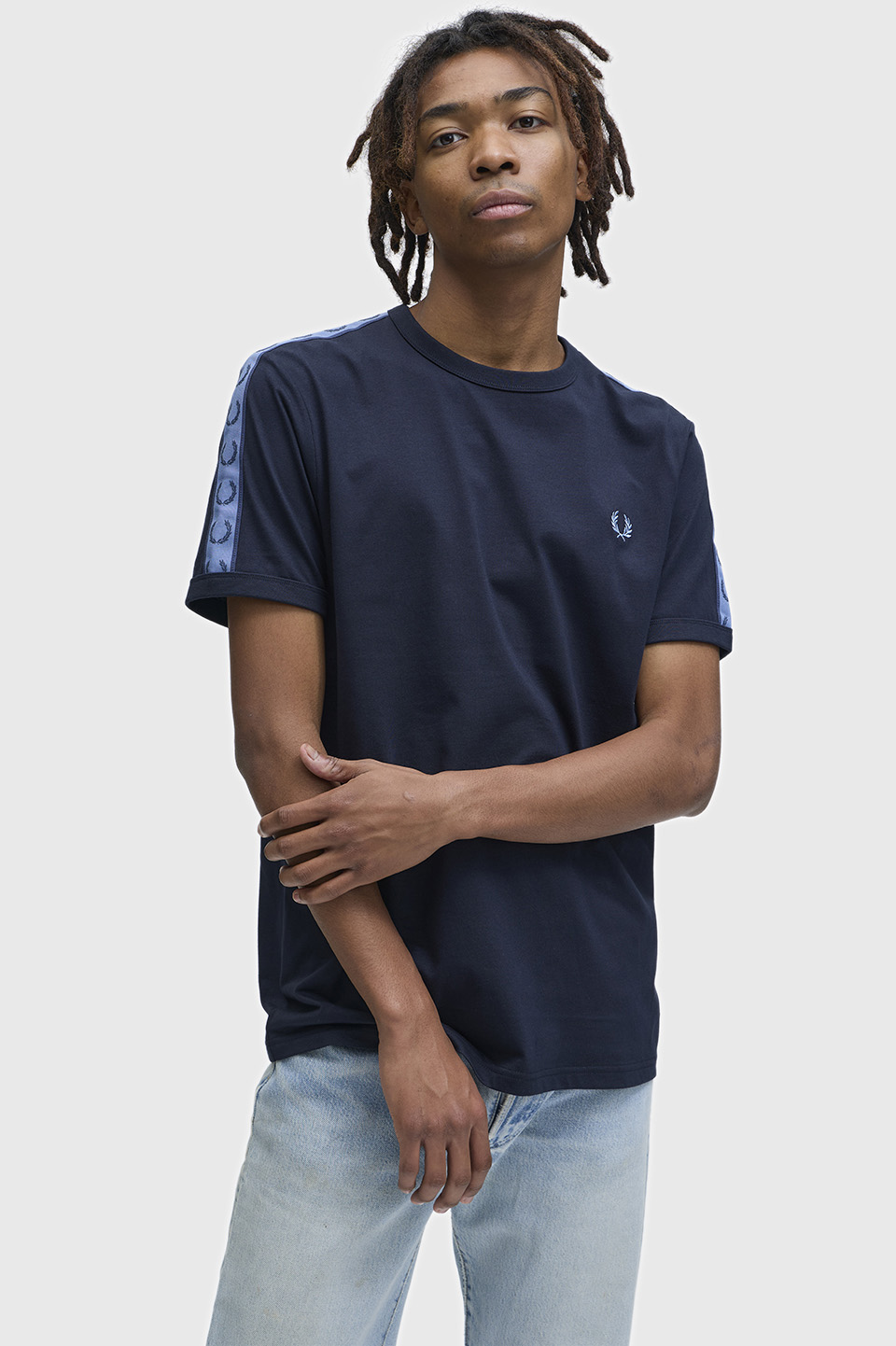 コットン100%のきれいめな細番手の糸を高密度で編み立てたソフトでリッチな素材のリンガーTシャツ。袖部分にはローレルリースデザインのテープをあしらい仕上げています。