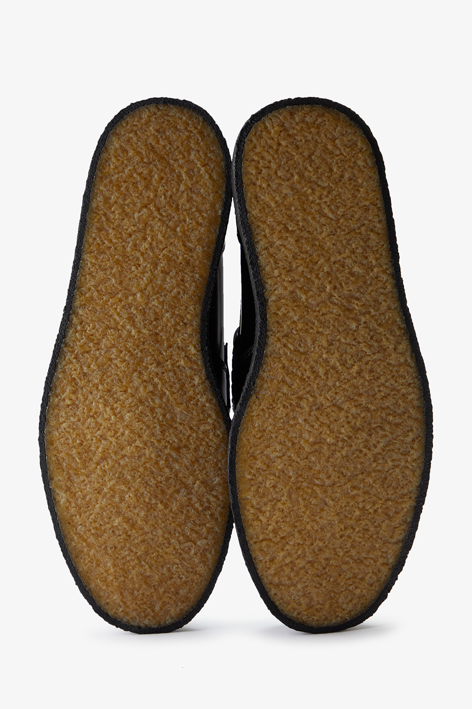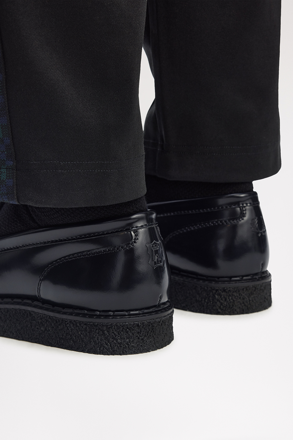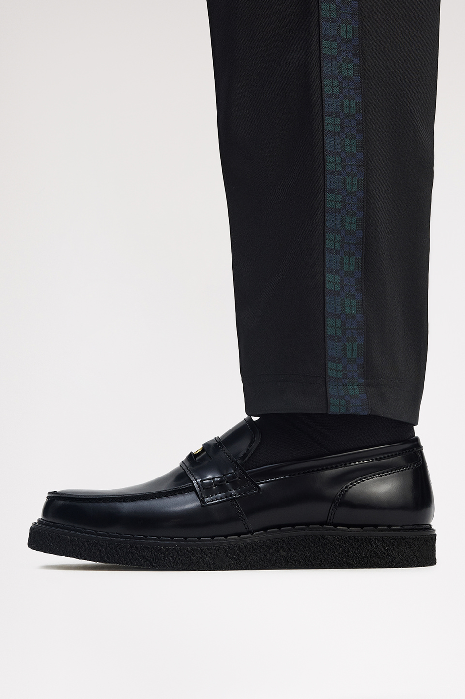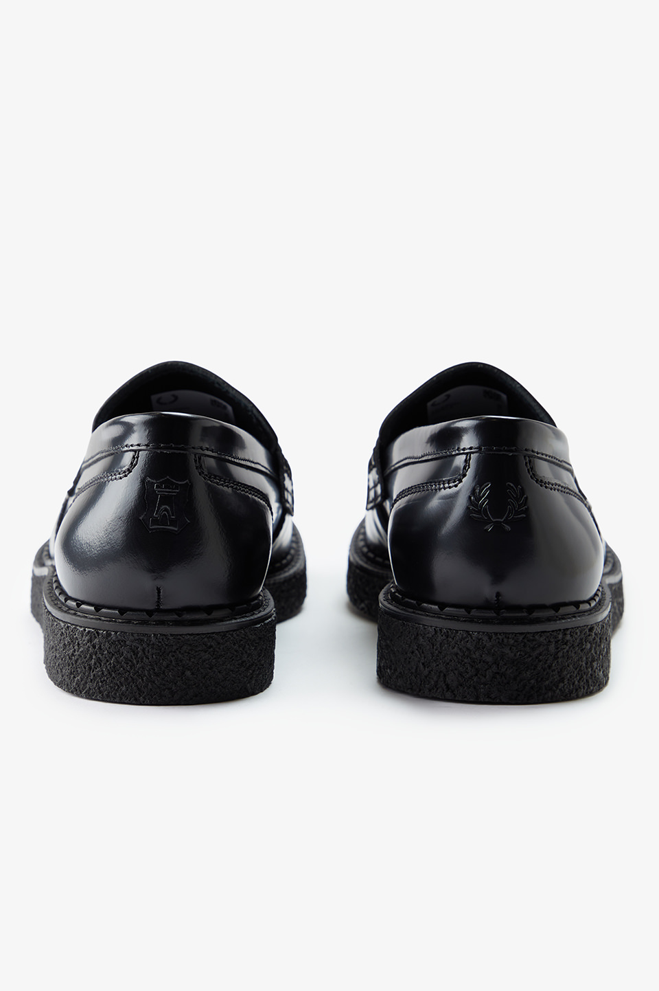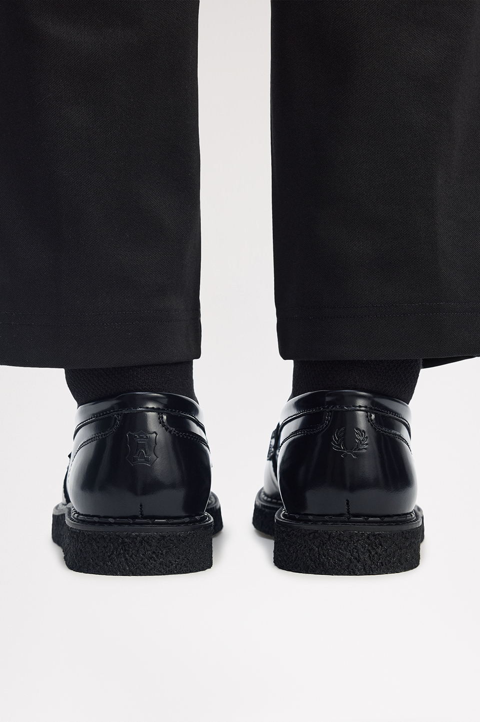 アイコニックな英国のシューズメーカー、ジョージコックスとのコラボレーション。シグニチャーであるクレープ素材の風合いを持つソールを組み合わせ、フル・グレインレザーを使用したペニーローファーです。インソールにはジョージコックスとフレッドペリーの刻印が入った特別仕様。
