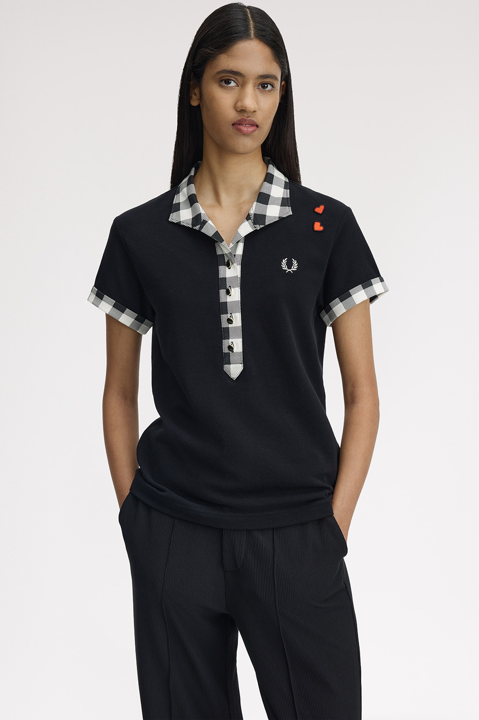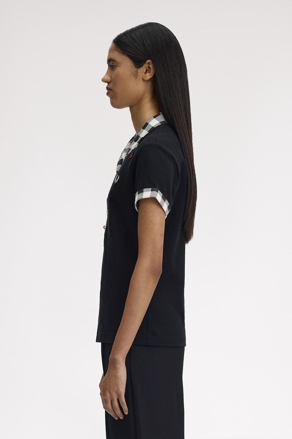 のレンズを通したコレクションを展開します。Vネックの襟と前立て、ロールアップした袖先にチェック柄をプリントした